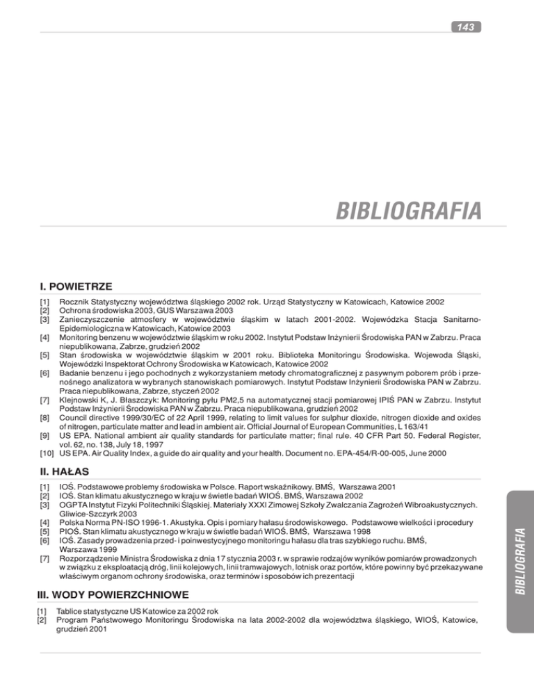 143 BIBLIOGRAFIA I. POWIETRZE [1] [2] [3] Rocznik Statystyczny województwa œl¹skiego 2002 rok. Urz¹d Statystyczny w Katowicach, Katowice 2002 Ochrona œrodowiska 2003, GUS Warszawa 2003 Zanieczyszczenie atmosfery w województwie œl¹skim w latach 2001-2002. Wojewódzka Stacja SanitarnoEpidemiologiczna w Katowicach, Katowice 2003 [4] Monitoring benzenu w województwie œl¹skim w roku 2002. Instytut Podstaw In¿ynierii Œrodowiska PAN w Zabrzu. Praca niepublikowana, Zabrze, grudzieñ 2002 [5] Stan œrodowiska w województwie œl¹skim w 2001 roku. Biblioteka Monitoringu Œrodowiska. Wojewoda Œl¹ski, Wojewódzki Inspektorat Ochrony Œrodowiska w Katowicach, Katowice 2002 [6] Badanie benzenu i jego pochodnych z wykorzystaniem metody chromatograficznej z pasywnym poborem prób i przenoœnego analizatora w wybranych stanowiskach pomiarowych. Instytut Podstaw In¿ynierii Œrodowiska PAN w Zabrzu. Praca niepublikowana, Zabrze, styczeñ 2002 [7] Klejnowski K, J. B³aszczyk: Monitoring py³u PM2,5 na automatycznej stacji pomiarowej IPIŒ PAN w Zabrzu. Instytut Podstaw In¿ynierii Œrodowiska PAN w Zabrzu. Praca niepublikowana, grudzieñ 2002 [8] Council directive 1999/30/EC of 22 April 1999, relating to limit values for sulphur dioxide, nitrogen dioxide and oxides of nitrogen, particulate matter and lead in ambient air. Official Journal of European Communities, L 163/41 [9] US EPA. National ambient air quality standards for particulate matter; final rule. 40 CFR Part 50. Federal Register, vol. 62, no. 138, July 18, 1997 [10] US EPA. Air Quality Index, a guide do air quality and your health. Document no. EPA-454/R-00-005, June 2000 [1] [2] [3] [4] [5] [6] [7] IOŒ. Podstawowe problemy œrodowiska w Polsce. Raport wskaŸnikowy. BMŒ, Warszawa 2001 IOŒ. Stan klimatu akustycznego w kraju w œwietle badañ WIOŒ. BMŒ, Warszawa 2002 OGPTA Instytut Fizyki Politechniki Œl¹skiej. Materia³y XXXI Zimowej Szko³y Zwalczania Zagro¿eñ Wibroakustycznych. Gliwice-Szczyrk 2003 Polska Norma PN-ISO 1996-1. Akustyka. Opis i pomiary ha³asu œrodowiskowego. Podstawowe wielkoœci i procedury PIOŒ. Stan klimatu akustycznego w kraju w œwietle badañ WIOŒ. BMŒ, Warszawa 1998 IOŒ. Zasady prowadzenia przed- i poinwestycyjnego monitoringu ha³asu dla tras szybkiego ruchu. BMŒ, Warszawa 1999 Rozporz¹dzenie Ministra Œrodowiska z dnia 17 stycznia 2003 r. w sprawie rodzajów wyników pomiarów prowadzonych w zwi¹zku z eksploatacj¹ dróg, linii kolejowych, linii tramwajowych, lotnisk oraz portów, które powinny byæ przekazywane w³aœciwym organom ochrony œrodowiska, oraz terminów i sposobów ich prezentacji III. WODY POWIERZCHNIOWE [1] [2] Tablice statystyczne US Katowice za 2002 rok Program Pañstwowego Monitoringu Œrodowiska na lata 2002-2002 dla województwa œl¹skiego, WIOŒ, Katowice, grudzieñ 2001 BIBLIOGRAFIA II. HA£AS 144 [3] [4] [5] [6] [7] [8] [9] Raport „Monitoring Ÿróde³ zanieczyszczeñ wód powierzchniowych p³yn¹cych wyloty œcieków nieoczyszczonych”, OBiKŒ.PP, Katowice, styczeñ 2002 Raport z wykonanych w 2002 roku badañ Ÿróde³ zanieczyszczeñ powierzhniowych wód p³yn¹cych wyloty œcieków nieoczyszczonych, OBiKŒ.PP, Katowice, kwiecieñ 2003 „Wskazówki metodyczne do projektowania regionalnego monitoringu wód powierzchniowych p³yn¹cych”, Biblioteka Monitoringu Œrodowiska, Warszawa 1994 Protokó³ z 10 narady polsko-czeskiej grupy roboczej do spraw ochrony wód granicznych przed zanieczyszczeniem Atlas geochemiczny Górnego Sl¹ska, PIG, Warszawa 1995 Wyniki monitoringu geochemicznego osadów wodnych w Polsce w latach 1998-1999, BMŒ Warszawa 2000 PIOŒ, Wytyczne monitoringu podstawowego jezior IV. WODY PODZIEMNE [1] [2] [3] PIG, Sprawozdanie z prac pt. Monitoring jakoœci wód podziemnych w sieci krajowej w 2001 roku. Warszawa 2001 PIG, Sprawozdanie z prac pt. Monitoring jakoœci wód podziemnych w sieci krajowej w 2002 roku. Warszawa 2002 Witkowski A. i in., Regionalny monitoring jakoœci wód podziemnych na obszarze województwa œl¹skiego. Raport z wykonanych w 2001 roku badañ w punktach obserwacyjnych zlokalizowanych w centralnej i po³udniowej czêœci województwa œl¹skiego. (niepublikowane) Arch. WIOŒ Katowice [4] Witkowski A. i in., Regionalny monitoring jakoœci wód podziemnych na obszarze województwa œl¹skiego. Raport z opróbowania punktów obserwacyjnych by³ego RZGW w Katowicach oraz punktów sieci uzupe³niaj¹cej wykonanego w 2002 roku. (niepublikowane) Arch. WIOŒ Katowice [5] PIOŒ, Program monitoringu œrodowiska na lata 1998 2002. Bibl. Mon. Œrod. Warszawa 1998 [6] Witczak S., Adamczyk A., Katalog wybranych fizycznych i chemicznych wskaŸników zanieczyszczeñ wód podziemnych i metod ich oznaczania. Bibl. Monit. Œrod. PIOŒ 1 i 2. Warszawa: 1994, 1995 [7] Macioszczyk A., Hydrogeochemia. Wyd. Geol. Warszawa: 1987 [8] Rozporz¹dzenie Ministra Zdrowia z dnia 19 listopada 2002 w sprawie wymagañ jakoœci wody przeznaczonej do spo¿ycia przez ludzi (Dz. U. Nr 203, poz. 1718) [9] Rozporz¹dzenie Rady Ministrów z dnia 10 grudnia 2002 w sprawie przebiegu granic obszarów dorzeczy, przyporz¹dkowania zbiorników wód podziemnych do w³aœciwych obszarów dorzeczy, utworzenia regionalnych zarz¹dów gospodarki wodnej oraz podzia³ów obszarów dorzeczy na regiony wodne (Dz. U. Nr 232, poz. 1953) [10] Kleczkowski A. S. (red.), Mapa obszarów g³ównych zbiorników wód podziemnych (GZWP) w Polsce wymagaj¹cych szczególnej ochrony w skali 1:500000. Wyd. AGH, Kraków 1990 [11] Paczyñski B., Atlas hydrogeologiczny Polski, 1:500 000, Cz. I, Systemy zwyk³ych wód podziemnych. Wyd. Polska Ag. Ekol., Warszawa 1993