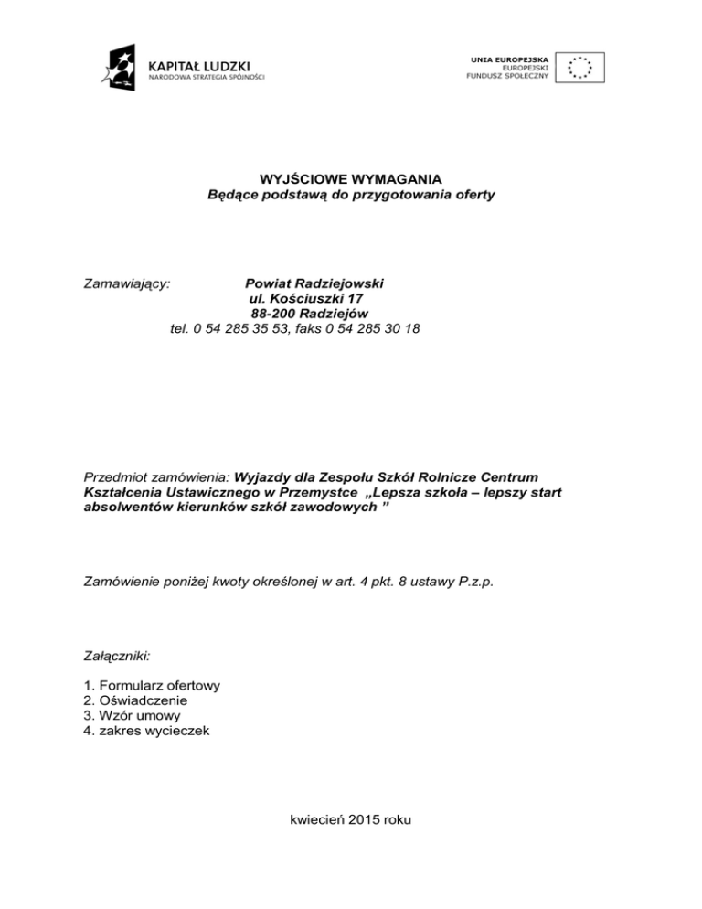 WYJŚCIOWE WYMAGANIA Będące podstawą do przygotowania oferty Zamawiający: Powiat Radziejowski ul. Kościuszki 17 88-200 Radziejów tel. 0 54 285 35 53, faks 0 54 285 30 18 Przedmiot zamówienia: Wyjazdy dla Zespołu Szkół Rolnicze Centrum Kształcenia Ustawicznego w Przemystce „Lepsza szkoła – lepszy start absolwentów kierunków szkół zawodowych ” Zamówienie poniżej kwoty określonej w art. 4 pkt. 8 ustawy P.z.p. Załączniki: 1. Formularz ofertowy 2. Oświadczenie 3. Wzór umowy 4. zakres wycieczek kwiecień 2015 roku WYMAGANIA WYJŚCIOWE STANOWIĄCE PODSTAWĘ DO PRZYGOTOWANIA OFERTY Zamawiający: Powiat Radziejowski ul. Kościuszki 17 88-200 Radziejów 1. Opis przedmiotu zamówienia. Przedmiotem zamówienia są – Żywe lekcje przedsiębiorczości, wizyty w przedsiębiorstwach przybliżające możliwość poznania specyfiki pracy w różnych branżach, zawodach, prezentowanie organizacji i funkcjonowania przedsiębiorstwa w rzeczywistych warunkach pracy oraz przybliżenie specyfiki pracy różnych branżach na terenie województwa kujawsko – pomorskiego zaplanowane w ramach projektu „Lepsza szkoła – lepszy start absolwentów kierunków szkół zawodowych” w ramach Działania 9.2 Programu Operacyjnego Kapitał Ludzki. dla Zespołu Szkół Rolnicze Centrum Kształcenia Ustawicznego w Przemystce. Zakres usługi określony w załączniku nr 4 do niniejszych wymagań. Zamówienia nie można realizować w częściach. Zamawiający przewiduje / nie przewiduje usług uzupełniających. 2. Wymagany termin wykonania zamówienia: od podpisania umowy do 15 czerwca 2015 roku . 3. Opis warunków udziału w postępowaniu: Oferent spełnia warunki: - Oferent posiada uprawnienia do wykonywania działalności objętej przedmiotem zamówienia. - Oferent zapewni wykonanie zamówienia zgodnie z opisem zawartym w punkcie I . - Nie spełnienie któregokolwiek ze wskazanych wyżej warunków i wymogów skutkować będzie odrzuceniem oferty. - Nie spełnienie któregokolwiek ze wskazanych wyżej warunków i wymogów skutkować będzie odrzuceniem oferty. 4. Wyjaśnienia dotyczące wyjściowych wymagań - wyjaśnienia udzielane będą min. 3 dni przed terminem składania ofert. W niniejszym postępowaniu wszelkie oświadczenia, wnioski, zawiadomienia oraz informacje Zamawiający i Oferenci przekazują pisemnie, faksem. W przypadku oświadczeń, wniosków, zawiadomień lub informacji przekazywanych faksem, każda ze stron na żądanie drugiej niezwłocznie potwierdza fakt ich otrzymania. 5. Osoby uprawnione do kontaktu z Wykonawcami: Osoby upoważnione do kontaktu z Wykonawcami: Pani - Sylwia Radzimska – Kubisiak Pani – Ewa Brzezińska 6.Termin związania ofertą. Oferenci składający oferty będą związani złożonymi przez siebie ofertami przez 30 dni. Bieg terminu związania ofertą rozpoczyna się wraz z upływem terminu składania ofert. 7. Opis sposobu przygotowywania oferty. 7.1.Oferent może złożyć tylko jedną ofertę. 7.2.Oferenci mogą wspólnie ubiegać się o udzielenie zamówienia. W takim przypadku Oferenci ustanawiają pełnomocnika do reprezentowania ich w postępowaniu o udzielenie zamówienia albo reprezentowania w postępowaniu i zawarcia umowy. 7.3. Oferta wraz ze stanowiącymi jej integralną część załącznikami musi być sporządzona przez Oferenta ściśle według postanowień niniejszych wymagań. 7.4. Oferta musi być sporządzona według wzoru formularza oferty stanowiącego załącznik do niniejszych wymagań. 7.5. Oferta musi być napisana w języku polskim, na komputerze, maszynie do pisania lub ręcznie długopisem bądź niezmywalnym atramentem. 7.6. Proponuje się, aby wszystkie zapisane strony oferty wraz z załącznikami były kolejno ponumerowane i złączone w sposób trwały oraz na każdej stronie podpisane przez osobę ( osoby ) uprawnione do składania oświadczeń woli w imieniu Oferenta, przy czym co najmniej na pierwszej i ostatniej stronie oferty podpis ( podpisy ) był opatrzony pieczęcią imienną Oferenta. Pozostałe strony mogą być parafowane. 7.7. Wszelkie poprawki lub zmiany w tekście oferty muszą być parafowane przez osobę( osoby ) podpisujące ofertę i opatrzone datami ich dokonania. 7.8. Do oferty należy dołączyć następujące dokumenty i oświadczenia: a/ aktualny odpis z właściwego rejestru, jeżeli przepisy wymagają wpisu do rejestru. b/ oświadczenie, o którym mowa w załączniku nr 2 c/ zezwolenie na organizowanie wycieczek Wskazane w punkcie a/ - c/ dokumenty mogą być doręczone w formie oryginałów lub kserokopii poświadczonych za zgodność z oryginałem przez Oferenta. Zamawiający może zażądać przedstawienia oryginałów lub notarialnie potwierdzonych kopii dokumentów. Jeżeli w określonym terminie Oferent nie złoży oświadczeń i dokumentów potwierdzających spełnienie warunków udziału w postępowaniu lub jeżeli złoży dokumenty zawierające błędy, Zamawiający wezwie go do ich uzupełnienia w wyznaczonym terminie, chyba że mimo ich uzupełnienia konieczne będzie unieważnienie postępowania. Zamawiający może także w wyznaczonym przez siebie terminie, wezwać do złożenia wyjaśnień dotyczących oświadczeń i dokumentów. 7.9. Oferent umieszcza ofertę w dwóch kopertach oznaczonych nazwą i adresem Starostwa Powiatowego w Radziejowie oraz opisanych w następujący sposób: „ Oferta na wyjazdy dla ZSzRCKU w Przemystce” Na wewnętrznej kopercie należy podać nazwę i adres Oferenta, by umożliwić zwrot nie otwartej oferty w przypadku dostarczenia jej Zamawiającemu po terminie. 7.10. Oferent może wprowadzić zmiany lub wycofać złożoną przez siebie ofertę wyłącznie przed terminem składania ofert i pod warunkiem, że przed upływem tego terminu Zamawiający otrzyma pisemne powiadomienie o wprowadzeniu zmian lub wycofaniu oferty. 7.11. Zamawiający odrzuci ofertę jeżeli: - jej treść nie odpowiada treści wymagań - zawiera błędy, których nie można