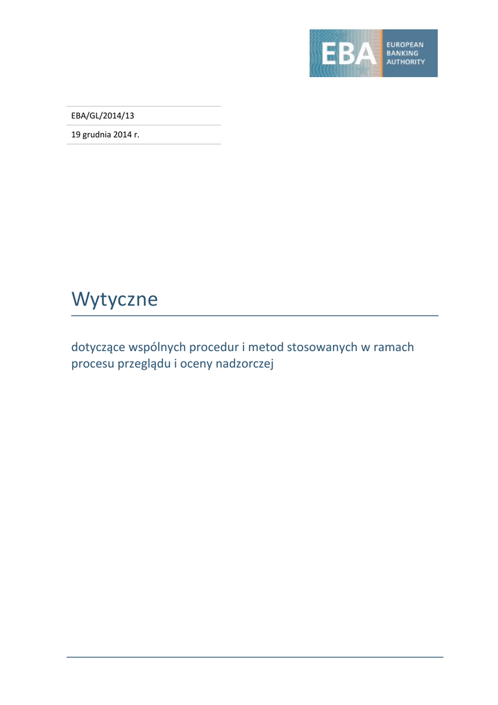 EBA/GL/2014/13 19 grudnia 2014 r. Wytyczne dotyczące wspólnych procedur i metod stosowanych w ramach procesu przeglądu i oceny nadzorczej WYTYCZNE DOTYCZĄCE WSPÓLNYCH PROCEDUR I METOD STOSOWANYCH W RAMACH PROCESU PRZEGLĄDU I OCENY NADZORCZEJ Spis treści Spis treści ................................................................................................................................ 2 Wykaz rysunków i tabel ........................................................................................................... 5 Wytyczne EUNB dotyczące wspólnych procedur i metod stosowanych w ramach procesu przeglądu i oceny nadzorczej ................................................................................................... 1 Status Wytycznych ............................................................................................................................. 1 Wymogi w zakresie sprawozdawczości .............................................................................................. 1 Tytuł 1. Przedmiot, definicje i poziom zastosowania ................................................................. 2 1.1 Przedmiot ..................................................................................................................................... 2 1.2 Definicje........................................................................................................................................ 2 1.3 Poziom stosowania....................................................................................................................... 5 Tytuł 2. Wspólny SREP ............................................................................................................. 6 2.1 Przegląd ram wspólnego SREP ..................................................................................................... 6 2.2 Punktacja w ramach SREP .......................................................................................................... 11 2.3 Rozwiązania organizacyjne......................................................................................................... 13 2.4 Proporcjonalność i zaangażowanie nadzorcze ........................................................................... 13 Tytuł 3. Monitorowanie kluczowych wskaźników ................................................................... 19 Tytuł 4. Analiza modelu biznesowego ..................................................................................... 21 4.1 Względy ogólne .......................................................................................................................... 21 4.2 Wstępna ocena........................................................................................................................... 22 4.3 Określenie obszarów szczególnego zainteresowania analizy modelu biznesowego ................. 23 4.4 Ocena otoczenia biznesowego ................................................................................................... 24 4.5 Analiza bieżącego modelu biznesowego .................................................................................... 25 4.6 Analiza strategii i planów finansowych ...................................................................................... 27 4.7 Ocena rentowności modelu biznesowego ................................................................................. 27 4.8 Ocena realności strategii instytucji ............................................................................................ 28 4.9 Identyfikacja głównych zagrożeń ............................................................................................... 29 4.10 Podsumowanie ustaleń i punktacja ......................................................................................... 29 Tytuł 5. Ocena zarządzania wewnętrznego i mechanizmów kontroli stosowanych w całej instytucji ............................................................................................................................... 33 2 WYTYCZNE DOTYCZĄCE WSPÓLNYCH PROCEDUR I METOD STOSOWANYCH W RAMACH PROCESU PRZEGLĄDU I OCENY NADZORCZEJ 5.1 Względy ogólne .......................................................................................................................... 33 5.2 Ogólne ramy zarządzania wewnętrznego .................................................................................. 34 5.3 Kultura korporacyjna i kultura ryzyka ........................................................................................ 34 5.4 Struktura i funkcjonowanie organu zarządzającego .................................................................. 35 5.5 Polityka i praktyki w zakresie wynagrodzeń............................................................................... 36 5.6 Ramy zarządzania ryzykiem........................................................................................................ 37 5.7 Ramy kontroli wewnętrznej ....................................................................................................... 41 5.8 Systemy informacyjne i ciągłość działania ................................................................................. 42 5.9 Planowanie naprawy .................................................................................................................. 43 5.10 Stosowanie na poziomie skonsolidowanym i konsekwencje dla podmiotów grupy ............... 43 5.11 Podsumowanie ustaleń i punktacja ......................................................................................... 44 Tytuł 6. Ocena ryzyk obciążających kapitał ............................................................................. 49 6.1 Względy ogólne .......................................................................................................................... 49 6.2 Ocena ryzyka kredytowego i ryzyka kontrahenta ..............................