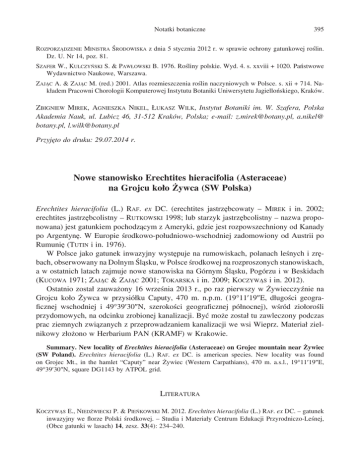 Notatki botaniczne 395 Rozporządzenie Ministra Środowiska z dnia 5 stycznia 2012 r. w sprawie ochrony gatunkowej roślin. Dz. U. Nr 14, poz. 81. Szafer W., Kulczyński S. & Pawłowski B. 1976. Rośliny polskie. Wyd. 4. s. xxviii + 1020. Państwowe Wydawnictwo Naukowe, Warszawa. Zając A. & Zając M. (red.) 2001. Atlas rozmieszczenia roślin naczyniowych w Polsce. s. xii + 714. Nakładem Pracowni Chorologii Komputerowej Instytutu Botaniki Uniwersytetu Jagiellońskiego, Kraków. Zbigniew Mirek, Agnieszka Nikel, Łukasz Wilk, Instytut Botaniki im. W. Szafera, Polska Akademia Nauk, ul. Lubicz 46, 31-512 Kraków, Polska; e-mail: [email protected], a.nikel@ botany.pl, [email protected] Przyjęto do druku: 29.07.2014 r. Nowe stanowisko Erechtites hieracifolia (Asteraceae) na Grojcu koło Żywca (SW Polska) Erechtites hieracifolia (L.) Raf. ex DC. (erechtites jastrzębcowaty – Mirek i in. 2002; erechtites jastrzębcolistny – Rutkowski 1998; lub starzyk jastrzębcolistny – nazwa proponowana) jest gatunkiem pochodzącym z Ameryki, gdzie jest rozpowszechniony od Kanady po Argentynę. W Europie środkowo-południowo-wschodniej zadomowiony od Austrii po Rumunię (Tutin i in. 1976). W Polsce jako gatunek inwazyjny występuje na rumowiskach, polanach leśnych i zrębach, obserwowany na Dolnym Śląsku, w Polsce środkowej na rozproszonych stanowiskach, a w ostatnich latach zajmuje nowe stanowiska na Górnym Śląsku, Pogórzu i w Beskidach (Kucowa 1971; Zając & Zając 2001; Tokarska i in. 2009; Koczywąs i in. 2012). Ostatnio został zauważony 16 września 2013 r., po raz pierwszy w Żywiecczyźnie na Grojcu koło Żywca w przysiółku Caputy, 470 m. n.p.m. (19°11′19″E, długości geograficznej wschodniej i 49°39′30″N, szerokości geograficznej północnej), wśród ziołorośli przydomowych, na odcinku zrobionej kanalizacji. Być może został tu zawleczony podczas prac ziemnych związanych z przeprowadzaniem kanalizacji we wsi Wieprz. Materiał zielnikowy złożono w Herbarium PAN (KRAMF) w Krakowie. Summary. New locality of Erechtites hieracifolia (Asteraceae) on Grojec mountain near Żywiec (SW Poland). Erechtites hieracifolia (L.) Raf. ex DC. is american species. New locality was found on Grojec Mt., in the hamlet “Caputy” near Żywiec (Western Carpathians), 470 m. a.s.l., 19°11′19″E, 49°39′30″N, square DG1143 by ATPOL grid. Literatura Koczywąs E., Niedźwiecki P. & Pieńkowski M. 2012. Erechtites hieracifolia (L.) Raf. ex DC. – gatunek inwazyjny we florze Polski środkowej. – Studia i Materiały Centrum Edukacji Przyrodniczo-Leśnej, (Obce gatunki w lasach) 14, zesz. 33(4): 234–240. 396 Fragm. Florist. Geobot. Polon. 21(2), 2014 Kucowa I. 1971. Erechthites Raf., Erechtites. – W: B. Pawłowski & A. Jasiewicz (red.), Flora Polska. Rośliny naczyniowe Polski i ziem ościennych 12, s. 351–352. Państwowe Wydawnictwo Naukowe, Warszawa – Kraków. Mirek Z., Piękoś-Mirkowa H., Zając A. & Zając M. 2002 – Flowering plants and pteridophytes of Poland – a checklist. – W: Z. Mirek (red.), Biodiversity of Poland 1, s. 442. W. Szafer Institute of Botany. Polish Academy of Sciences, Kraków. Rutkowski L. 1998. Klucz do oznaczania roślin naczyniowych Polski niżowej. s. 812. Wydawnictwo Naukowe PWN, Warszawa. Tokarska-Guzik B., Górski P. & Czarna A. 2009. Erechtites jastrzębcowaty – Erechtites hieracifolia (L.) Raf. ex DC. – W: Z. Dajdok & Pawlaczyk P. (red.), Inwazyjne gatunki roślin ekosystemów mokradłowych Polski, s. 36–37. Wydawnictwo Klubu Przyrodników, Świebodzin. Tutin T. G. 1976. Erechtites Rafin. – W: T. G. Tutin, V. H. Heywood, N. A. Burges, D. M. Moore, D. H. Valentine, S. M. Walters & D. A. Webb (red.), Flora Europaea 4 (Plantaginaceae to Compositae and Rubiaceae), s. 191. Cambridge University Press, Cambridge, London, New York, Melbourne. Zając A. & Zając M. (red.) 2001. Atlas rozmieszczenia roślin naczyniowych w Polsce. s. xii + 714. Nakładem Pracowni Chorologii Komputerowej Instytutu Botaniki Uniwersytetu Jagiellońskiego. Kazimierz Andrzej Nowak, ul. Skaryszewska 12, 03-802 Warszawa, Polska. Przyjęto do druku: 08.09.2014 r. Nowe stanowisko Solidago graminifolia (Asteraceae) w Karpatach Solidago graminifolia (L.) Elliott (nawłoć wąskolistna) jest jednym z gatunków nawłoci, które w XIX w. zostały sprowadzone z Ameryki Północnej do Europy jako rośliny ozdobne (Hitchmough i in. 2004). W Polsce, jako zadomowione, występują obecnie trzy introdukowane gatunki: S. gigantea, S. canadensis i S. graminifolia. Natomiast jedynym rodzimym gatunkiem z tego rodzaju jest nawłoć pospolita (S. virgaurea). Nawłoć wąskolistna pojawiła się w Polsce z końcem XIX w., podobnie jak dwa pozostałe gatunki (Guzikowa & Maycock 1986; Tokarska-Guzik i in. 2012). Nie wykazuje jednak tak silnej tendencji do rozprzestrzeniania się i posiada najniższe tempo kolonizacji spośród nawłoci (Weber 1998, 2001). Uważa się, że Solidago graminifolia nadal pozostaje we wczesnej fazie inwazji, w okresie pomiędzy introdukcją a intensywnym wzrostem liczby populacji (Weber 2001). Jej zasięg wydaje się ograniczony przez czynniki inne niż klimatyczne (Weber 1998, 2001). Przyczyną słabszego rozprzestrzeniania się tego gatunku w porównaniu z S. canadensis i S. gigantea są prawdopodobnie takie cechy, jak: mniejsza zdolność rozsiewania i kiełkowania nasion, niska łodyga oraz niższa częstotliwość nasadzeń w ogrodach (Weber 1998; Price i in. 2004). Na obszarze Polski S. graminifolia występuje na nielicznych stanowiskach w Polsce południowej (Zając & Zając 2001). Znajdowana jest głównie na opuszczonych polach i łąkach, siedliskach ruderalnych, na Śląsku zajmuje nieużytki poprzemysłowe (Dajdok & Nowak 2005; Kompała-Bąba & Bąba 2006; Szymura & Wolski 2011).