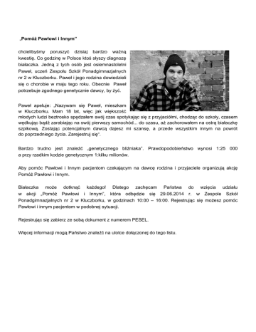 „Pomóż Pawłowi i Innym” chcielibyśmy poruszyć dzisiaj bardzo ważną kwestię. Co godzinę w Polsce ktoś słyszy diagnozę białaczka. Jedną z tych osób jest osiemnastoletni Paweł, uczeń Zespołu Szkół Ponadgimnazjalnych nr 2 w Kluczborku. Paweł i jego rodzina dowiedzieli się o chorobie w maju tego roku. Obecnie Paweł potrzebuje zgodnego genetycznie dawcy, by żyć. Paweł apeluje: „Nazywam się Paweł, mieszkam w Kluczborku. Mam 18 lat, więc jak większość młodych ludzi beztrosko spędzałem swój czas spotykając się z przyjaciółmi, chodząc do szkoły, czasem wędkując bądź zarabiając na swój pierwszy samochód... do czasu, aż zachorowałem na ostrą białaczkę szpikową. Zostając potencjalnym dawcą dajesz mi szansę, a przede wszystkim innym na powrót do poprzedniego życia. Zarejestruj się“. Bardzo trudno jest znaleźć „genetycznego bliźniaka”. Prawdopodobieństwo wynosi 1:25 000 a przy rzadkim kodzie genetycznym 1:kilku milionów. Aby pomóc Pawłowi i Innym pacjentom czekającym na dawcę rodzina i przyjaciele organizują akcję Pomóż Pawłowi i Innym. Białaczka może dotknąć każdego! Dlatego zachęcam Państwa do wzięcia udziału w akcji „Pomóż Pawłowi i Innym”, która odbędzie się 29.06.2014 r. w Zespole Szkół Ponadgimnazjalnych nr 2 w Kluczborku, w godzinach 10:00 – 16:00. Rejestrując się możesz pomóc Pawłowi i innym pacjentom w podobnej sytuacji. Rejestrując się zabierz ze sobą dokument z numerem PESEL. Więcej informacji mogą Państwo znaleźć na ulotce dołączonej do tego listu. PRZYŁĄCZ SIĘ DO WALKI Z RAKIEM KRWI! Informacje dla potencjalnych Dawców 1. W Polsce co godzinę ktoś dowiaduje się, że ma białaczkę, czyli nowotwór krwi. Dla wielu chorych jedyną szansą na życie jest przeszczepienie szpiku lub komórek macierzystych od niespokrewnionego Dawcy. Z każdym nowym zarejestrowanym potencjalnym Dawcą wzrasta szansa na pokonanie raka krwi. Jeśli dziś przyłączysz się do walki z rakiem krwi, jutro może okazać się, że to właśnie Ty możesz uratować komuś życie. 2. Każdy zdrowy człowiek pomiędzy 18 a 55 rokiem życia, który waży minimum 50 kg i nie ma dużej nadwagi, może zostać Dawcą. W celu określenia antygenów cech zgodności tkankowej wystarczy pobrać do przebadania 4 ml krwi. Faktycznym Dawcą zostaniesz, gdy okaże się, że posiadasz takie same cechy zgodności tkankowej, jak Pacjent cierpiący na raka krwi. Wtedy niezbędne będą dodatkowe badania lekarskie. 3. Pacjent chorujący na raka krwi dostaje szansę na nowe życie, kiedy dochodzi do przeszczepienia komórek macierzystych pobranych od niespokrewnionego, zgodnego genetycznie Dawcy. Istnieją dwie metody pobrania komórek macierzystych: 1. Pobranie komórek macierzystych z krwi obwodowej - stosowane w ok. 80% przypadków Przed pobraniem przez 4 dni Dawca przyjmuje czynnik wzrostu G-CSF, aby zwiększyć ilość komórek macierzystych w krwi obwodowej. Jest to substancja produkowana również naturalnie w organizmie człowieka w momencie przechodzenia infekcji. Podczas przyjmowania czynnika mogą wystąpić objawy grypopodobne. Komórki pobiera się metodą zwaną aferezą. W dniu pobrania na obu przedramionach Dawcy zakładane są dojścia dożylne. Krew przepływa z jednego ramienia poprzez tzw. separator komórek i wraca drugim dojściem dożylnym do organizmu. Zabieg nie wymaga hospitalizacji i trwa około 3-4 godziny. Metoda ta znana jest na świecie od 1998 roku. Według obecnego stanu badań ryzyko wystąpienia odległych w czasie efektów ubocznych jest nieznane. 2. Pobranie szpiku kostnego z talerza kości biodrowej Od znajdującego się pod narkozą Dawcy pobiera się z talerza kości biodrowej (nie jest to rdzeń kręgowy) ok. jednego litra mieszaniny szpiku kostnego i krwi. Mieszanina zawiera ok. 5% szpiku kostnego, regenerującego się całkowicie w organizmie w ciągu ok. dwóch tygodni. Dawca przyjmowany jest na oddział zwykle dzień przed pobraniem szpiku. W szpitalu pozostaje 2-3 dni, a jedyne zagrożenie ogranicza się do powszechnego ryzyka związanego z podaniem narkozy. Po pobraniu szpiku istnieje możliwość wystąpienia miejscowego bólu, podobnego do stłuczenia, który po kilku dniach mija. Decyzja o wyborze jednej z powyższych metod pobrania komórek macierzystych uzależniona jest od stanu zdrowia Pacjenta oraz od decyzji jego lekarza prowadzącego. W miarę możliwości brane są pod uwagę preferencje Dawcy. 4. Rejestracja dla potencjalnego Dawcy jest BEZPŁATNA. Wszystkie koszty rejestracji i przebadania jednego Dawcy komórek macierzystych, które wynoszą 250 PLN, pokrywa Fundacja DKMS m.in. dzięki darowiznom od osób indywidualnych i finansowemu wsparciu firm. 5. Każdemu Dawcy, w zależności od ilości pobrań, przysługuje odznaka „Dawcy Przeszczepu“ lub „Zasłużonego Dawcy Przeszczepu“.