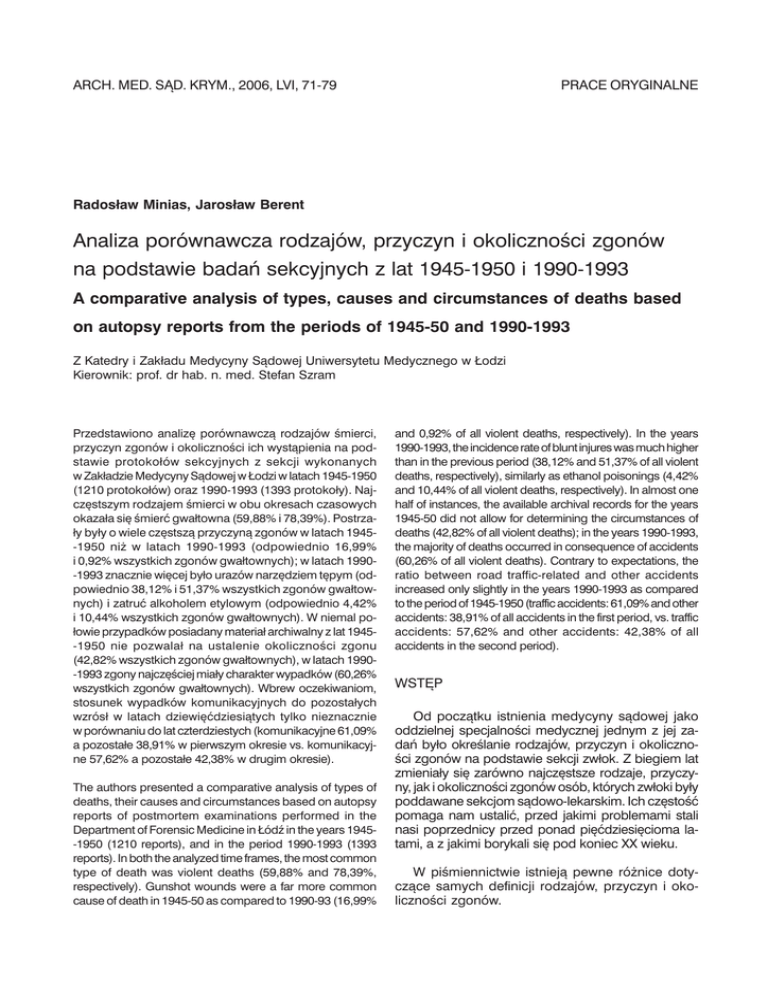 ARCH. MED. SĄD. KRYM., 2006, LVI, 71-79 PRACE ORYGINALNE Radosław Minias, Jarosław Berent Analiza porównawcza rodzajów, przyczyn i okoliczności zgonów na podstawie badań sekcyjnych z lat 1945-1950 i 1990-1993 A comparative analysis of types, causes and circumstances of deaths based on autopsy reports from the periods of 1945-50 and 1990-1993 Z Katedry i Zakładu Medycyny Sądowej Uniwersytetu Medycznego w Łodzi Kierownik: prof. dr hab. n. med. Stefan Szram Przedstawiono analizę porównawczą rodzajów śmierci, przyczyn zgonów i okoliczności ich wystąpienia na podstawie protokołów sekcyjnych z sekcji wykonanych w Zakładzie Medycyny Sądowej w Łodzi w latach 1945-1950 (1210 protokołów) oraz 1990-1993 (1393 protokoły). Najczęstszym rodzajem śmierci w obu okresach czasowych okazała się śmierć gwałtowna (59,88% i 78,39%). Postrzały były o wiele częstszą przyczyną zgonów w latach 1945-1950 niż w latach 1990-1993 (odpowiednio 16,99% i 0,92% wszystkich zgonów gwałtownych); w latach 1990-1993 znacznie więcej było urazów narzędziem tępym (odpowiednio 38,12% i 51,37% wszystkich zgonów gwałtownych) i zatruć alkoholem etylowym (odpowiednio 4,42% i 10,44% wszystkich zgonów gwałtownych). W niemal połowie przypadków posiadany materiał archiwalny z lat 1945-1950 nie pozwalał na ustalenie okoliczności zgonu (42,82% wszystkich zgonów gwałtownych), w latach 1990-1993 zgony najczęściej miały charakter wypadków (60,26% wszystkich zgonów gwałtownych). Wbrew oczekiwaniom, stosunek wypadków komunikacyjnych do pozostałych wzrósł w latach dziewięćdziesiątych tylko nieznacznie w porównaniu do lat czterdziestych (komunikacyjne 61,09% a pozostałe 38,91% w pierwszym okresie vs. komunikacyjne 57,62% a pozostałe 42,38% w drugim okresie). The authors presented a comparative analysis of types of deaths, their causes and circumstances based on autopsy reports of postmortem examinations performed in the Department of Forensic Medicine in Łódź in the years 1945-1950 (1210 reports), and in the period 1990-1993 (1393 reports). In both the analyzed time frames, the most common type of death was violent deaths (59,88% and 78,39%, respectively). Gunshot wounds were a far more common cause of death in 1945-50 as compared to 1990-93 (16,99% and 0,92% of all violent deaths, respectively). In the years 1990-1993, the incidence rate of blunt injures was much higher than in the previous period (38,12% and 51,37% of all violent deaths, respectively), similarly as ethanol poisonings (4,42% and 10,44% of all violent deaths, respectively). In almost one half of instances, the available archival records for the years 1945-50 did not allow for determining the circumstances of deaths (42,82% of all violent deaths); in the years 1990-1993, the majority of deaths occurred in consequence of accidents (60,26% of all violent deaths). Contrary to expectations, the ratio between road traffic-related and other accidents increased only slightly in the years 1990-1993 as compared to the period of 1945-1950 (traffic accidents: 61,09% and other accidents: 38,91% of all accidents in the first period, vs. traffic accidents: 57,62% and other accidents: 42,38% of all accidents in the second period). WSTĘP Od początku istnienia medycyny sądowej jako oddzielnej specjalności medycznej jednym z jej zadań było określanie rodzajów, przyczyn i okoliczności zgonów na podstawie sekcji zwłok. Z biegiem lat zmieniały się zarówno najczęstsze rodzaje, przyczyny, jak i okoliczności zgonów osób, których zwłoki były poddawane sekcjom sądowo-lekarskim. Ich częstość pomaga nam ustalić, przed jakimi problemami stali nasi poprzednicy przed ponad pięćdziesięcioma latami, a z jakimi borykali się pod koniec XX wieku. W piśmiennictwie istnieją pewne różnice dotyczące samych definicji rodzajów, przyczyn i okoliczności zgonów. 72 Radosław Minias, Jarosław Berent Pewna niekonsekwencja istnieje już w podstawowym podziale rodzajów śmierci. Otóż, niektóre podręczniki podają podział na zgony naturalne, chorobowe i gwałtowne [1], inne zaś natomiast zgony naturalne i chorobowe łączą ze sobą, tworząc tylko dwie grupy, tj. zgony naturalne i gwałtowne [2, 3]. Istnieją także dwa podziały przyczyn zgonów – podział na przyczynę pierwotną, wtórną i bezpośrednią, które to przyczyny lekarze zobowiązani są do wpisywania do kart zgonów zgodnie z Rozporządzeniem Ministra Zdrowia z dnia 7 grudnia 2001 roku w sprawie wzoru karty zgonu oraz sposobu jej wypełniania [4], wskazany także przez Popielskiego [2], oraz drugi, obecny w publikacjach anglojęzycznych – za przyczynę zgonu są uznawane takie obrażenia lub choroby, które doprowadzają do zmian patologicznych w organizmie, prowadzących do zgonu [5]. Jak widać, w krajach anglosaskich za przyczynę jako taką uznaje się przyczynę pierwotną w rozumieniu polskiego rozporządzenia w sprawie wzoru karty zgonu oraz sposobu jej wypełniania. W polskich przepisach natomiast przyczyną wyjściową (zewnętrzną, pierwotną) nazywa się „chorobę lub uraz, które zapoczątkowały łańcuch zdarzeń chorobowych, prowadzących bezpośrednio do zgonu lub okoliczności wypadku lub użycia przemocy, które spowodowały uraz śmiertelny”. Przyczyną wtórną nazywa się „chorobę, która rozwinęła się jako skutek choroby, urazu, zatrucia, wypadku lub użycia przemocy, będących wyjściową przyczyną zgonu”, a przyczyną bezpośrednią (ostateczną) jest natomiast „choroba, która stała się ostateczną przyczyną zgonu, w następstwie chorób, urazu, zatrucia, wypadku lub użycia przemocy, będących przyczynami zgonu, wyjściową i wtórną”. Odpowiednik przyczyny bezpośredniej nazwano w publikacjach będących tłumaczeniem podręczników anglojęzycznych mechanizmem zgonu [5]. Również pewne różnice pomiędzy polskimi a anglojęzycznymi publikacjami zauważono analizując definicję okol