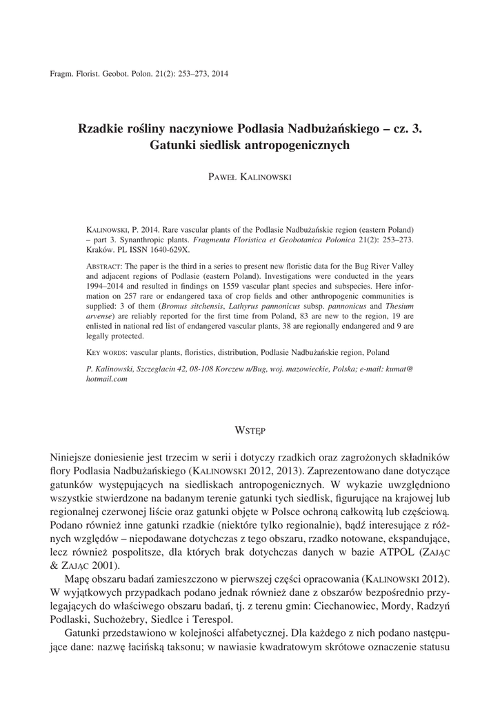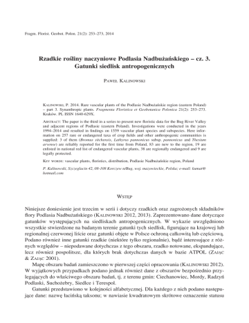 Fragm. Florist. Geobot. Polon. 21(2): 253–273, 2014 Rzadkie rośliny naczyniowe Podlasia Nadbużańskiego – cz. 3. Gatunki siedlisk antropogenicznych Paweł Kalinowski Kalinowski, P. 2014. Rare vascular plants of the Podlasie Nadbużańskie region (eastern Poland) – part 3. Synanthropic plants. Fragmenta Floristica et Geobotanica Polonica 21(2): 253–273. Kraków. PL ISSN 1640-629X. Abstract: The paper is the third in a series to present new floristic data for the Bug River Valley and adjacent regions of Podlasie (eastern Poland). Investigations were conducted in the years 1994–2014 and resulted in findings on 1559 vascular plant species and subspecies. Here information on 257 rare or endangered taxa of crop fields and other anthropogenic communities is supplied: 3 of them (Bromus sitchensis, Lathyrus pannonicus subsp. pannonicus and Thesium arvense) are reliably reported for the first time from Poland, 83 are new to the region, 19 are enlisted in national red list of endangered vascular plants, 38 are regionally endangered and 9 are legally protected. Key words: vascular plants, floristics, distribution, Podlasie Nadbużańskie region, Poland P. Kalinowski, Szczeglacin 42, 08-108 Korczew n/Bug, woj. mazowieckie, Polska; e-mail: kumat@ hotmail.com Wstęp Niniejsze doniesienie jest trzecim w serii i dotyczy rzadkich oraz zagrożonych składników flory Podlasia Nadbużańskiego (Kalinowski 2012, 2013). Zaprezentowano dane dotyczące gatunków występujących na siedliskach antropogenicznych. W wykazie uwzględniono wszystkie stwierdzone na badanym terenie gatunki tych siedlisk, figurujące na krajowej lub regionalnej czerwonej liście oraz gatunki objęte w Polsce ochroną całkowitą lub częściową. Podano również inne gatunki rzadkie (niektóre tylko regionalnie), bądź interesujące z różnych względów – niepodawane dotychczas z tego obszaru, rzadko notowane, ekspandujące, lecz również pospolitsze, dla których brak dotychczas danych w bazie ATPOL (Zając & Zając 2001). Mapę obszaru badań zamieszczono w pierwszej części opracowania (Kalinowski 2012). W wyjątkowych przypadkach podano jednak również dane z obszarów bezpośrednio przylegających do właściwego obszaru badań, tj. z terenu gmin: Ciechanowiec, Mordy, Radzyń Podlaski, Suchożebry, Siedlce i Terespol. Gatunki przedstawiono w kolejności alfabetycznej. Dla każdego z nich podano następujące dane: nazwę łacińską taksonu; w nawiasie kwadratowym skrótowe oznaczenie statusu 254 Fragm. Florist. Geobot. Polon. 21(2), 2014 gatunku w regionie (w przypadku gatunków obcego pochodzenia); kategorie zagrożenia wg Zarzyckiego i Szeląga (2006) oraz Głowackiego i in. (2003) (kategorie zagrożenia na poziomie krajowym zapisano czcionką wytłuszczoną) oraz informacje o ochronie gatunkowej (Rozporządzenie… 2012); następnie dane na temat częstotliwości występowania na badanym terenie wraz z krótką charakterystyką siedliska; wykaz stanowisk z podaniem skrótu nazwy gminy, na terenie której znajduje się stanowisko oraz współrzędne kwadratu ATPOL (Zając & Zając 2001). W przypadku niektórych rzadkich gatunków podano również informacje dotyczące liczebności populacji lub historii stanowisk. W pracy zastosowano następujące skróty i oznaczenia: !!! – gatunek nowy dla Polski, ! – gatunek stwierdzony na badanym terenie po raz pierwszy, * – gatunek synantropijny, (*) – gatunek o niepewnym statusie w lokalnej florze, być może rodzimy, Ap – apofit, Ar – archeofit, Ch – gatunek chroniony całkowicie, ch – gatunek chroniony częściowo, Ef – efemerofit, Erg – ergazjofit, Kn – kenofit, Kol. – Kolonia, oddz. – oddział leśny, rez. – rezerwat, WA – zielnik Uniwersytetu Warszawskiego. Oznaczenia gmin: BP – Biała Podlaska, Ce – Ceranów, Ci – Ciechanowiec, Dh – Drohiczyn, Hu – Huszlew, JL – Jabłonna Lacka, KL – Kosów Lacki, Ko – Korczew, Kt – Kotuń, Ło – Łosice, Mb – Mokobody, Mi – Mielnik, Mo – Mordy, Ol – Olszanka, Pa – Paprotnia, Pl – Platerów, Pr – Przesmyki, Re – Repki, RP – Radzyń Podlaski, Sa – Sabnie, Sd – Siedlce, Si – Siemiatycze, Sk – Skórzec, SK – Stara Kornica, Sn – Sarnaki, SP – Sokołów Podlaski, St – Sterdyń, Su – Suchożebry, Te – Terespol. Nomenklaturę roślin przyjęto za Mirkiem i in. (2002). W nielicznych przypadkach podano nazwy według Rutkowskiego (1998) i Stace’a (2010). Wykaz gatunków !* Abutilon theophrasti – [Ef] Bardzo rzadko i przejściowo: Szczeglacin (Ko, FD 07) – 3 okazy na osuszonym dnie stawu w 2004 r. !* Acer ginnala – [Erg] Rzadko sadzony przy drogach. Zdziczały w młodniku na skraju lasu Lipowiec na S od Kózek (Sn, FD 09). !* Acer saccharinum – [Erg] Dość często sadzony w parkach i na przydrożach, wyjątkowo dziczejący w Bartkowie obok zabudowań starej gorzelni (Ko, FD 07). * Achillea setacea – [Kn, E, EN] Potwierdzony na terenach kolejowych w Kosowie Lackim (KL, FC 74), gdzie rośnie bardzo licznie. Poprzednio notowany był stamtąd przez Głowackiego w 2000 r. (npbl., ATPOL). Gatunek ten, podobnie jak inne, rosnące razem z nim rzadkie kenofity i efemerofity (Centaurea diffusa, Falcaria vulgaris, Salvia nemorosa, Sedum hispanicum) jest ostatnio zagrożony przez prace modernizacyjne oraz budowę drogi szybkiego ruchu wzdłuż dawnej linii kolejowej. * Aesculus hippocastanum – [Erg] Często sadzony, dość rzadko krótkotrwale dziczejący na przydrożach i śmietnikach: Teofilówka (JL, FC 86), Mogielnica (Ko, FC 97), Wasilew Szlachecki (Re, FC 97), Bartków, las Cerkwisko (Ko, FD 07), Kamianki-Czabaje, Wysoka Góra (Pr, FD 07), Laskowice, w oddz. 120 (Ko, FD 07), Szczeglacin (Ko, FD 07), Figały (Ko, FD 08), Mężenin (Pl, FD 08), Łosice-Artych (Ło, FD 18) * Aethusa cynapium subsp. agrestis – [Ar] Bardzo rzadko na polach w Szczeglacinie (Ko, FD 07). * Agrostemma githago – [Ar, EN] Często na siedliskach segetalnych: Krzemień,