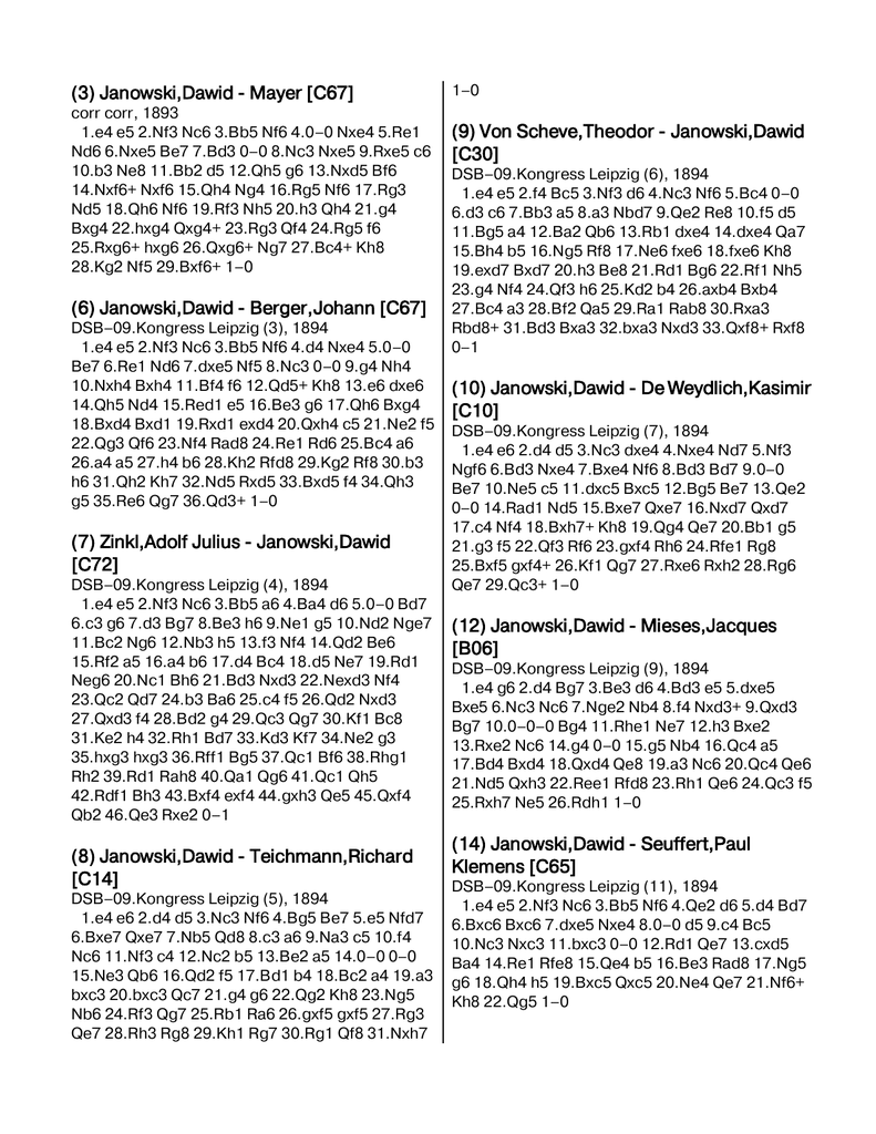 (3) Janowski,Dawid - Mayer [C67] corr corr, 1893 1.e4 e5 2.Nf3 Nc6 3.Bb5 Nf6 4.0–0 Nxe4 5.Re1 Nd6 6.Nxe5 Be7 7.Bd3 0–0 8.Nc3 Nxe5 9.Rxe5 c6 10.b3 Ne8 11.Bb2 d5 12.Qh5 g6 13.Nxd5 Bf6 14.Nxf6+ Nxf6 15.Qh4 Ng4 16.Rg5 Nf6 17.Rg3 Nd5 18.Qh6 Nf6 19.Rf3 Nh5 20.h3 Qh4 21.g4 Bxg4 22.hxg4 Qxg4+ 23.Rg3 Qf4 24.Rg5 f6 25.Rxg6+ hxg6 26.Qxg6+ Ng7 27.Bc4+ Kh8 28.Kg2 Nf5 29.Bxf6+ 1–0 (6) Janowski,Dawid - Berger,Johann [C67] DSB–09.Kongress Leipzig (3), 1894 1.e4 e5 2.Nf3 Nc6 3.Bb5 Nf6 4.d4 Nxe4 5.0–0 Be7 6.Re1 Nd6 7.dxe5 Nf5 8.Nc3 0–0 9.g4 Nh4 10.Nxh4 Bxh4 11.Bf4 f6 12.Qd5+ Kh8 13.e6 dxe6 14.Qh5 Nd4 15.Red1 e5 16.Be3 g6 17.Qh6 Bxg4 18.Bxd4 Bxd1 19.Rxd1 exd4 20.Qxh4 c5 21.Ne2 f5 22.Qg3 Qf6 23.Nf4 Rad8 24.Re1 Rd6 25.Bc4 a6 26.a4 a5 27.h4 b6 28.Kh2 Rfd8 29.Kg2 Rf8 30.b3 h6 31.Qh2 Kh7 32.Nd5 Rxd5 33.Bxd5 f4 34.Qh3 g5 35.Re6 Qg7 36.Qd3+ 1–0 (7) Zinkl,Adolf Julius - Janowski,Dawid [C72] DSB–09.Kongress Leipzig (4), 1894 1.e4 e5 2.Nf3 Nc6 3.Bb5 a6 4.Ba4 d6 5.0–0 Bd7 6.c3 g6 7.d3 Bg7 8.Be3 h6 9.Ne1 g5 10.Nd2 Nge7 11.Bc2 Ng6 12.Nb3 h5 13.f3 Nf4 14.Qd2 Be6 15.Rf2 a5 16.a4 b6 17.d4 Bc4 18.d5 Ne7 19.Rd1 Neg6 20.Nc1 Bh6 21.Bd3 Nxd3 22.Nexd3 Nf4 23.Qc2 Qd7 24.b3 Ba6 25.c4 f5 26.Qd2 Nxd3 27.Qxd3 f4 28.Bd2 g4 29.Qc3 Qg7 30.Kf1 Bc8 31.Ke2 h4 32.Rh1 Bd7 33.Kd3 Kf7 34.Ne2 g3 35.hxg3 hxg3 36.Rff1 Bg5 37.Qc1 Bf6 38.Rhg1 Rh2 39.Rd1 Rah8 40.Qa1 Qg6 41.Qc1 Qh5 42.Rdf1 Bh3 43.Bxf4 exf4 44.gxh3 Qe5 45.Qxf4 Qb2 46.Qe3 Rxe2 0–1 (8) Janowski,Dawid - Teichmann,Richard [C14] DSB–09.Kongress Leipzig (5), 1894 1.e4 e6 2.d4 d5 3.Nc3 Nf6 4.Bg5 Be7 5.e5 Nfd7 6.Bxe7 Qxe7 7.Nb5 Qd8 8.c3 a6 9.Na3 c5 10.f4 Nc6 11.Nf3 c4 12.Nc2 b5 13.Be2 a5 14.0–0 0–0 15.Ne3 Qb6 16.Qd2 f5 17.Bd1 b4 18.Bc2 a4 19.a3 bxc3 20.bxc3 Qc7 21.g4 g6 22.Qg2 Kh8 23.Ng5 Nb6 24.Rf3 Qg7 25.Rb1 Ra6 26.gxf5 gxf5 27.Rg3 Qe7 28.Rh3 Rg8 29.Kh1 Rg7 30.Rg1 Qf8 31.Nxh7 1–0 (9) Von Scheve,Theodor - Janowski,Dawid [C30] DSB–09.Kongress Leipzig (6), 1894 1.e4 e5 2.f4 Bc5 3.Nf3 d6 4.Nc3 Nf6 5.Bc4 0–0 6.d3 c6 7.Bb3 a5 8.a3 Nbd7 9.Qe2 Re8 10.f5 d5 11.Bg5 a4 12.Ba2 Qb6 13.Rb1 dxe4 14.dxe4 Qa7 15.Bh4 b5 16.Ng5 Rf8 17.Ne6 fxe6 18.fxe6 Kh8 19.exd7 Bxd7 20.h3 Be8 21.Rd1 Bg6 22.Rf1 Nh5 23.g4 Nf4 24.Qf3 h6 25.Kd2 b4 26.axb4 Bxb4 27.Bc4 a3 28.Bf2 Qa5 29.Ra1 Rab8 30.Rxa3 Rbd8+ 31.Bd3 Bxa3 32.bxa3 Nxd3 33.Qxf8+ Rxf8 0–1 (10) Janowski,Dawid - De Weydlich,Kasimir [C10] DSB–09.Kongress Leipzig (7), 1894 1.e4 e6 2.d4 d5 3.Nc3 dxe4 4.Nxe4 Nd7 5.Nf3 Ngf6 6.Bd3 Nxe4 7.Bxe4 Nf6 8.Bd3 Bd7 9.0–0 Be7 10.Ne5 c5 11.dxc5 Bxc5 12.Bg5 Be7 13.Qe2 0–0 14.Rad1 Nd5 15.Bxe7 Qxe7 16.Nxd7 Qxd7 17.c4 Nf4 18.Bxh7+ Kh8 19.Qg4 Qe7 20.Bb1 g5 21.g3 f5 22.Qf3 Rf6 23.gxf4 Rh6 24.Rfe1 Rg8 25.Bxf5 gxf4+ 26.Kf1 Qg7 27.Rxe6 Rxh2 28.Rg6 Qe7 29.Qc3+ 1–0 (12) Janowski,Dawid - Mieses,Jacques [B06] DSB–09.Kongress Leipzig (9), 1894 1.e4 g6 2.d4 Bg7 3.Be3 d6 4.Bd3 e5 5.dxe5 Bxe5 6.Nc3 Nc6 7.Nge2 Nb4 8.f4 Nxd3+ 9.Qxd3 Bg7 10.0–0–0 Bg4 11.Rhe1 Ne7 12.h3 Bxe2 13.Rxe2 Nc6 14.g4 0–0 15.g5 Nb4 16.Qc4 a5 17.Bd4 Bxd4 18.Qxd4 Qe8 19.a3 Nc6 20.Qc4 Qe6 21.Nd5 Qxh3 22.Ree1 Rfd8 23.Rh1 Qe6 24.Qc3 f5 25.Rxh7 Ne5 26.Rdh1 1–0 (14) Janowski,Dawid - Seuffert,Paul Klemens [C65] DSB–09.Kongress Leipzig (11), 1894 1.e4 e5 2.Nf3 Nc6 3.Bb5 Nf6 4.Qe2 d6 5.d4 Bd7 6.Bxc6 Bxc6 7.dxe5 Nxe4 8.0–0 d5 9.c4 Bc5 10.Nc3 Nxc3 11.bxc3 0–0 12.Rd1 Qe7 13.cxd5 Ba4 14.Re1 Rfe8 15.Qe4 b5 16.Be3 Rad8 17.Ng5 g6 18.Qh4 h5 19.Bxc5 Qxc5 20.Ne4 Qe7 21.Nf6+ Kh8 22.Qg5 1–0 (16) Janowski,Dawid - Mason,James [C67] DSB–09.Kongress Leipzig (13), 1894 1.e4 e5 2.Nf3 Nc6 3.Bb5 Nf6 4.d4 Nxe4 5.0–0 Be7 6.Re1 Nd6 7.dxe5 Nxb5 8.a4 Nbd4 9.Nxd4 Nxd4 10.Qxd4 0–0 11.Bf4 d5 12.exd6 Bxd6 13.Bxd6 cxd6 14.Nc3 Bf5 15.Re2 Re8 16.Rae1 Rxe2 17.Rxe2 Qd7 18.Nd5 Be6 19.Nf4 a6 20.Re3 Bf5 21.Rg3 Bg6 22.h4 Re8 23.h5 Re4 24.Qd2 Bf5 25.Qc3 Re5 26.Nd5 Kf8 27.Ne3 f6 28.f4 Rc5 29.Qd4 h6 30.b4 Rc6 31.c3 Be6 32.c4 Qc7 33.Qe4 Qf7 34.b5 axb5 35.axb5 Rc5 36.Qd4 Qc7 37.Qe4 Qf7 38.Qd4 Qc7 39.Qe4 Qf7 40.Qd3 Qc7 41.Qh7 Qf7 42.Qd3 Qc7 43.Qh7 Rxh5 44.b6 Qd7 45.Qh8+ Bg8 46.Nd5 Qf7 47.Ra3 Qe8 48.Re3 Qa4 49.Re1 Rxd5 50.cxd5 Qd4+ 51.Kh1 Qxd5 52.Rc1 Qh5+ 53.Kg1 Qe8 54.Kf2 Kf7 55.Rc7+ 1–0 (17) Janowski,Dawid - Blackburne,Joseph Henry [C62] DSB–09.Kongress Leipzig (14), 1894 1.e4 e5 2.Nf3 Nc6 3.Bb5 d6 4.d4 Bd7 5.Nc3 exd4 6.Nxd4 Nge7 7.Bg5 Qc8 8.0–0 Nxd4 9.Qxd4 Bxb5 10.Nxb5 Nc6 11.Qe3 a6 12.Nc3 f6 13.Bh4 Qg4 14.Bg3 0–0–0 15.b4 Qe6 16.b5 axb5 17.Nxb5 Qc4 18.Rab1 Qc5 19.Qb3 Rd7 20.Qa4 Kd8 21.Qa8+ Ke7 22.Qxb7 Kf7 23.Qc8 Re7 24.Rfd1 Nb4 25.Bxd6 Qxb5 26.Bxe7 Bxe7 27.Qxh8 Qe2 28.Qxh7 Nxc2 29.Qf5 Na3 30.h4 Nxb1 31.Qd5+ Kg6 32.Rxb1 Bd6 33.Qf5+ Kf7 34.h5 Qxa2 35.e5 Be7 36.exf6 Bxf6 37.Re1 Qa4 38.Qe6+ Kf8 39.Qc8+ Kf7 40.Qxc7+ Kg8 41.Qc8+ Kh7 42.Qf5+ Kh8 43.Qg6 Be5 44.Qe6 Bf6 45.Qe8+ 1–0 (20) Marco,Georg - Janowski,Dawid [C49] DSB–09.Kongress Leipzig (17), 1894 1.e4 e5 2.Nf3 Nc6 3.Nc3 Nf6 4.Bb5 Bb4 5.0–0 0–0 6.d3 d6 7.Bxc6 bxc6 8.Ne2 Bg4 9.c3 Bc5 10.d4 exd4 11.cxd4 Bb6 12.Qd3 Re8 13.Bg5 h6 14.Bxf6 Qxf6 15.Rad1 Qe6 16.Nc3 Bh5 17.Rfe1 Bg6 18.Qa6 Qc8 19.Qc4 Qd7 20.e5 d5 21.Qa6 Bh5 22.Re3 Re6 23.b4 Qc8 24.Qxc8+ Rxc8 25.Na4 Rce8 26.Nxb6 axb6 27.Ra3 f6 28.exf6 gxf6 29.Ra7 R8e7 30.Kf1 Kf7 31.a4 Ke8 32.a5 bxa5 33.bxa5 Kd7 34.Rb1 Bxf3 35.gxf3 Re2 36.Ra8 Re8 37.Rbb8 Rxb8 38.Rxb8 Ra2 39.Rh8 Rxa5 40.Rxh6 Ra4 41.Rxf6 Rxd4 42.f4 c5 43.h4 c4 44.h5 c3 45.h6 c2 46.h7 c1Q+ 47.Kg2 Rd1 0–1 (21) Janowski,Dawid - Mieses,Jacques [C84] Paris La Regence m Paris (1), 07.01.1895 [Le Matin] 1.e4 e5 2.Nf3 Nc6 3.Bb5 a6 4.Ba4 Nf6 5.Nc3 Be7 6.0–0 d6 7.d3 0–0 8.Ne2 Ne8 9.Ng3 f5 ce coup est faible, car il force les Noirs a echanger le FD, ce qui est generalement desavantageux au commencement de la partie. 10.exf5 Bxf5 11.Nxf5 Rxf5 12.Re1 Pour empecher l'adversaire de se degager par d5 et menacant en meme temps une attaque par d4. 12...Rf8 Le meilleur [si 12...Bf6 13.g4 gagnerait un echange.; et si 12...Nf6 13.Ng5 mieux] 13.c3 Bf6 Ce coup coute un pion [Mais si 13...Kh8 les Blancs obtiendrait une forte attaque par 14.d4] 14.Qb3+ Kh8 15.Qxb7 Ne7 16.Ng5 Bxg5 17.Bxg5 Nf6 18.Qf3 La meilleure retraite