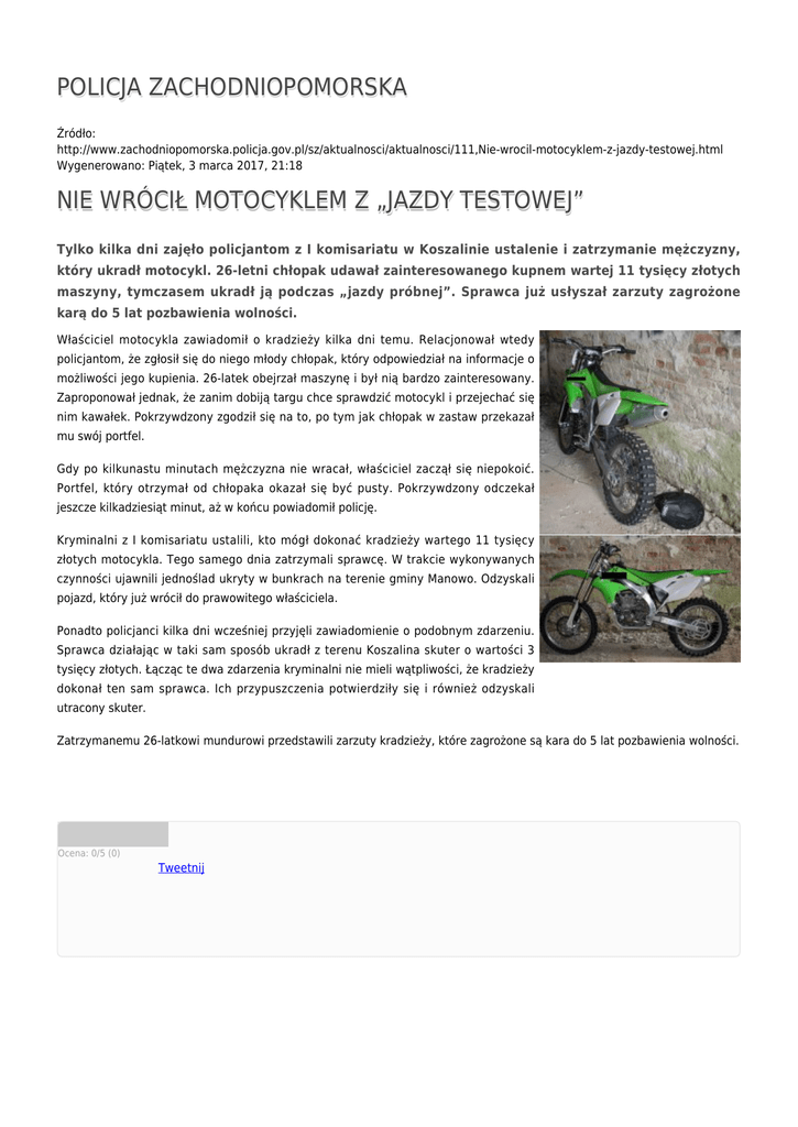 POLICJA ZACHODNIOPOMORSKA Źródło: http://www.zachodniopomorska.policja.gov.pl/sz/aktualnosci/aktualnosci/111,Nie-wrocil-motocyklem-z-jazdy-testowej.html Wygenerowano: Piątek, 3 marca 2017, 21:18 NIE WRÓCIŁ MOTOCYKLEM Z „JAZDY TESTOWEJ” Tylko kilka dni zajęło policjantom z I komisariatu w Koszalinie ustalenie i zatrzymanie mężczyzny, który ukradł motocykl. 26-letni chłopak udawał zainteresowanego kupnem wartej 11 tysięcy złotych maszyny, tymczasem ukradł ją podczas „jazdy próbnej”. Sprawca już usłyszał zarzuty zagrożone karą do 5 lat pozbawienia wolności. Właściciel motocykla zawiadomił o kradzieży kilka dni temu. Relacjonował wtedy policjantom, że zgłosił się do niego młody chłopak, który odpowiedział na informacje o możliwości jego kupienia. 26-latek obejrzał maszynę i był nią bardzo zainteresowany. Zaproponował jednak, że zanim dobiją targu chce sprawdzić motocykl i przejechać się nim kawałek. Pokrzywdzony zgodził się na to, po tym jak chłopak w zastaw przekazał mu swój portfel. Gdy po kilkunastu minutach mężczyzna nie wracał, właściciel zaczął się niepokoić. Portfel, który otrzymał od chłopaka okazał się być pusty. Pokrzywdzony odczekał jeszcze kilkadziesiąt minut, aż w końcu powiadomił policję. Kryminalni z I komisariatu ustalili, kto mógł dokonać kradzieży wartego 11 tysięcy złotych motocykla. Tego samego dnia zatrzymali sprawcę. W trakcie wykonywanych czynności ujawnili jednoślad ukryty w bunkrach na terenie gminy Manowo. Odzyskali pojazd, który już wrócił do prawowitego właściciela. Ponadto policjanci kilka dni wcześniej przyjęli zawiadomienie o podobnym zdarzeniu. Sprawca działając w taki sam sposób ukradł z terenu Koszalina skuter o wartości 3 tysięcy złotych. Łącząc te dwa zdarzenia kryminalni nie mieli wątpliwości, że kradzieży dokonał ten sam sprawca. Ich przypuszczenia potwierdziły się i również odzyskali utracony skuter. Zatrzymanemu 26-latkowi mundurowi przedstawili zarzuty kradzieży, które zagrożone są kara do 5 lat pozbawienia wolności. Ocena: 0/5 (0) Tweetnij