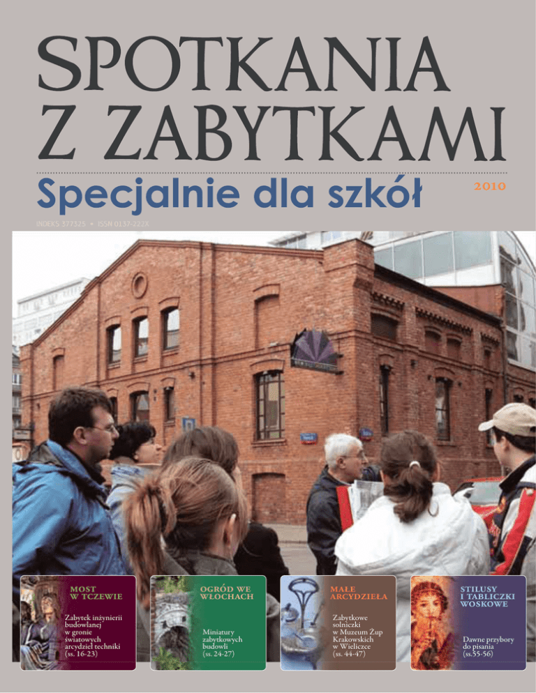 ............................................................................................................................................................................. Specjalnie dla szkół 2010 INDEKS 377325 • ISSN 0137-222X most w tczewie Zabytek inżynierii budowlanej w gronie światowych arcydzieł techniki (ss. 16-23) ogród we włochach Miniatury zabytkowych budowli (ss. 24-27) małe arcydzieła Zabytkowe solniczki w Muzeum Żup Krakowskich w Wieliczce (ss. 44-47) stilusy i tabliczki woskowe Dawne przybory do pisania (ss.55-56) | Spotkania z Zabytkami – dla szkół 2010 Spis treści ............................................................................................................................................ ■4 Pomówmy o zabytkach Maria Lewicka ■ 16 Most nad mostami Waldemar J. Affelt ■ 24 Słynne budowle w warszawskich Włochach Małgorzata M. Przybyszewska ■ 28 Z warsztatu historyka sztuki: Kilka faktów z historii fabryki fajansów na Dębnikach w Krakowie Boena Kostuch ■1 Od redakcji ■2 przeglądy, poglądy z wizytą w muzeum ■ 44 Małe arcydzieła – zabytkowe solniczki K O-D Spotkania na wschodzie ■ 32 ■ 47 Spotkanie z książką: Muzealnictwo ■ 48 Galeria Sztuki Polskiej XIX wieku w Sukiennicach zaprasza publiczność Siedziba hrabiów Pusłowskich w Piaskach rozmaitości K J S ■ 35 zabytki w krajobrazie ■ 49 Światowe dziedzictwo W odwiedzinach w pałacu w Kłębowcu ■ 49 Spotkanie z książką: Śladami Baczyńskiego ■ 50 Warszawska Syrena jako motyw ozdobny biżuterii N G ■ 38 Spotkanie z książką: Skarby Podkarpackie ■ 39 Świątynia w pełnym blasku I Z ■ 53 K Z to też są zabytki Z kryminalnej kroniki: Zagadka śmierci księżnej Ludgardy H W ■ 54 Z Dźwiniaczki do Warszawy J K ■ 40 Akcja zabytki poprzemysłowe: Zabytki hutnictwa i odlewnictwa ■ 55 J P ■ 43 Spotkanie z książką: Znaki na srebrze – czwarta edycja Stilusy i tabliczki woskowe – dawne przybory do pisania M K ■ 57 Listy ... Od Redakcji ........................................................................................................................................................................................................ N C K . S - W . (+) , : ( + ) @., .. Numer Specjalny – dla szkół Warszawa 2010 ADRES REDAKCJI 00-590 Warszawa, ul. Marszałkowska 4 lok. 4 tel./fax 22 622-46-63 e-mail: [email protected] http:// www.spotkania-z-zabytkami.pl REDAKCJA Wojciech Przybyszewski Lidia Bruszewska Ewa A. Kamińska Jarosław Komorowski Piotr Berezowski Magdalena Barańska WSPÓŁPRACOWNICY Stanisław Grzelachowski Monika Nowakowska Janusz Sujecki Tomasz Urzykowski Hanna Widacka Wanda Załęska ........................................ RADA REDAKCYJNA prof. dr hab. Andrzej Tomaszewski (przewodniczący) prof. dr hab. Dorota Folga-Januszewska dr Dominik Jagiełło prof. dr hab. Stanisław Januszewski prof. dr hab. inż. arch. Robert M. Kunkel prof. dr hab. Małgorzata Omilanowska prof. dr hab. Maria Poprzęcka prof. dr hab. Jacek Purchla prof. dr hab. Andrzej Rottermund prof. dr hab. Bogumiła Rouba mgr Andrzej Sołtan dr Marian Sołtysiak prof. dr hab. inż. Bogusław Szmygin WYDAWCA 00-590 Warszawa, ul. Marszałkowska 4 lok. 4 tel. 22 353 83 30, fax 22 353 83 31 e-mail: [email protected] http:// www.fundacja-hereditas.pl Redakcja zastrzega sobie prawo wprowadzania zmian i skrótów w materiałach przeznaczonych do publikacji oraz publikowania wybranych artykułów w wersji elektronicznej. Materiałów niezamówionych redakcja nie zwraca. Za treść reklam i ogłoszeń redakcja nie odpowiada. T en numer przekazujemy naszym stałym młodym Czytelnikom oraz tym, którzy po raz pierwszy zetkną się ze „Spotkaniami z Zabytkami” i dlatego otwiera go artykuł, zawierający podstawowe informacje z zakresu ochrony polskiego dziedzictwa kulturowego. Stanowi on nieco zmienioną, uaktualnioną wersję tekstu zamieszczonego przed ponad trzydziestu laty w pierwszym numerze naszego czasopisma. Jego autorka – dr Maria Lewicka, znakomita popularyzatorka wiedzy o zabytkach, wieloletnia była pracownica Instytutu Sztuki PAN w Warszawie, charakteryzując ogólny zasób polskiego dziedzictwa i przedstawiając w zwięzłych sformułowaniach zasadnicze problemy z nim związane, chce wzbudzić wobec polskiego dziedzictwa kulturowego respekt oraz uświadomić potrzebę jego opieki i ochrony. „Nasze zabiegane «dziś» − pisze – jest nierozerwalnie związane z naszym «wczoraj». Kontakt z zabytkiem tę prawdę jednoznacznie uświadamia”. W tym numerze staraliśmy się też powtórzyć działy i cykle tematyczne, które stanowią budulec edycji każdego numeru „Spotkań z Zabytkami”. I tak np. dział „Zabytki w krajobrazie” reprezentuje wizyta w ruinach niegdyś wspaniałego, barokowego pałacu w Kłębowcu niedaleko Wałcza, w dziale „To też są zabytki” mowa jest o urządzeniach dawnej techniki hutnictwa i odlewnictwa eksponowanych w Muzeum Zagłębia Staropolskiego w Sielpi, w dziale „Z wizytą w muzeum” możemy przeczytać o stałej wystawie w Muzeum Żup Krakowskich w Wieliczce pt. „Solniczki – małe arcydzieła sztuki”, jest też zaproszenie do otwartej po trzyletnim remoncie Galerii Sztuki Polskiej XIX wieku w krakowskich Sukiennicach. Zabrakło, niestety, działu „Zabytki i młodzież”, w którym zamieszczane są relacje z rozmaitych działań na rzecz ochrony zabytków, podejmowanych przez Waszych rówieśników. Mając na uwadze udział młodzieży w redagowaniu tego działu, liczymy na przysyłanie materiałów. Wszystkie zasługujące na zainteresowanie ukażą się na łamach kolejnych numerów „Spotkań z Zabytkami”, a aby je systematycznie śledzić, zachęcamy do zamówienia prenumeraty naszego czasopisma (warunki prenumeraty na s. III okładki). Zatem do następnego spotkania z zabytkami. Nakład: 6000 egz. NA OKŁADCE: Wędrówka po Warszawie w ramach projektu Fundacji Hereditas „Ale hi