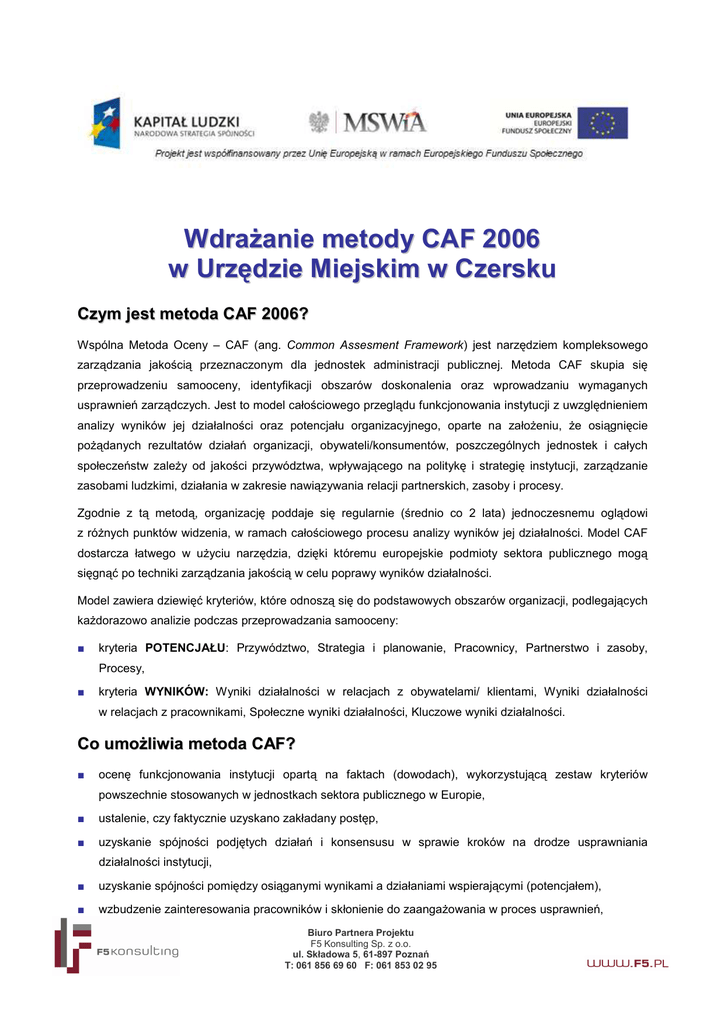 WdraŜanie metody CAF 2006 w Urzędzie Miejskim w Czersku Czym jest metoda CAF 2006? Wspólna Metoda Oceny – CAF (ang. Common Assesment Framework) jest narzędziem kompleksowego zarządzania jakością przeznaczonym dla jednostek administracji publicznej. Metoda CAF skupia się przeprowadzeniu samooceny, identyfikacji obszarów doskonalenia oraz wprowadzaniu wymaganych usprawnień zarządczych. Jest to model całościowego przeglądu funkcjonowania instytucji z uwzględnieniem analizy wyników jej działalności oraz potencjału organizacyjnego, oparte na załoŜeniu, Ŝe osiągnięcie poŜądanych rezultatów działań organizacji, obywateli/konsumentów, poszczególnych jednostek i całych społeczeństw zaleŜy od jakości przywództwa, wpływającego na politykę i strategię instytucji, zarządzanie zasobami ludzkimi, działania w zakresie nawiązywania relacji partnerskich, zasoby i procesy. Zgodnie z tą metodą, organizację poddaje się regularnie (średnio co 2 lata) jednoczesnemu oglądowi z róŜnych punktów widzenia, w ramach całościowego procesu analizy wyników jej działalności. Model CAF dostarcza łatwego w uŜyciu narzędzia, dzięki któremu europejskie podmioty sektora publicznego mogą sięgnąć po techniki zarządzania jakością w celu poprawy wyników działalności. Model zawiera dziewięć kryteriów, które odnoszą się do podstawowych obszarów organizacji, podlegających kaŜdorazowo analizie podczas przeprowadzania samooceny: ■ kryteria POTENCJAŁU: Przywództwo, Strategia i planowanie, Pracownicy, Partnerstwo i zasoby, Procesy, ■ kryteria WYNIKÓW: Wyniki działalności w relacjach z obywatelami/ klientami, Wyniki działalności w relacjach z pracownikami, Społeczne wyniki działalności, Kluczowe wyniki działalności. Co umoŜliwia metoda CAF? ■ ocenę funkcjonowania instytucji opartą na faktach (dowodach), wykorzystującą zestaw kryteriów powszechnie stosowanych w jednostkach sektora publicznego w Europie, ■ ustalenie, czy faktycznie uzyskano zakładany postęp, ■ uzyskanie spójności podjętych działań i konsensusu w sprawie kroków na drodze usprawniania działalności instytucji, ■ uzyskanie spójności pomiędzy osiąganymi wynikami a działaniami wspierającymi (potencjałem), ■ wzbudzenie zainteresowania pracowników i skłonienie do zaangaŜowania w proces usprawnień, Biuro Partnera Projektu F5 Konsulting Sp. z o.o. ul. Składowa 5, 61-897 Poznań T: 061 856 69 60 F: 061 853 02 95 ■ upowszechnienie doświadczeń w zakresie dobrych praktyk i dzielenie się nimi wewnątrz i na zewnątrz instytucji, ■ włączenie róŜnych inicjatyw dotyczących poprawy jakości w codzienną działalność instytucji, ■ pomiar osiąganego wraz z upływem czasu postępu, drogą okresowej samooceny. Jak metoda CAF będzie wdraŜana? WdroŜenie metody CAF w Urzędzie będzie przebiegać w oparciu o 10 kroków doskonalenia organizacji, podzielonych na trzy fazy: FAZA I Krok 1: Organizacja i planowanie procesu samooceny Krok 2: Upowszechnienie informacji o procesie samooceny Początek drogi z metodą CAF FAZA II Proces samooceny Krok 3: Utworzenie jednej lub więcej grup samooceny Krok 4: Organizacja szkoleń Krok 5: Przeprowadzenie samooceny Krok 6: Sporządzenie sprawozdania z wyników samooceny Krok 7: Sporządzenie projektu planu doskonalenia FAZA III Plan usprawnień / ustalenie priorytetów Krok 8: Upowszechnienie informacji o planie doskonalenia Krok 9: Realizacja planu doskonalenia Krok 10: Planowanie następnej samooceny CAF Urząd otrzyma wsparcie ze strony MSWiA do Kroku 7 tj. wsparcia doradczego z zakresu ustalania priorytetów działań doskonalących, podstaw zarządzania projektem, sposobu monitoringu projektu. W ramach projektu przeprowadzone zostaną 4-godzinne konsultacje dla przedstawicieli Urzędu, będące wstępem do ustalenia priorytety działań doskonalących oraz do uzgodnienia planów usprawnień dla urzędu. Projekty, jakie powstają po zakończeniu procesu samooceny, będą wynikiem wiarygodnej listy słabych stron Urzędu, z których wiele moŜe zostać wyeliminowanych dzięki działaniom doskonalącym – w wielu przypadkach bez ponoszenia istotnych kosztów lub wręcz bezkosztowo. Biuro Partnera Projektu F5 Konsulting Sp. z o.o. ul. Składowa 5, 61-897 Poznań T: 061 856 69 60 F: 061 853 02 95 Gdzie mogę uzyskać więcej informacji na temat projektu wdroŜenia metody CAF? Na mocy Zarządzenia nr ”157/11 Burmistrza Czerska z dnia 29.09.2011 r. w sprawie powołania Koordynatora CAF oraz osoby wpierającej”, powołano tzw. Koordynatora CAF, odpowiadającego za kierowanie projektem wdroŜenia metody CAF w Urzędzie. Funkcję Koordynatora CAF pełni Grzegorz Zabrocki Sekretarz Gminy, Koordynator CAF, na wszystkich etapach projektu, udzielać będzie zainteresowanym osobom informacji na temat zrealizowanych w projekcie działań oraz osiągniętych rezultatów. BieŜące informacje na temat projektu wdroŜenia metody CAF będą przekazywane w szczególności: Kierownictwu Urzędu, Pracownikom Urzędu, Klientom (obywatelom), Ministerstwu Spraw Wewnętrznych i Administracji. BieŜące informacje o istocie, celach, metodach i skutkach wdroŜenia metody CAF w urzędzie będą przekazywane za pośrednictwem: ■ stronę www Urzędu http://www.czersk.pl/, http://bip.czersk.pl/; ■ prezentacje w ramach spotkań bezpośrednich. Biuro Partnera Projektu F5 Konsulting Sp. z o.o. ul. Składowa 5, 61-897 Poznań T: 061 856 69 60 F: 061 853 02 95