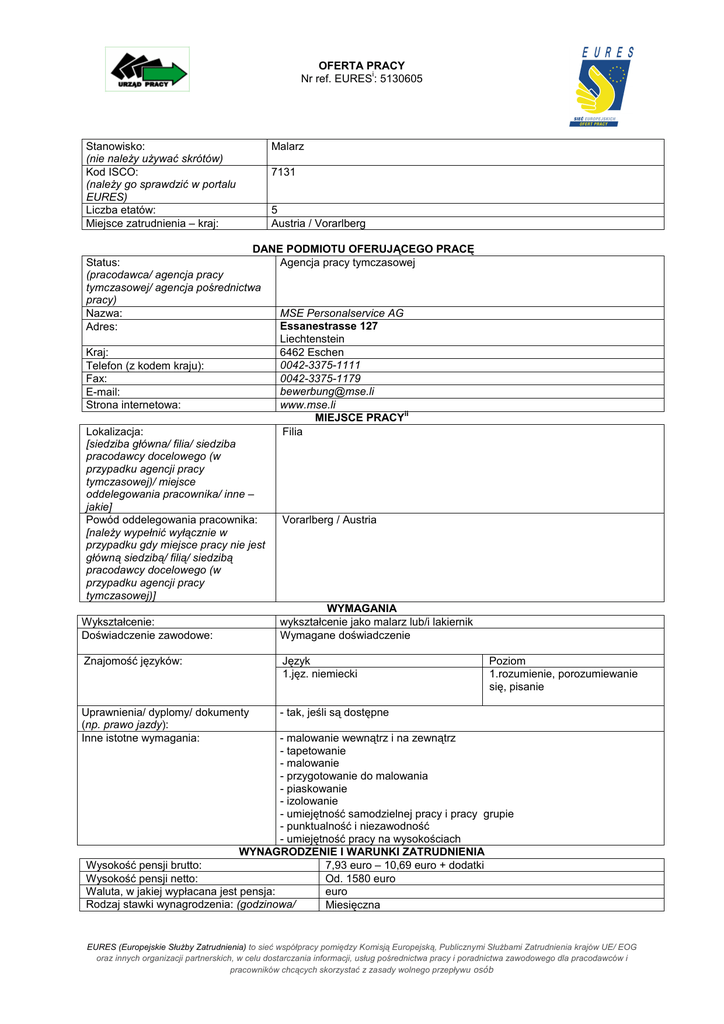 OFERTA PRACY i Nr ref. EURES : 5130605 Stanowisko: (nie naleŜy uŜywać skrótów) Kod ISCO: (naleŜy go sprawdzić w portalu EURES) Liczba etatów: Miejsce zatrudnienia – kraj: Malarz 7131 5 Austria / Vorarlberg DANE PODMIOTU OFERUJĄCEGO PRACĘ Status: Agencja pracy tymczasowej (pracodawca/ agencja pracy tymczasowej/ agencja pośrednictwa pracy) MSE Personalservice AG Nazwa: Essanestrasse 127 Adres: Liechtenstein Kraj: 6462 Eschen 0042-3375-1111 Telefon (z kodem kraju): 0042-3375-1179 Fax: [email protected] E-mail: www.mse.li Strona internetowa: ii MIEJSCE PRACY Lokalizacja: Filia [siedziba główna/ filia/ siedziba pracodawcy docelowego (w przypadku agencji pracy tymczasowej)/ miejsce oddelegowania pracownika/ inne – jakie] Powód oddelegowania pracownika: Vorarlberg / Austria [naleŜy wypełnić wyłącznie w przypadku gdy miejsce pracy nie jest główną siedzibą/ filią/ siedzibą pracodawcy docelowego (w przypadku agencji pracy tymczasowej)] WYMAGANIA Wykształcenie: wykształcenie jako malarz lub/i lakiernik Doświadczenie zawodowe: Wymagane doświadczenie Znajomość języków: Język 1.jęz. niemiecki Uprawnienia/ dyplomy/ dokumenty (np. prawo jazdy): Inne istotne wymagania: - tak, jeśli są dostępne Poziom 1.rozumienie, porozumiewanie się, pisanie - malowanie wewnątrz i na zewnątrz - tapetowanie - malowanie - przygotowanie do malowania - piaskowanie - izolowanie - umiejętność samodzielnej pracy i pracy grupie - punktualność i niezawodność - umiejętność pracy na wysokościach WYNAGRODZENIE I WARUNKI ZATRUDNIENIA Wysokość pensji brutto: 7,93 euro – 10,69 euro + dodatki Wysokość pensji netto: Od. 1580 euro Waluta, w jakiej wypłacana jest pensja: euro Rodzaj stawki wynagrodzenia: (godzinowa/ Miesięczna EURES (Europejskie SłuŜby Zatrudnienia) to sieć współpracy pomiędzy Komisją Europejską, Publicznymi SłuŜbami Zatrudnienia krajów UE/ EOG oraz innych organizacji partnerskich, w celu dostarczania informacji, usług pośrednictwa pracy i poradnictwa zawodowego dla pracodawców i pracowników chcących skorzystać z zasady wolnego przepływu osób tygodniowa/ miesięczna/ roczna/ inna) Premie: Dodatkowe świadczenia (zakwaterowanie, wyŜywienie, koszty związane ze zmianą miejsca zamieszkania, koszty podróŜy itp.): Nazwa firmy, z którą zostanie podpisana umowa: Rodzaj umowy: (umowa o pracę, umowa zlecenia, wolontariat, praktyka zawodowa/ staŜ, praca zdalna, agencja pracy tymczasowej, inne): Wymiar czasu pracy (praca na pełen etat/ część etatu): Czas trwania umowy: (nieokreślony/ określony) - 25 dni urlopu - dodatkowe pieniądze w czasie urlopu i w czasie świątecznym - zakwaterowanie jest zapewnione ze strony pracodawcy ale opłacane przez pracownika ok. 250 euro – 350 euro MSE Personalservice AG Umowa o pracę Praca na pełen etat Data wygaśnięcia umowy (w przypadku umowy na czas określony): SPOSÓB SKŁADANIA WNIOSKU Wymagane dokumenty CV, List motywacyjny, kserokopie świadectw pracy, certyfikatów, (list motywacyjny, CV itp.): dyplomów, referencji ( jeśli są) Język, w którym muszą być sporządzone niemiecki przedkładane dokumenty: Do kogo naleŜy wysłać dokumenty: Do Dolnośląskiego Wojewódzkiego Urzędu Pracy (do pracodawcy/ doradcy EURES) Gdzie naleŜy wysłać dokumenty: (adres, adres e-mail, nr faksu z kodem kraju itp.) Dane teleadresowe doradcy EURES lub przedstawiciela pracodawcy: (nazwisko, adres, telefon, fax, e-mail itp.) Na czas nieokreślony Pocztą tradycyjną, faxem bądź w formie elektronicznej ( z dopiskiem „Austria –malarz”) Judyta Ragiel Dolnośląski Wojewódzki Urząd Pracy Filia w Jeleniej Górze ul. Wojska Polskiego 18 58-500 Jelenia Góra Tel. 75-75-45-179 Fax. 75-75-45-190 e-mail: [email protected] Więcej informacji: Inne: [email protected] Tel. 85 7497 235, fax 85 7497 209 DODATKOWE INFORMACJE Dokumenty, spełniające warunki formalne, zostaną przekazane pracodawcy, który skontaktuje się z wybranymi kandydatami. WAśNOŚĆ Data publikacji: 07.02.2012r. Termin przedkładania podań o pracę / Do odwołania zakończenia waŜności oferty: Agencja pracy tymczasowej MSE Personalservice AG, oświadczyła, Ŝe prowadzi działalność zgodnie z przepisami obowiązującymi w swoim kraju. Uprzejmie informujemy, Ŝe skontaktujemy się wyłącznie z wybranymi kandydatami. UWAGA: 1. Umowa z zagranicznym pracodawcą zostanie zawarta zgodnie z prawem kraju zatrudnienia. Oznacza to, Ŝe wszystkie roszczenia odnośnie do warunków, które obejmuje umowa, moŜna kierować wyłącznie do odpowiedniego sądu w kraju zatrudnienia. Publiczne słuŜby zatrudnienia (EURES) nie mogą pośredniczyć ani reprezentować pracownika w sądzie kraju zatrudnienia w przypadku sporu z pracodawcą. 2. Publiczne słuŜby zatrudnienia (EURES) dokładają wszelkich starań, aby zapewnić rzetelność i wiarygodność ofert pracy zgłoszonych w lokalnym urzędzie pracy. NaleŜy wyjaśnić, Ŝe oferta pracy została zgłoszona przez stronę trzecią i EURES nie odpowiada za ewentualne rozbieŜności między warunkami pracy określonymi w ofercie pracy i warunkami oferowanymi przez potencjalnego pracodawcę. 3. Publiczne słuŜby zatrudnienia (EURES) informują, Ŝe będą zbierać, przetwarzać i przekazywać potencjalnym pracodawcom zgodnie z przepisami dotyczącymi ochrony danych osobowych wszystkie dane osobowe dostarczone przez osoby poszukujące pracy. i Nr ref. na portalu EURES www.eures.europa.eu . Dotyczy ofert pracy publicznych słuŜb zatrudnienia, których bazy danych ofert pracy nie są połączone z portalem EURES. Miejsce, w którym będzie wykonywana praca. NaleŜy wypełnić w przypadku gdy: 1) miejsce wykonywania pracy jest inne niŜ siedziba podmiotu oferującego pracę, 2) pracę oferuje agencja pośrednictwa pracy/ agencja pracy tymczasowej. ii EURES (Europejskie SłuŜby Zatrudnienia) to sieć współpracy pomiędzy Komisją Europejską, Publicznymi SłuŜbami Zatrudnienia krajów UE/ EOG oraz i