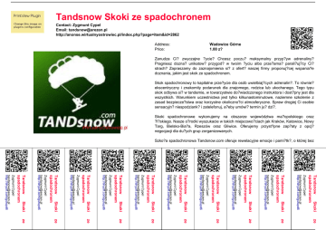 Tandsnow Skoki ze spadochronem Contact: Zygmunt Cypel Email: [email protected] http://anonse.wirtualnyostrowiec.pl/index.php?page=item&id=2862 Address: Price: Wadowice Górne 1.00 z? Zanudza Ci? zwyczajne ?ycie? Chcesz poczu? maksymalny przyp?yw adrenaliny? Pragniesz dozna? unikatow? przygod? w twoim ?yciu albo prze?ama? parali?uj?cy Ci? strach? Zapraszamy do zaznajomienia si? z ofert? naszej firmy proponuj?cej wspania?e doznania, jakim jest skok ze spadochronem. Skok spadochronowy to kapitalne prze?ycie dla osób uwielbiaj?cych adrenalin?. To równie? ekscentryczny i znakomity podarunek dla znajomego, rodzica lub ukochanego. Tego typu skok odbywa si? w tandemie, w towarzystwie do?wiadczonego instruktora i dost?pny jest dla wszystkich. Warunkiem uczestnictwa jest tylko kilkunastominutowe, naziemne szkolenie z zasad bezpiecze?stwa oraz korzystne okoliczno?ci atmosferyczne. Spraw drogiej Ci osobie sensacyjn? niespodziank? i zatelefonuj, a?eby umówi? termin ju? dzi?. Skoki spadochronowe wykonujemy na obszarze województwa ma?opolskiego oraz ?l?skiego. Nasze o?rodki wyszukacie w takich miejscowo?ciach jak Kraków, Katowice, Nowy Targ, Bielsko-Bia?a, Rzeszów oraz Gliwice. Oferujemy przyst?pne zap?aty z opcj? negocjacji dla du?ych grup zorganizowanych. Szko?a spadochronowa Tandsnow.com oferuje rewelacyjne emocje i pami?tk?, o której bez Tandsnow Skoki spadochronem Zygmunt Cypel [email protected] http://tinyurl.com/gurupd6 Tandsnow Skoki spadochronem Zygmunt Cypel [email protected] http://tinyurl.com/gurupd6 Tandsnow Skoki spadochronem Zygmunt Cypel [email protected] http://tinyurl.com/gurupd6 Tandsnow Skoki spadochronem Zygmunt Cypel [email protected] http://tinyurl.com/gurupd6 Tandsnow Skoki spadochronem Zygmunt Cypel [email protected] http://tinyurl.com/gurupd6 Tandsnow Skoki spadochronem Zygmunt Cypel [email protected] http://tinyurl.com/gurupd6 Tandsnow Skoki spadochronem Zygmunt Cypel [email protected] http://tinyurl.com/gurupd6 Tandsnow Skoki spadochronem Zygmunt Cypel [email protected] http://tinyurl.com/gurupd6 Tandsnow Skoki spadochronem Zygmunt Cypel [email protected] http://tinyurl.com/gurupd6 Tandsnow Skoki spadochronem Zygmunt Cypel [email protected] http://tinyurl.com/gurupd6 ze ze ze ze ze ze ze ze ze ze Powered by TCPDF (www.tcpdf.org)