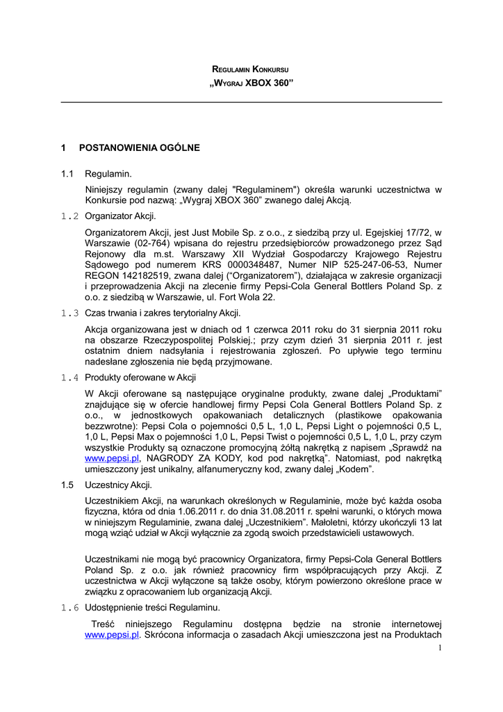 REGULAMIN KONKURSU „WYGRAJ XBOX 360” 1 1.1 POSTANOWIENIA OGÓLNE Regulamin. Niniejszy regulamin (zwany dalej "Regulaminem") określa warunki uczestnictwa w Konkursie pod nazwą: „Wygraj XBOX 360” zwanego dalej Akcją. 1.2 Organizator Akcji. Organizatorem Akcji, jest Just Mobile Sp. z o.o., z siedzibą przy ul. Egejskiej 17/72, w Warszawie (02-764) wpisana do rejestru przedsiębiorców prowadzonego przez Sąd Rejonowy dla m.st. Warszawy XII Wydział Gospodarczy Krajowego Rejestru Sądowego pod numerem KRS 0000348487, Numer NIP 525-247-06-53, Numer REGON 142182519, zwana dalej (“Organizatorem”), działająca w zakresie organizacji i przeprowadzenia Akcji na zlecenie firmy Pepsi-Cola General Bottlers Poland Sp. z o.o. z siedzibą w Warszawie, ul. Fort Wola 22. 1.3 Czas trwania i zakres terytorialny Akcji. Akcja organizowana jest w dniach od 1 czerwca 2011 roku do 31 sierpnia 2011 roku na obszarze Rzeczypospolitej Polskiej.; przy czym dzień 31 sierpnia 2011 r. jest ostatnim dniem nadsyłania i rejestrowania zgłoszeń. Po upływie tego terminu nadesłane zgłoszenia nie będą przyjmowane. 1.4 Produkty oferowane w Akcji W Akcji oferowane są następujące oryginalne produkty, zwane dalej „Produktami” znajdujące się w ofercie handlowej firmy Pepsi Cola General Bottlers Poland Sp. z o.o., w jednostkowych opakowaniach detalicznych (plastikowe opakowania bezzwrotne): Pepsi Cola o pojemności 0,5 L, 1,0 L, Pepsi Light o pojemności 0,5 L, 1,0 L, Pepsi Max o pojemności 1,0 L, Pepsi Twist o pojemności 0,5 L, 1,0 L, przy czym wszystkie Produkty są oznaczone promocyjną żółtą nakrętką z napisem „Sprawdź na www.pepsi.pl, NAGRODY ZA KODY, kod pod nakrętką”. Natomiast, pod nakrętką umieszczony jest unikalny, alfanumeryczny kod, zwany dalej „Kodem”. 1.5 Uczestnicy Akcji. Uczestnikiem Akcji, na warunkach określonych w Regulaminie, może być każda osoba fizyczna, która od dnia 1.06.2011 r. do dnia 31.08.2011 r. spełni warunki, o których mowa w niniejszym Regulaminie, zwana dalej „Uczestnikiem”. Małoletni, którzy ukończyli 13 lat mogą wziąć udział w Akcji wyłącznie za zgodą swoich przedstawicieli ustawowych. Uczestnikami nie mogą być pracownicy Organizatora, firmy Pepsi-Cola General Bottlers Poland Sp. z o.o. jak również pracownicy firm współpracujących przy Akcji. Z uczestnictwa w Akcji wyłączone są także osoby, którym powierzono określone prace w związku z opracowaniem lub organizacją Akcji. 1.6 Udostępnienie treści Regulaminu. Treść niniejszego Regulaminu dostępna będzie na stronie internetowej www.pepsi.pl. Skrócona informacja o zasadach Akcji umieszczona jest na Produktach 1 oraz pod numerem infolinii 022 39 74 999. Koszt połączenia z numerem infolinii ponosi Uczestnik, zgodnie z Taryfą swojego operatora. Godziny działania infolinii zostaną podane na stronie www.pepsi.pl 1.7 Uczestnicy Akcji dokonując zgłoszenia w Akcji wyrażają też zgodę na otrzymywanie dodatkowych wiadomości SMS i e-mail związanych z Akcją. Organizator zastrzega sobie prawo wysłania do Uczestników Akcji SMSa z pytaniem dotyczącym zgody na przetwarzanie danych osobowych oraz na przesyłanie informacji marketingowych przez Organizatora, i firmę Pepsi-Cola General Bottlers Poland Sp. z o.o. po zakończeniu Akcji. 1.8 Nadzór nad przebiegiem Akcji, w tym potwierdzenie wyboru laureatów, rozpatrywanie reklamacji, sprawować będzie komisja nadzoru, którą powoła Organizator. 2 2.1 ZASADY ORGANIZACYJNE AKCJI Akcja składa się z następujących rodzajów aktywności: a. Konkursu o Nagrody Główne, w którym zadaniem Uczestników będzie udzielenie w jak najkrótszym czasie odpowiedzi na pytanie zadane przez Organizatora oraz spełnienie innych wymogów formalnych określonych niniejszym Regulaminem, (zwana dalej „Konkursem”); b. Promocji o charakterze sprzedaży premiowej, w ramach której, Uczestnicy, którzy zakupią Produkt i wyślą Kod lub Kody oraz spełnią inne wymogi formalne, określone niniejszym Regulaminem otrzymają nagrody gwarantowane, (zwana dalej „Promocją”). 2.2 Przystąpienie do Akcji następuje przy spełnieniu następujących warunków: a. zakupu, w okresie od dnia 1 czerwca 2011 roku, do dnia 31 sierpnia 2011 roku przynajmniej jednego Produktu; b. dokonanie prawidłowego zgłoszenia zakupu Produktu, będącego zgłoszeniem udziału w Akcji (dokonanie prawidłowej rejestracji Kodu), za pośrednictwem SMSa albo na stronie www.pepsi.pl, zwanego w dalszej części Regulaminu „Zgłoszeniem”; 3 ZASADY UDZIAŁU W PROMOCJI 3.1 Prawidłowe Zgłoszenie udziału w Promocji polega na: 3.1.1 Wysłaniu SMSa przez Uczestnika z telefonu komórkowego pod numer 70123, zawierającego w treści prawidłowy Kod, o którym mowa w punkcie 1.4 Regulaminu, zwana w dalszej części Regulaminu „Rejestracją SMS” 3.1.2 albo rejestracji Kodu na stronie www.pepsi.pl, zwana w dalszej części Regulaminu „Rejestracją przez www”: Do rejestracji Kodu na stronie niezbędne jest posiadanie konta w serwisie internetowym Pepsi. Aby założyć konto w serwisie internetowym Uczestnik musi wypełnić formularz rejestracyjny, poprzez podanie i zaakceptowanie wszystkich wskazanych danych. Po wypełnieniu formularza przez Uczestnika, na jego adres e-mail zostanie przesłany link. Wybranie linku uaktywni konto, na którym możliwe jest rejestrowanie Kodów. W celu zarejestrowania Kodu należy zalogować się na swoje konto w serwisie Pepsi poprzez wpisanie prawidłowego loginu i hasła ustalonego podczas rejestracji, a następnie należy wpisać poprawnie Kod. 2 3.2 Każdorazowo wysyłając SMS na numer 70123 Uczestnik ponosi koszt, w wysokości 0,5 PLN netto (0,62 zł. z VAT), również w przypadku wysłania SMSa o nieprawidłowej treści. 3.3 Każdy Kod rejestrowany przez Uczestnika jest tożsamy z otrzymaniem przez Uczestnika 1 punktu. 3.4 W Promocji będą brane pod uwagę tylko i wyłącznie prawidłowe Zgłoszenia, o których mowa 