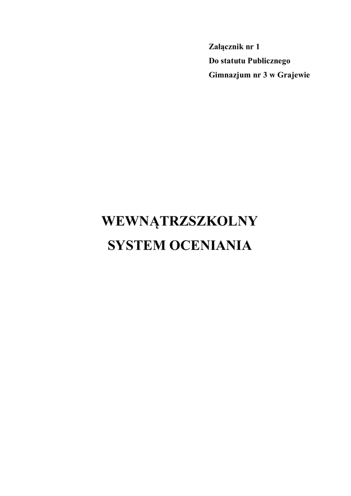 Załącznik nr 1 Do statutu Publicznego Gimnazjum nr 3 w Grajewie WEWNĄTRZSZKOLNY SYSTEM OCENIANIA 2 WSTĘP Wewnątrzszkolny system oceniania oparty jest na Rozporządzeniu Ministra Edukacji Narodowej i Sportu z dnia 30 kwietnia 2007 roku w sprawie warunków i sposobu oceniania, klasyfikowania i promowania uczniów i słuchaczy oraz przeprowadzania egzaminów i sprawdzianów w szkołach publicznych (Dz. U. Nr 83 poz. 562 z póź.zm.) Wewnątrzszkolny system oceniania określa zasady, formy i tryb oceniania, klasyfikowania i promowania uczniów Publicznego Gimnazjum nr 3 w Grajewie. Niniejszy dokument został ujednolicony i przyjęty Uchwałą nr 2/2010/2011 Rady Pedagogicznej z dnia 28 października 2010 r. 3 § 1. 1. 2. Wewnątrzszkolny system oceniania służy zaangażowaniu uczniów w system oceniania, rozwijaniu ich prawidłowej samooceny, odpowiedzialności za własne postępy oraz kształtowaniu takich postaw, jak : 1) gotowość poddania się ocenie; 2) odpowiedzialność za własne postępy i osiągnięcia; 3) poczucie własnej godności; 4) dążenie do doskonalenia; 5) samokrytyka; 6) rzetelność; 7) pracowitość; 8) kreatywność. Ocenianie wewnątrzszkolne ma na celu: 1) poinformowanie ucznia o poziomie jego osiągnięć edukacyjnych i postępach w tym zakresie; 2) pomoc uczniom w samodzielnym planowaniu swojego rozwoju; 3) motywowanie ucznia do dalszej pracy; 4) dostarczenie rodzicom (prawnym opiekunom) i nauczycielom informacji o postępach, trudnościach w uczeniu się oraz specjalnych uzdolnieniach ucznia; 5) umożliwienie nauczycielom doskonalenia organizacji i metod pracy dydaktyczno – wychowawczej. §2 OCENIANIE ŚRÓDROCZNE 1. Rok szkolny dzieli się na dwa semestry: I semestr trwa od 01 września do ferii zimowych ogłaszanych przez Kuratorium Oświaty w Białymstoku. II semestr kończy się wraz z zakończeniem roku szkolnego. 2. Ocena bieżąca i śródroczna klasyfikacyjna wyrażona jest stopniem według skali: 1) stopień celujący – 6 2) stopień bardzo dobry – 5 3) stopień dobry – 4 4) stopień dostateczny – 3 5) stopień dopuszczający – 2 6) stopień niedostateczny – 1 7) dopuszczalne jest stosowanie skrótów nazw stopni w sprawdzianach oraz w dzienniku lekcyjnym przy wystawianiu ocen na I semestr; oto skróty: celujący – cel. ;bardzo dobry – bdb.; dobry – db.; dostateczny – dst. ; dopuszczający – dop. ; niedostateczny – ndst. 8) przy ocenach cząstkowych dopuszcza się stawianie znaków „+” i „ -” 9) Wszystkie oceny są jawne zarówno dla uczniów, jak i dla rodziców (prawnych opiekunów). 10) Sprawdzone i ocenione pisemne prace kontrolne uczeń i jego rodzice otrzymują do wglądu na warunkach określonych przez nauczycieli. 11) Nauczyciel przechowuje prace pisemne ucznia przez cały bieżący rok szkolny. 12)Na prośbę ucznia lub jego rodziców nauczyciel ustalający ocenę powinien ją uzasadnić. 3. Wyniki wszelkich sprawdzianów punktowanych (testy) ustala się, przeliczając procentowo wykonanie zadań na poszczególne stopnie według następującej skali: cel. – 100 % bdb. – 99 % - 90% db. – 89% - 75% dst. – 74% - 50% dop. – 49% - 30% ndst. – 29% 4. Uczeń ma prawo do poprawy ocen cząstkowych. Zasady poprawy oceny cząstkowej określają przedmiotowe systemy oceniania. 4 § 3. 1. Nauczyciel jest zobowiązany na podstawie opinii publicznej lub niepublicznej poradni psychologiczno– pedagogicznej lub innej poradni specjalistycznej, dostosować wymagania edukacyjne do indywidualnych potrzeb ucznia, u którego stwierdzono trudności w uczeniu się, w tym specyficzne trudności, uniemożliwiające sprostanie tym wymaganiom. 2. Przy ustaleniu oceny z wychowania fizycznego, techniki, plastyki, muzyki , zajęć artystycznych i zajęć technicznych należy w szczególności brać pod uwagę wysiłek wkładany przez ucznia w wywiązaniu się z obowiązków wynikających ze specyfiki tych zajęć. 3. Dyrektor szkoły zwalnia ucznia z zajęć wychowania fizycznego i informatyki na podstawie opinii o ograniczonych możliwościach uczestniczenia ucznia w tych zajęciach, wydanej przez lekarza, oraz na czas określony w tej opinii. Jeżeli okres zwolnienia ucznia z tych zajęć uniemożliwia ustalenie śródrocznej lub rocznej oceny klasyfikacyjnej, w dokumentacji przebiegu nauczania zamiast oceny klasyfikacyjnej wpisuje się „zwolniony/a” 4. Na podstawie opinii publicznej poradni psychologiczno – pedagogicznej lub innej poradni specjalistycznej oraz na pisemny wniosek rodziców, dyrektor szkoły zwalnia ucznia z wadą słuchu , głęboką dysleksją rozwojową, afazją, z niepełnosprawnościami sprzężonymi lub autyzmem, w tym z zespołem Aspergera, z nauki drugiego języka obcego. Zwolnienie może dotyczyć części lub całego okresu kształcenia w danym typie szkoły. 5. Dyrektor szkoły na podstawie orzeczenia o potrzebie kształcenia specjalnego albo indywidualnego nauczania zwalnia ucznia z nauki drugiego języka. 6. Nauczyciel przedmiotu ma prawo jako ocenę cząstkową wpisać ocenę za wykonaną pracę ucznia w ramach projektu edukacyjnego, biorąc pod uwagę np. zawartość merytoryczną pracy, wizualną stronę prezentacji, umiejętności językowe wykazane podczas prezentowania rezultatów projektu lub inne umiejętności wykazane przez ucznia w pracy nad projektem. § 4. SPOSOBY INFORMOWANIA RODZICÓW I UCZNIÓW O POSTĘPACH W NAUCE I ZACHOWANIU ORAZ O WYNIKACH KLASYFIKACJI ŚRÓDROCZNEJ. 1. W ciągu semestru organizowane są spotkania z rodzicami w celu przekazania informacji o osiągnięciach uczniów . Nauczyciel wychowawca ma obowiązek poinformować uczniów i rodziców o ogólnych zasadach poprawiania ocen cząstkowych i klasyfikacyjnych , w tym także o warunkach i trybie uzyskania wyższej niż przewidywana rocznej oceny klasyfikacyjnej zachowania oraz o skutkach ustalenia uczniowi nagannej rocznej oceny klasyfikacyjnej zachowania. 2. Fakt ten musi być odnotowany w dzienniku lekc