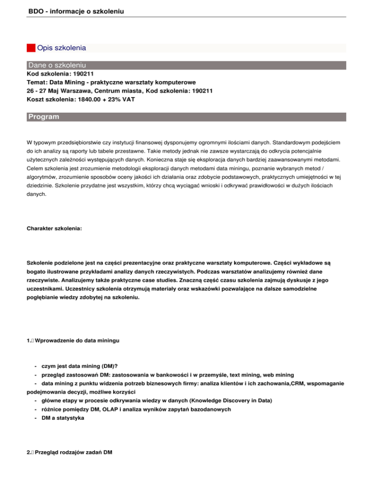 BDO - informacje o szkoleniu Opis szkolenia Dane o szkoleniu Kod szkolenia: 190211 Temat: Data Mining - praktyczne warsztaty komputerowe 26 - 27 Maj Warszawa, Centrum miasta, Kod szkolenia: 190211 Koszt szkolenia: 1840.00 + 23% VAT Program W typowym przedsiębiorstwie czy instytucji finansowej dysponujemy ogromnymi ilościami danych. Standardowym podejściem do ich analizy są raporty lub tabele przestawne. Takie metody jednak nie zawsze wystarczają do odkrycia potencjalnie użytecznych zależności występujących danych. Konieczna staje się eksploracja danych bardziej zaawansowanymi metodami. Celem szkolenia jest zrozumienie metodologii eksploracji danych metodami data miningu, poznanie wybranych metod / algorytmów, zrozumienie sposobów oceny jakości ich działania oraz zdobycie podstawowych, praktycznych umiejętności w tej dziedzinie. Szkolenie przydatne jest wszystkim, którzy chcą wyciągać wnioski i odkrywać prawidłowości w dużych ilościach danych. Charakter szkolenia: Szkolenie podzielone jest na części prezentacyjne oraz praktyczne warsztaty komputerowe. Części wykładowe są bogato ilustrowane przykładami analizy danych rzeczywistych. Podczas warsztatów analizujemy również dane rzeczywiste. Analizujemy także praktyczne case studies. Znaczną część czasu szkolenia zajmują dyskusje z jego uczestnikami. Uczestnicy szkolenia otrzymują materiały oraz wskazówki pozwalające na dalsze samodzielne pogłębianie wiedzy zdobytej na szkoleniu. 1. Wprowadzenie do data miningu - czym jest data mining (DM)? - przegląd zastosowań DM: zastosowania w bankowości i w przemyśle, text mining, web mining - data mining z punktu widzenia potrzeb biznesowych firmy: analiza klientów i ich zachowania,CRM, wspomaganie podejmowania decyzji, możliwe korzyści - główne etapy w procesie odkrywania wiedzy w danych (Knowledge Discovery in Data) - różnice pomiędzy DM, OLAP i analiza wyników zapytań bazodanowych - DM a statystyka 2. Przegląd rodzajów zadań DM BDO - informacje o szkoleniu - klasyfikacja - analiza skupień - odkrywanie reguł asocjacyjnych - redukcja wymiaru 3. Przygotowanie danych do analiz metodami data mining - analiza jakości danych - obserwacje brakujące i nietypowe - czyszczenie danych - przekształcenia wstępne 4. Przegląd metod stosowanych w DM - klasyfikacja metod/algorytmów; uczenie z nadzorem i uczenie bez nadzoru - metody klasyfikacji (drzewa klasyfikacyjne, metoda najbliższego sąsiada (k-NN)) - algorytmy analizy skupień (metoda k-średnich, metody hierarchiczne) - techniki redukcji wymiaru (metoda składowych głównych (PCA), skalowanie wielowymiarowe(MDS)) - metody odkrywania reguł asocjacyjnych (algorytm apriori) 5. Wybrane metody wizualizacji i eksploracyjna analiza danych (EDA) - analiza graficzna jednowymiarowa i wielowymiarowa - podstawowe wykresy analizy opisowej - zaawansowane algorytmy stosowane w wizualizacji danych wielowymiarowych - czym jest EDA? - metody stosowane w EDA6. Wybór najlepszych cech i optymalnego modelu/algorytmu - wybór istotnych cech (atrybutów) - ogólne reguły związane z wyborem modelu - problem przeuczenia (overfitting) - kompromis pomiędzy złożonością struktury modelu, a jego efektywnością - ocena efektywności zastosowanej metody/algorytmu 7. Prowadzenie projektów DM - popularne metodologie prowadzenia projektów DM: - Virtuous Cycle of Data Mining BDO - informacje o szkoleniu - CRISP-DM - wskazówki praktyczne 8. Case studies - przykłady typowych zadań DM na bazie wybranych problemów praktycznych 9. Dyskusja: możliwe korzyści biznesowe związane z zastosowaniem analiz data mining - dyskusja z uczestnikami szkolenia na temat przydatności i możliwości zastosowania metod dataminingu w analizie problemów spotykanych w ich praktyce zawodowej Prowadzący Informacje organizacyjne Kalendarz zajęć: Informacje i zgłoszenia