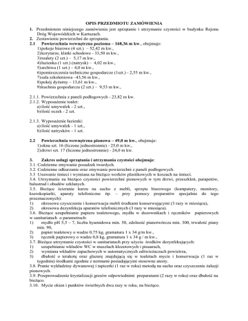 OPIS PRZEDMIOTU ZAMÓWIENIA 1. Przedmiotem niniejszego zamówienia jest sprzątanie i utrzymanie czystości w budynku Rejonu Dróg Wojewódzkich w Kartuzach. 2. Zestawienie powierzchni do sprzątania. 2.1 Powierzchnia wewnętrzna pozioma – 168,36 m kw., obejmuje: 1) pokoje biurowe (4 szt.) – 52,42 m kw., 2) korytarze, klatki schodowe - 33,50 m kw., 3) toalety (2 szt.) – 5,17 m kw., 4) łazienka (1 szt.) (natrysk) – 4,02 m kw., 5) archiwa (1 szt.) – 4,0 m kw., 6) pomieszczenia techniczne gospodarcze (1szt.) - 2,55 m kw., 7) sala szkoleniowa –43,56 m kw., 8) pokój dyżurny – 13,61 m kw., 9) kuchnia gospodarcza (2 szt.) – 9,53 m kw., 2.1.1. Powierzchnia z paneli podłogowych - 23,82 m kw. 2.1.2. Wyposażenie toalet: a) ilość umywalek - 2 szt., b) ilość oczek - 2 szt. 2.1.3. Wyposażenie łazienki: a) ilość umywalek - 1 szt., b) ilość natrysków - 1 szt. 2.2 Powierzchnia wewnętrzna pionowa – 49,0 m kw., obejmuje: 1) okna szt. 16 (liczone jednostronnie) - 25,0 m kw., 2) drzwi szt. 17 (liczone jednostronnie) - 24,0 m kw. 3. Zakres usługi sprzątania i utrzymania czystości obejmuje: 3.1. Codzienne zmywanie posadzek twardych. 3.2. Codzienne odkurzanie oraz zmywanie powierzchni z paneli podłogowych. 3.3 Usuwanie śmieci i wymiana na bieżąco worków plastikowych w koszach na śmieci. 3.4. Utrzymanie na bieżąco czystości powierzchni pionowych w tym drzwi, przeszkleń, parapetów, balustrad i obudów szklanych. 3.5. Bieżące ścieranie kurzu na sucho z mebli, sprzętu biurowego (komputery, monitory, kserokopiarki, aparaty telefoniczne itp. – przy pomocy preparatów specjalnie do tego przeznaczonych): 1) okresowe czyszczenie i konserwacja mebli środkami konserwującymi (3 razy w miesiącu), 2) okresowa dezynfekcja aparatów telefonicznych (3 razy w miesiącu). 3.6. Bieżące uzupełnianie papieru toaletowego, mydła w dozownikach i ręczników papierowych w sanitariatach o parametrach: 1) mydło pH 5,5 – 7, liczba hyamidowa min. 50, zdolność pianotwórcza min. 300, trwałość piany min. 90, 2) papier toaletowy o wadze 0,75 kg, gramatura 1 x 34 g/m kw., 3) ręcznik papierowy o wadze 0,8 kg, gramatura 1 x 34 g / m kw., 3.7. Bieżące utrzymanie czystości w sanitariatach przy użyciu środków dezynfekujących: 1) uzupełnianie wkładów WC w muszlach klozetowych i pisuarach, 2) wymiana wkładów zapachowych w automatycznych odświeżaczach powietrza, 3) dbałość o terakotę oraz glazurę znajdującą się w toaletach mycie i konserwacja (1 raz w tygodniu) środkami zgodnie z normami posiadającymi stosowne atesty. 3.8. Pranie wykładziny dywanowej i tapicerki (1 raz w roku) metodą na sucho oraz czyszczenie żaluzji pionowych. 3.9. Przeprowadzenie krystalizacji gresów odpowiednimi preparatami (2 razy w roku) oraz dbałość na bieżąco. 3.10. Mycie okien i punktów świetlnych dwa razy w roku, na bieżąco. 4. 4.1. Wykonawca zobowiązany jest zapewnić: Niezbędną ilość osób (wykonujących usługę) tak, aby przebiegała ona sprawnie i dokładnie, a wszelkie prace odbyły się od godz. 13:00 do godz. 15:00, 4.2. Stosowanie, przy wykonywaniu usługi, tylko środków spełniających łącznie: 1) posiadających stosowne atesty, 2) najwyższej jakości (pierwsza klasa jakości), 3) które powinny być stosowane zgodnie z właściwymi normami. 4.3. Wykonywać usługi sprzątania i utrzymania czystości wybranych pomieszczeń (ze względu na ich specyfikę) zgodnie z instrukcją ustaloną przez Kierownika Rejonu i wykonywać prace (związane z utrzymanie czystości) wskazane przez pracowników służb administracyjnogospodarczych. 4.4 Wykonawca zobowiązany jest zapewnić, aby osoby świadczące usługi sprzątania i utrzymania czystości zostały zobowiązane do: 1) zachowania tajemnicy służbowej (dotyczy wszelkich informacji uzyskanych w związku z wykonywaniem usługi), 2) sprawdzenia poprawności zamknięcia wszystkich okien oraz sprawdzenia czy odbiorniki elektryczne włączone do sieci prądowej nie zagrażają bezpieczeństwu p. pożarowemu. 5. Zamawiający informuje, że: 5.1. Koszt niezbędnej energii elektrycznej i wody użytej do realizacji przedmiotu zamówienia pokryje Zamawiający. 5.2. Osoby świadczące usługę w imieniu Wykonawcy zobowiązani są znał przepisy BHP ora przepisy dotyczące ochrony zdrowia i ochrony p .poż .Osoby te zostaną ponadto zapoznane z przepisami BHP i p. poż. obowiązującymi na terenie Rejonu Dróg w Kartuzach i zostaną zobowiązane do ich przestrzegania. 5.3. Wykonawca wyznaczy osobę upoważnioną do bezpośrednich kontaktów z Zamawiającym w miejscu świadczenia usługi oraz koordynatora do spraw BHP zgodnie z art. 208 § 1 KP. 5.4. Wykonawca zobowiązany zapewnić do realizowania usługi, zgodnie z przedmiotem niniejszego zamówienia, w niezbędnych ilościach i o odpowiednich parametrach użytkowych: kompletny niezbędny sprzęt, urządzenia i środki (w szczególności środki, o których mowa w pkt. 3.3, pkt. 3.5, pkt. 3.6, pkt. 3.7, pkt. 3.9, Opisu Przedmiotu Zamówienia). 5.5 W przypadku korzystania z aparatów telefonicznych przez osoby świadczące usługi w imieniu Wykonawcy, Zamawiający kosztami rozmów telefonicznych obciąży Wykonawcę. SPOSÓB OBLICZENIA CENY OFERTY 6. Cena oferty musi być wyrażona w złotych polskich i obejmować wykonanie przedmiotu niniejszego postępowania na warunkach określonych w Opisie Przedmiotu Zamówienia. Cena oferty wyrażona w postaci zapisu cyfrowego musi być zgodna z ceną wyrażoną w zapisie słownym, zarówno co do złotych jaki i groszy polskich. 7. Wykonawca w ofercie winien przedstawić cenę kompletną, jednoznaczną i ostateczną, łącznie z podatkiem VAT naliczonym zgodnie z obowiązującymi przepisami w tym zakresie oraz zgodnie ze sposobem narzuconym tabelę określona w Formularzu cenowym. 8. Zamawiający informuje, że ewentualne wszelkie rabaty, bonifikaty, promocje upusty, itp. Wykonawca musi uwzględnił w taki sposób, aby oferta cen