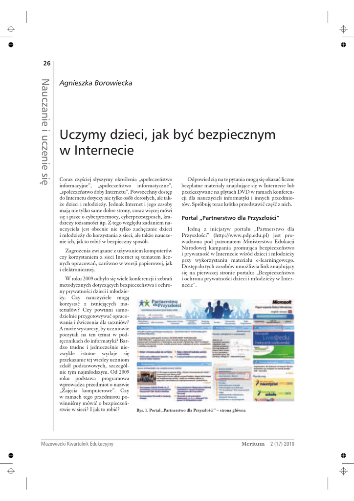 26 Agnieszka Borowiecka Nauczanie i uczenie siê Agnieszka Borowiecka Uczymy dzieci, jak byæ bezpiecznym w Internecie Coraz częściej słyszymy określenia „społeczeństwo informacyjne”, „społeczeństwo informatyczne”, „społeczeństwo doby Internetu”. Powszechny dostęp do Internetu dotyczy nie tylko osób dorosłych, ale także dzieci i młodzieży. Jednak Internet i jego zasoby mają nie tylko same dobre strony, coraz więcej mówi się i pisze o cyberprzemocy, cyberprzestępcach, kradzieży tożsamości itp. Z tego względu zadaniem nauczyciela jest obecnie nie tylko zachęcanie dzieci i młodzieży do korzystania z sieci, ale także nauczenie ich, jak to robić w bezpieczny sposób. Zagrożenia związane z używaniem komputerów czy korzystaniem z sieci Internet są tematem licznych opracowań, zarówno w wersji papierowej, jak i elektronicznej. Odpowiedzią na te pytania mogą się okazać liczne bezpłatne materiały znajdujące się w Internecie lub przekazywane na płytach DVD w ramach konferencji dla nauczycieli informatyki i innych przedmiotów. Spróbuję teraz krótko przedstawić część z nich. Portal „Partnerstwo dla Przysz³oœci” Jedną z inicjatyw portalu „Partnerstwo dla Przyszłości” (http://www.pdp.edu.pl) jest prowadzona pod patronatem Ministerstwa Edukacji Narodowej kampania promująca bezpieczeństwo i prywatność w Internecie wśród dzieci i młodzieży przy wykorzystaniu materiału e-learningowego. Dostęp do tych zasobów umożliwia link znajdujący się na pierwszej stronie portalu: „Bezpieczeństwo i ochrona prywatności dzieci i młod zieży w Internecie”. W roku 2009 odbyło się wiele konferencji i zebrań metodycznych dotyczących bezpieczeństwa i ochrony prywatności dzieci i młodzieży. Czy nauczyciele mogą korzystać z istniejących materiałów? Czy powinni samodzielnie przygotowywać opracowania i ćwiczenia dla uczniów? A może wystarczy, by uczniowie poczytali na ten temat w podręcznikach do informatyki? Bardzo trudne i jednocześnie niezwykle istotne wydaje się przekazanie tej wiedzy uczniom szkół podstawowych, szczególnie tym najmłodszym. Od 2009 roku podstawa programowa wprowadza przedmiot o nazwie „Zajęcia komputerowe”. Czy w ramach tego przedmiotu powinniśmy mówić o bezpieczeństwie w sieci? I jak to robić? Rys. 1. Portal „Partnerstwo dla Przyszłości” – strona główna Mazowiecki Kwartalnik Edukacyjny Meritum 2 (17) 2010 27 Uczymy dzieci, jak byæ bezpiecznym w Internecie Materiały zawarte w poradniku powstały w oparciu o witrynę internetową „Bezpieczeństwo informacji dla szkół” założoną w roku 2005 w związku z obchodami fińskiego Dnia Bezpieczeństwa Informacji (http://www.tietoturvakoulu.fi). - Nowi przyjaciele Ani – netykieta, publikowanie w sieci i prawa autorskie; 2. Uczniowie w wieku 13-16 lat - Rzymska grupa – ochrona praw autorskich, ochrona komputera i znaczenie haseł; - Kłopoty i incydenty – poprawność informacji publikowanych w Internecie, odpowiedzialność za publikowane zdjęcia i tekst, poznawanie ludzi w sieci, sieci peer-to-peer. Do obejrzenia historii niezbędne jest zainstalowanie oprogramowania Flash. Nauczanie i uczenie siê Po przejściu do części dotyczącej bezpieczeństwa w Internecie mamy dostęp do informacji o organizowanych konferencjach i konkursach związanych z tą tematyką, forum dyskusyjnego oraz poradnika „Bądź bezpieczny w Internecie” w wersji online i offline. Można stąd również pobrać materiały związane z projektem „3...2...1.. Internet”. Rys. 2. Menu działu „Bezpieczeństwo w Internecie” (Poradnik składa się z czterech części: materiałów dla uczniów (historyjki dla uczniów w wieku 7-12 lat, historyjki dla uczniów w wieku 13-16 lat), quizów, wskazówek dla nauczyciela oraz informacji dla rodziców i opiekunów. Rys. 4. Przykładowy slajd opowieści „Bezkresny las” Uczniowie mogą zapoznawać się z materiałami samodzielnie, w małych grupach lub wspólnie, pod okiem nauczyciela. Podczas oglądania prezentacji pojawiają się formularze, w których należy wskazać prawidłowe odpowiedzi. Każda odpowiedź jest komentowana. Rys. 3. Poradnik „Bądź bezpieczny w Internecie” Materiały dla uczniów zostały przygotowane w postaci czterech interaktywnych historyjek obrazkowych przedstawiających sytuacje, w jakich mogą się oni znaleźć, zwracających uwagę na zagadnienia związane z bezpieczeństwem i sprawdzających wiedzę uczniów związaną z prezentowaną tematyką: 1. Uczniowie w wieku 7-12 lat - Bezkresny las – czym jest Internet i co można w nim robić, konieczność obrony przed złymi aspektami sieci; Meritum 2 (17) 2010 Rys. 5. Przykładowy slajd opowieści „Rzymska grupa” Mazowiecki Kwartalnik Edukacyjny 28 Agnieszka Borowiecka Nauczanie i uczenie siê Quizy, podobnie jak historyjki obrazkowe, dostępne są w dwóch kategoriach wiekowych: pytania dla uczniów w wieku 7-10 lat lub w wieku 11-14 lat. Po wypełnieniu i zatwierdzeniu quizu do każdego z pytań pojawia się komentarz uzasadniający poprawność udzielonej odpowiedzi. Quizy również wymagają zainstalowania oprogramowania Flash. prezentacje (Flash) – przewodnik opracowany z wykorzystaniem materiałów dotyczących bezpiecznego korzystania z Internetu organizacji Childnet International. Rys. 8. Informacje dla rodziców i opiekunów Rys. 6. Fragment quizu dla uczniów w wieku 7-10 lat Kampania spo³eczna „Dziecko w Sieci” Kolejną grupę materiałów stanowią wskazówki dla nauczycieli. Pomagają one przypomnieć sobie podstawowe zagadnienia związane z bezpieczeństwem w sieci, prawem autorskim, terminologią związaną z usługami sieciowymi. Dostępne są także krótkie wskazówki dotyczące przeprowadzenia lekcji w oparciu o materiały udostępniane przez portal. Istniejąca od 1991 roku Fundacja Dzieci Niczyje jest organizacją pozarządową, której celem jest ochrona dzieci oraz pomoc 