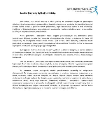 Łokieć (czy aby tylko) tenisisty. Bóle łokcia, tzw. łokieć tenisisty i łokieć golfisty to problemy dotykające przyczepów ścięgien mięśni poruszających nadgarstkiem. Badania statystyczne pokazują, że zawodowi tenisiści bardzo rzadko cierpią z powodu takich problemów, bądź stosunkowo szybko z nich wychodzą. Problemy ze ścięgnami dotyczą początkujących sportowców i osób mniej aktywnych – pracowników biurowych, majsterkowiczów, mechaników. Kiedy godzinami obciążamy nasze ścięgna powtarzającymi się zadaniami: praca śrubokrętem, klikanie myszką, itd. powstają mikronaderwania ścięgien przedramienia. Kiedy ból odczuwamy na zewnętrznej kostce okolic łokcia, jest to tzw. łokieć tenisisty, natomiast kiedy czujemy go od wewnątrz stawu, zespół ten nazwiemy łokciem golfisty. Po jednej stronie przyczepiają się mięśnie prostujące, po drugiej zginające nadgarstek. Sumujące się mikronaderwania, których wynikiem są blizny w ścięgnie, są bardzo podatne na kolejne uszkodzenia. Koło zamyka się. Kolejne maleńkie uszkodzenie i kolejna blizna doprowadzają do stanu tzw. zwyrodnienia ścięgna - tendinopatii. Miejsce to jest bolesne, kruche, słabo znoszące obciążenia. Jeśli ból jest ostry i uporczywy, wymaga niezwłocznej konsultacji lekarskiej i kompleksowej fizjoterapii. Kiedy natomiast nie odczuwamy bólu, a dużo pracujemy rękoma - wykonujemy w pracy precyzyjne ruchy nadgarstkiem, możemy prostymi sposobami przeciwdziałać przeciążeniom. Po pierwsze, częste rozciąganie mięśni przedramienia zapewnią im zwiększenie elastyczności. Po drugie, proste ćwiczenia wzmacniające te mięśnie, stosowane regularnie, są w stanie wzmocnić także strukturę ścięgien. Po trzecie, ogólnie pojęta zdrowa dieta zapewnia dostarczanie dobrego budulca dla ścięgien oraz usprawnia mechanizmy regeneracji uszkodzeń, a dostateczna podaż wody daje tkankom zwiększoną miękkość i elastyczność. Specyficznymi ćwiczeniami stosowanymi w przypadku tendinopatii, jest tak zwany trening ekscentryczny. Jest to środek posiadający dość bogate uzasadnienie naukowe. W przypadku tego rodzaju ćwiczeń warto skonsultować się z fizjoterapeutą, są to ćwiczenia trudne i wymagają instruktarzu.