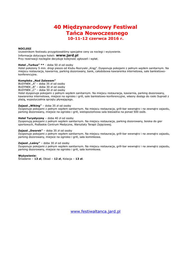 40 Międzynarodowy Festiwal Tańca Nowoczesnego 10-11-12 czerwca 2016 r. NOCLEGI Uczestnikom festiwalu przygotowaliśmy specjalne ceny za noclegi i wyżywienie. Informacje dotyczące hoteli: www.jard.pl Przy rezerwacji noclegów decyduje kolejność zgłoszeń i wpłat. Hotel „Turkus” ** - doba 50 zł od osoby Hotel położony 5 min. drogi pieszo od Klubu Rozrywki „Krąg”. Dysponuje pokojami z pełnym węzłem sanitarnym. Na miejscu restauracja, kawiarnia, parking dozorowany, bank, całodobowa kawiarenka internetowa, sale bankietowokonferencyjne. Kompleks „Nad Zalewem” BUDYNEK „A” – doba 35 zł od osoby BUDYNEK „B” – doba 30 zł od osoby BUDYNEK „C” – doba 50 zł od osoby Hotel dysponuje pokojami z pełnym węzłem sanitarnym. Na miejscu restauracja, kawiarnia, parking dozorowany, kawiarenka internetowa, miejsce na ognisko i grill, sale bankietowo-konferencyjne, własny dostęp do rzeki Supraśl z plażą, wypożyczalnia sprzętu pływającego. Zajazd „Wiking” – doba 35 zł od osoby Dysponuje pokojami z pełnym węzłem sanitarnym. Na miejscu restauracja, grill-bar wewnątrz i na zewnątrz zajazdu, parking dozorowany, miejsce na ognisko i grill, wielopoziomowa sala biesiadna na ponad 500 osób. Hotel Turystyczny – doba 40 zł od osoby Dysponują pokojami z pełnym węzłem sanitarnym. Na miejscu restauracja, parking dozorowany, boiska do gier sportowych, Podlaskie Centrum Medyczne, Warsztaty Terapii Zajęciowej. Zajazd „Dworek” – doba 35 zł od osoby Dysponuje pokojami z pełnym węzłem sanitarnym. Na miejscu restauracja, grill-bar wewnątrz i na zewnątrz zajazdu, parking dozorowany, miejsce na ognisko i grill, sala kominkowa. Zajazd „Leśny” – doba 30 zł od osoby Dysponuje pokojami z pełnym węzłem sanitarnym. Na miejscu restauracja, grill-bar wewnątrz i na zewnątrz zajazdu, parking dozorowany, miejsce na ognisko i grill, sala kominkowa. Wyżywienie: Śniadanie – 13 zł, Obiad – 12 zł, Kolacja – 13 zł. www.festiwaltanca.jard.pl PLAN FESTIWALU 10 czerwca – piątek 13.00 PRÓBY PARKIETU UROCZYSTE OTWARCIE FESTIWALU GODZ. 15.00 ROZPOCZĘCIE CZĘŚCI KONKURSOWEJ DISCO DANCE SOLO DO LAT 11 — FINAŁ DISCO DANCE SOLO DO LAT 15 — FINAŁ DISCO DANCE SOLO POWYŻEJ LAT 15 - 0 DISCO DANCE DUETY DO LAT 11 — FINAŁ DISCO DANCE DUETY DO LAT 15- FINAŁ DISCO DANCE DUETY POWYŻEJ LAT 15 — 0 HIP HOP SOLO DO LAT 11 — ELIMINACJE HIP HOP SOLO DO LAT 15 — ½ FINAŁU HIP HOP SOLO POWYŻEJ LAT 15 — FINAŁ HIP HOP DUETY DO LAT 11 — ½ FINAŁU HIP HOP DUETY DO LAT 15 — FINAŁ HIP HOP DUETY POWYŻEJ LAT 15 - FINAŁ BELLY DANCE OPEN – FINAŁ 11 czerwca – sobota 8.30 PRÓBY PARKIETU 10.00 ROZPOCZĘCIE CZĘŚCI KONKURSOWEJ INNE FORMY TAŃCA SOLO DO LAT 11- FINAŁ INNE FORMY TAŃCA SOLO DO LAT 15- ½ FINAŁU INNE FORMY TAŃCA SOLO POWYŻEJ LAT 15 - FINAŁ INNE FORMY TAŃCA DUETY DO LAT 11- FINAŁ INNE FORMY TAŃCA DUETY DO LAT 15 — FINAŁ INNE FORMY TAŃCA DUETY POWYŻEJ LAT 15 – FINAŁ DISCO DANCE MINI FORMACJE DO LAT 11 — FINAŁ DISCO DANCE MINI FORMACJE DO LAT 15- FINAŁ DISCO DANCE MINI FORMACJE POWYŻEJ LAT 15 - FINAŁ HIP HOP MINI FORMACJE DO LAT 11 — FINAŁ HIP HOP MINI FORMACJE DO LAT 15- FINAŁ HIP HOP MINI FORMACJE POWYŻEJ LAT 15- FINAŁ INNE FORMY TAŃCA MINI FORMACJE DO LAT 11- FINAŁ INNE FORMY TAŃCA MINI FORMACJE DO LAT 15 — FINAŁ INNE FORMY TAŃCA MINI FORMACJE POWYŻEJ LAT 15- FINAŁ GODZ. 14.00 – 14.30 – PRZERWA OBIADOWA DEBIUTY FORMACJE DO LAT 8 — FINAŁ DEBIUTY FORMACJE 9-12 LAT – FINAŁ WARSZTATY TANECZNE BEZPOŚREDNIO PO CZĘŚĆ KONKURSOWEJ OK. 16.00 – WSTĘP WOLNY !!! 19.00 OGNISKO 20.00 DYSKOTEKA 12 czerwca – niedziela 9.30 PRÓBY PARKIETU 11.00 ROZPOCZĘCIE CZĘŚCI KONKURSOWEJ DISCO DANCE FORMACJE DO LAT 11 — FINAŁ DISCO DANCE FORMACJE DO LAT 15- FINAŁ DISCO DANCE FORMACJE POWYŻEJ LAT 15 - 0 HIP HOP FORMACJE DO LAT 11- FINAŁ HIP HOP FORMACJE DO LAT 15 — FINAŁ HIP HOP FORMACJE POWYŻEJ LAT 15- 0 INNE FORMY TAŃCA FORMACJE DO LAT 11- FINAŁ INNE FORMY TAŃCA FORMACJE DO LAT 15- FINAŁ INNE FORMY TAŃCA FORMACJE POWYŻEJ LAT 15 – FINAŁ OKOŁO GODZ. 14.00 * BIEG JUBILEUSZOWY NA 333 JARDY – NA TORACH BIEGOWYCH WOKÓŁ KOMPLEKSU „NAD ZALEWEM” W WASILKOWIE * UROCZYSTA GALA * TORT URODZINOWY * PODZIĘKOWANIA Z OKAZJI 40 FESTIWALU TAŃCA NOWOCZESNEGO * WRĘCZENIE NAGRÓD UCZESTNIKOM FESTIWALU * ZAKOŃCZENIE FESTIWALU SZCZEGÓŁOWY PROGRAM FESTIWALU DOSTĘPNY BĘDZIE OD 10 CZERWCA NA STRONIE INTERNETOWEJ www.festiwaltanca.jard.pl ATRAKCJE FESTIWALU: Dyskoteka dla uczestników Ognisko z kiełbaskami Pokazy teatrów tańca Pokazy taneczne Warsztaty taneczne POSTANOWIENIA KOŃCOWE Organizator zastrzega sobie, w przypadku niskiej frekwencji podmiotów startujących, łączenie kategorii wiekowych. Każdy uczestnik ma prawo startować tylko raz w danej kategorii tanecznej. Regulamin jest regulaminem wewnętrznym festiwalu (broniący się własnymi prawami). O kwestiach spornych dotyczących regulaminu rozstrzyga sędzia główny festiwalu. Organizator zastrzega sobie prawo do zmiany kolejności prezentacji w trakcie trwania festiwalu – (jest to związane z organizacją techniczną festiwalu). PO FINAŁACH KAŻDY UCZESTNIK JEST ZOBOWIĄZANY DO ZWROTU NUMERU STARTOWEGO DO BIURA FESTIWALU. Kompleks „Nad Zalewem” Wasilków k/Białegostoku, ul. Białostocka 94-98, tel. 85 7185 240 www.festiwaltanca.jard.pl