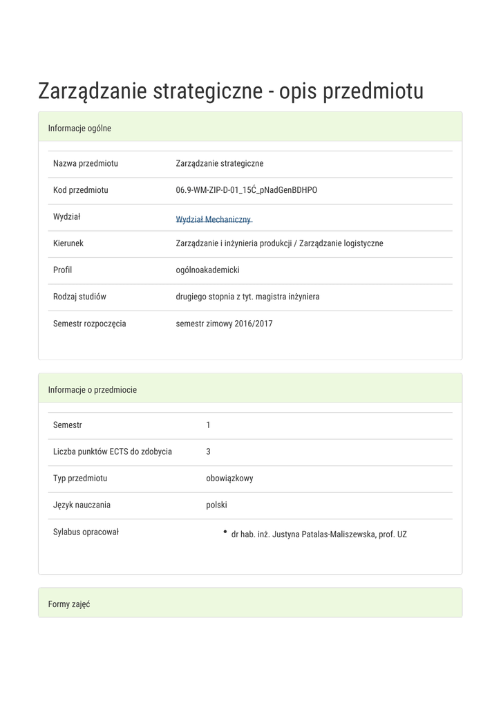 Zarządzanie strategiczne - opis przedmiotu Informacje ogólne Nazwa przedmiotu Zarządzanie strategiczne Kod przedmiotu 06.9-WM-ZIP-D-01_15Ć_pNadGenBDHPO Wydział Wydział Mechaniczny Kierunek Zarządzanie i inżynieria produkcji / Zarządzanie logistyczne Profil ogólnoakademicki Rodzaj studiów drugiego stopnia z tyt. magistra inżyniera Semestr rozpoczęcia semestr zimowy 2016/2017 Informacje o przedmiocie Semestr 1 Liczba punktów ECTS do zdobycia 3 Typ przedmiotu obowiązkowy Język nauczania polski Sylabus opracował Formy zajęć dr hab. inż. Justyna Patalas-Maliszewska, prof. UZ Forma Liczba godzin w Liczba godzin w Liczba godzin w Liczba godzin w Forma zajęć semestrze tygodniu semestrze tygodniu zaliczenia (stacjonarne) (stacjonarne) (niestacjonarne) (niestacjonarne) 15 1 9 ,6 Ćwiczenia Zaliczenie na ocenę Wykład 15 1 9 ,6 Zaliczenie na ocenę Cel przedmiotu Głównym skutkiem kształcenia będzie poznanie metod i narzędzi analizy strategicznej oraz istoty formułowania i wdrażania strategii rozwoju przedsiębiorstwa. Wymagania wstępne Mikroekonomia, Podstawy zarządzania. Zakres tematyczny Przedmiot stanowi kompleksowe ujęcie znaczenia prowadzenia analizy strategicznej oraz formułowania strategii rozwoju dla przedsiębiorstwa. Pojęcie, geneza i rozwój zarządzania strategicznego, etapy zarządzania strategicznego, metodyka planowania strategicznego, wybrane metody i narzędzia analizy strategicznej: analiza otoczenia dalszego i bliższego (metoda Benchmarking, metoda 5 sił Portera, metoda PEST), analiza potencjału przedsiębiorstwa (cykl życia produktu, metody portfelowe: Macierz McKinsey’a, Macierz Hofer’a, Macierz BCG, analiza SWOT, bilans strategiczny), analiza SPACE. Przewaga konkurencyjna firmy: kluczowe kompetencje, rywalizacja w sektorze, mapa grup strategicznych, koncepcja gron, propozycja aliansów strategicznych dla firmy. Źródła informacyjne analizy strategicznej: budowanie i ochrona systemu informacji strategicznej w przedsiębiorstwie. Proces formułowania i wdrażania strategii rozwoju. W ramach ćwiczeń opracowywane są następujące zagadnienia: analiza otoczenia dalszego i bliższego: metoda Benchmarking, metoda 5 sił Portera, metoda PEST, analiza potencjału przedsiębiorstwa (cykl życia produktu, metody portfelowe: Macierz McKinsey’a, Macierz Hofer’a, Macierz BCG, bilans strategiczny), analiza SWOT, analiza SPACE Przewaga konkurencyjna firmy: kluczowe kompetencje, rywalizacja w sektorze, mapa grup strategicznych, koncepcja gron, propozycja aliansów strategicznych dla firmy. Metody kształcenia Wykład konwencjonalny. Ćwiczenia. Efekty kształcenia i metody weryfikacji osiągania efektów kształcenia Opis efektu Symbole Metody weryfikacji Forma zajęć efektów Posiada uporządkowaną i podbudowaną K_W08 kolokwium Wykład K_W14 kolokwium Wykład K_W16 kolokwium Wykład teoretycznie wiedzę w zakresie zarządzania strategicznego, a w szczególności: - roli strategii rozwoju firmy i ich rodzajów, - sporządzania planu strategicznego, - metod portfelowych, zintegrowanego procesu zarządzania strategicznego. Posiada uporządkowaną i podbudowaną teoretycznie wiedzę w zakresie zarządzania wiedzą. Definiuje etapy formułowania strategii, potrafi interpretować wyniki analizy strategicznej. Ma wiedzę o trendach rozwojowych i nowych osiągnięciach z zakresu zarządzania, np. budowanie przewagi konkurencyjnej przedsiębiorstwa w oparciu o kompetencje, budowanie mapy grup strategicznych, definiowanie propozycji aliansów strategicznych. Opis efektu Symbole Metody weryfikacji Forma zajęć efektów Potrafi analizować otoczenie dalsze i bliższe K_W19 kolokwium Wykład K_U01 kolokwium Ćwiczenia przedsiębiorstwa przemysłowego – np. budować model 5 sił Portera, zdefiniować i ocenić otoczenie dalsze za pomocą metody PEST. Potrafi pozyskiwać informacje z literatury, baz danych oraz innych źródeł dla potrzeb projekt przeprowadzenia analizy strategicznej. Potrafi pozyskiwać, integrować, interpretować, K_U04 wyciągać wnioski oraz formułować opinie, na kolokwium Ćwiczenia projekt podstawie materiałów reklamowych, pozyskanych z literatury, baz danych oraz innych nowoczesnych środków przekazywania informacji, tj. przeprowadzić analizę konkurencji za pomocą benchmarkingu. Potrafi biegle porozumiewać się przy użyciu różnych K_U08 technik w środowisku naukowym oraz w innych kolokwium Ćwiczenia projekt środowiskach, także w języku angielskim lub innym języku obcym uznawanym za język komunikacji międzynarodowej w Zarządzania i Inżynierii Produkcji. Ma świadomość ważności i zrozumienie pozatechnicznych aspektów i skutków działalności inżynierskiej, w tym odpowiedzialności za podejmowane decyzje – potrafi argumentować podejmowane decyzje strategiczne K_K02 kolokwium projekt Ćwiczenia Opis efektu Symbole Metody weryfikacji Forma zajęć efektów Potrafi myśleć i działać w sposób przedsiębiorczy – K_K06 kolokwium formułowanie strategii rozwoju dla firmy Ćwiczenia projekt Warunki zaliczenia Obciążenie pracą Obciążenie pracą Studia Studia niestacjonarne stacjonarne (w godz.) (w godz.) Godziny kontaktowe (udział w zajęciach; konsultacjach; egzaminie, itp.) 30 18 Samodzielna praca studenta (przygotowanie do: zajęć, kolokwium, 60 72 Łącznie 90 90 Punkty ECTS Studia Studia niestacjonarne egzaminu; studiowanie literatury przygotowanie: pracy pisemnej, projektu, prezentacji, raportu, wystąpienia; itp.) stacjonarne Zajęcia z udziałem nauczyciela akademickiego 1 1 Zajęcia bez udziału nauczyciela akademickiego 2 2 Łącznie 3 3 Literatura podstawowa Managing Knowledge Workers - Value Assesment, Methods, and Application tools, J.Patalas-Maliszewska, Springer Verlag, 2013 Determinanty rozwoju przedsiębiorstw w aspekcie zarzadzania Wiedzą, J.Patalas-Maliszewska, S.Kłos Oficyna Wydaw. Uniwersytetu Zielonogórskiego, 2008 Zarządzanie strategiczne. Koncepcje – metody. Red.