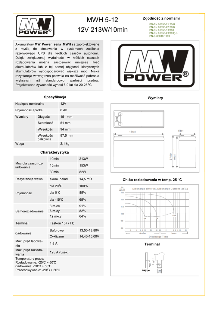 MWH 5-12 12V 213W/10min Zgodność z normami PN-EN 60896-21:2007 PN-EN 60896-22:2007 PN-EN 61056-1:2008 PN-EN 61056-2:2003(U) PN-E-83016:1999 Akumulatory MW Power seria MWH są zaprojektowane z myślą do stosowania w systemach zasilania rezerwowego UPS dla krótkich czasów autonomii. Dzięki zwiększonej wydajności w krótkich czasach rozładowania można zastosować mniejszą ilość akumulatorów lub z tej samej objętości klasycznych akumulatorów wygospodarować większą moc. Niska rezystancja wewnętrzna pozwala na możliwość pobrania większych niż standardowo wartości prądów. Projektowana żywotność wynosi 6-9 lat dla 20-25 oC Specyfikacja Napięcie nominalne 12V Pojemność aproks. 6 Ah Wymiary Długość 151 mm Szerokość 51 mm Wysokość 94 mm Wysokość całkowita 97,5 mm Waga Wymiary 2,1 kg Charakterystyka Moc dla czasu rozładowania Rezystancja wewn. Pojemność Samorozładowanie Terminal Ładowanie 10min 213W 15min 153W 30min 82W akum. naład. 14,5 mΩ dla 20oC 100% o dla 0 C 85% o dla -15 C 65% 3 m-ce 6 m-cy 91% 82% 12 m-cy 64% Ch-ka rozładowania w temp. 25 oC Fast-on 187 (T1) Buforowe 13,50-13,80V Cykliczne 14,40-15,00V Max. prąd ładowa1,8 A nia Max. prąd rozłado125 A (5sek.) wania Temperatury pracy: Rozładowanie: -20°C ÷ 50°C Ładowanie: -20°C ÷ 50°C Przechowywanie: -20°C ÷ 50°C Terminal Discharge Rates in Wa s to Various End Voltages at 25℃ End Voltage Time 11.10V 10.80V 10.50V 10.20V 9.90V 9.60V 5 min 351.2 373.3 383.2 388.7 391.0 393.7 10 min 189.8 201.8 207.1 210.1 211.3 212.7 15 min 137.1 145.0 148.8 150.8 151.7 152.7 30 min 72.9 77.1 79.1 80.2 80.7 81.2 60 min 44.1 45.3 46.3 46.6 47.1 47.3 120 min 23.2 23.9 24.4 24.6 24.8 25.0 180 min 18.7 19.2 19.6 19.7 19.9 20.0 240 min 15.0 15.4 15.7 15.9 16.0 16.1 300 min 12.8 13.1 13.4 13.5 13.6 13.7 600 min 7.5 7.7 7.9 8.0 8.0 8.1 4.0 4.1 4.1 4.2 4.2 4.2 11.10V 10.80V 10.50V 10.20V 9.90V 9.60V 31.36 16.50 11.67 6.13 3.69 1.94 1.55 1.24 1.05 0.62 0.33 33.33 17.54 12.34 6.48 3.79 1.99 1.59 1.27 1.08 0.64 0.33 34.22 18.01 12.66 6.65 3.87 2.03 1.63 1.30 1.11 0.65 0.34 34.71 18.27 12.83 6.74 3.90 2.05 1.64 1.31 1.11 0.66 0.34 34.91 18.37 12.91 6.78 3.94 2.07 1.65 1.32 1.12 0.66 0.35 35.15 18.50 13.00 6.82 3.96 2.08 1.66 1.33 1.13 0.67 0.35 1200 min Discharge Rates in Amperes to Various End Voltages at 25℃ End Voltage Time 5 min 10 min 15 min 30 min 60 min 120 min 180 min 240 min 300 min 600 min 1200 min