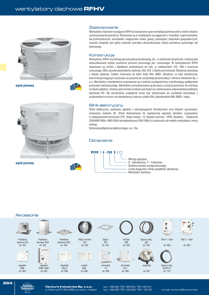wentylatory dachowe RFHV Zastosowanie Wentylatory dachowe wyciągowe RFHV przeznaczone są do wentylacji pomieszczeń o niskim stopniu zanieczyszczenia powietrza. Stosowane są w instalacjach wyciągowych z mieszkań, supermarketów, hal przemysłowych, warsztatów, magazynów, toalet, garaży, parkingów, budynków gospodarczych, również wszędzie tam gdzie zachodzi potrzeba ukierunkowania wylotu powietrza poziomego lub pionowego. Konstrukcja Wentylatory RFHV wyróżniają się hybrydową konstrukcją, tzn., w zależności od potrzeb, możliwe jest ukierunkowanie wylotu powietrza zarówno poziomego jak i pionowego. W wentylatorach RFHV stosowane są wirniki z łopatkami pochylonymi do tyłu: w wielkościach 125, 160 z tworzywa sztucznego, 200 z ocynkowanej blachy stalowej, 250, 315 z blachy aluminiowej. Obudowa wykonana z blachy stalowej. Całość malowana na kolor biały RAL 9002. Obudowy ze stali nierdzewnej, aluminiowej mogą być wykonane na życzenie po wcześniejszej konsultacji z Venture Industries Sp. z o.o. Wentylatory standardowo wyposażone są w króciec przyłączeniowy umożliwiający podłączenie przewodu wentylacyjnego. Wentylatory przystosowane są do pracy w pozycji pionowej, do montażu na dachu płaskim, możliwy jest montaż na dachu pochyłym po zastosowaniu odpowiedniej podstawy dachowej RS. Na zamówienie urządzenie może być dostarczone po wcześniej konsultacji z producentem w innym, niż standardowy, kolorze z palety RAL (standardowo RAL 9002 – biały). wylot pionowy Silnik elektryczny Silnik elektryczny wykonany zgodnie z obowiązującymi Dyrektywami oraz klasami sprawności, oznaczony znakiem CE. Silnik dostosowany do napięciowej regulacji obrotów, wyposażony w zabezpieczenie termiczne (TP). Klasa izolacji – B. Stopień ochrony - IP44. Zasilanie - trójfazowe 230/400V 50Hz, 400V 50Hz lub jednofazowe 230V 50Hz (w zależności od modelu wentylatora i mocy silnika). Schemat podłączenia elektrycznego: rys. 13a. Oznaczenia RFHV / 4 - 250 S / c Wersja specjalna S - jednofazowy, T - trójfazowy Średnica kanału przyłączeniowego Liczba biegunów silnika (prędkość obrotowa) Wentylator dachowy wylot poziomy Akcesoria Podstawa dachowa RS str. 322 regulator REB str. 852 Podstawa tłumiąca RSA str. 322 regulator RMB, RMT str. 852 Podstawa dachowa RSS str. 323 Klapa zwrotna JCA str. 324 Złącze JPA str. 324 higrostat HIG-2 str. 856 czujnik SQA str. 856 termostat TS str. 856 Króciec JBR str. 325 termostat TK-1 str. 856 Złącze p-drg. JAE str. 325 Reb 4 - Auto Reb 5 - Auto str. 853 str. 853 presostat złącze p-drg. ACOP PL str. 152 str. 857 264 Venture Industries Sp. z o.o. ul. Mokra 27, 05-092 Łomianki - Kiełpin tel. +48 22 751 95 50, 751 20 31 fax +48 22 751 22 59, 751 12 02 e-mail: [email protected] wentylatory dachowe RFHV Dane techniczne prędkość pobór mocy napięcie natężenie wydajność poziom ciśnienia temp. pracy masa klasa izolacji obrotowa max. max. akustycznego* max. / stopień [obr./min] [W] [V] [A] [m3/h] [dB(A)] [oC] [kg] ochrony IP Typ regulator nr artykułu RFHV/2-125 2640 75 230 0,35 510 64 60 8,5 B / 44 REB 1; RMB 1,5 43522410 RFHV/4-125 1430 34 230 0,16 290 46 60 8,5 B / 44 REB 1; RMB 1,5 43522415 RFHV/2-160 2700 85 230 0,43 695 72 65 9 B / 44 REB 1; RMB 1,5 43522420 RFHV/4-160 1430 40 230 0,21 540 49 55 9 B / 44 REB 1; RMB 1,5 43522425 RFHV/2-200 1850 260 230 1,1 1620 72 60 15 B / 44 REB 2,5; RMB 1,5 43522430 RFHV/4-200 1400 90 230 0,4 1260 56 55 15 B / 44 REB 1; RMB 1,5 43522440 RFHV/4-250S 1400 120 230 0,56 1540 59 60 21 B / 44 REB 1; RMB 1,5 43522450 RFHV/4-250T 1400 100 400Y 0,48 1540 59 60 21 B / 44 RMT 1,5 43522455 RFHV/6-250 965 37 230 0,18 890 59 60 21 B / 44 REB 1; RMB 1,5 43522460 RFHV/6-315 875 70 230 0,33 1690 61 60 29 F / 54 REB 1; RMB 1,5 43522480 * poziom ciśnienia akustycznego mierzony w odległości 1,5 m. Akcesoria montażowe RFHV 125-315 RFHV 125-315 RFHV 125-630 6 6 9 11 12 10 7 Typ Podst. Podst. Podst. dachowa dachowa tłumiąca krótka 1 2 3 5 Opaska przeciwdrganiowa 6 7 8 9 10 11 RFHV/X-125 RSS-300 RS-300 RSA-300 CAR-125 AKU-COMP-125 ACOP PL-125 SBF-135 VENTAL-127 P-300 K-300 JCA-300 JAE-300 RFHV/X-160 RSS-300 RS-300 RSA-300 CAR-160 AKU-COMP-160 ACOP PL-160 SBF-165 VENTAL-165 P-300 K-300 JCA-300 JAE-300 RFHV/X-200 RSS-435 RS-435 - - Klapa zwrotna 4 Przewód elastyczny Złącze Króciec Klapa zwrotna Złącze przeciwdrganiowe 12 - CAR-200 AKU-COMP-200 ACOP PL-200 SBF-215 VENTAL-203 - - - - - - ACOP PL-250 - VENTAL-254 P-300 K-435 JCA-435 JAE-435 JAE-435 RFHV/X-250 RSS-435 RS-435 RSA-435 CAR-250 - Opaska zaciskowa RSA-435 RFHV/X-315 RSS 560 RS-560 - Tłumik AKU-COMP-250 ACOP PL-250 SBF-325 VENTAL-254 P-435 K-435 JCA-435 - CAR-315 AKU-COMP-315 ACOP PL-315 SBF-325 VENTAL-315 - - - - RSA-560 - - ACOP PL-355 - VENTAL-356 P-435 K-560 JCA-560 JAE-560 www.venture.pl 265 wentylatory dachowe RFHV G D Wymiary [mm] oE oF cB cA cC Typ RFHV-125/160 A cB cC D OE OF G 340 300 245 160 125/160 10 20 RFHV-200/250 475 435 330 260 200/250 12 20 RFHV-315 610 560 450 365 315 12 40 Charakterystyki pracy Charakterystyki pracy wentylatorów dla wylotu powietrza poziomego, dla wylotu powietrza pionowego należy uwzględnić współczynnik korekcyjny 0,94. RFHV/2-125 RFHV/4-125 Ps [Pa] Ps [Pa] 360 140 320 120 280 100 240 200 80 160 60 120 40 80 20 40 0 0 100 200 300 400 500 600 3 Q [m /h] 0 0 50 100 150 200 250 300 3 Q [m /h] 266 Venture Industries Sp. z o.o. ul. Mokra 27, 05-092 Łomianki - Kiełpin tel. +48 22 751 95 50, 751 20 31 fax +48 22 751 22 59, 751 12 02 e-mail: [email protected] wentylatory dachowe RFHV Charakterystyki pracy Charakterystyki pracy wentylatorów dla wylotu powietrza poziomego, dla wylotu powietrza pionowego należy uwzględnić współczynnik korekcyjny 0,94. RFHV/2-160 RFHV/4-160 Ps [Pa] Ps [Pa] 450 160 400 140 350 120 300 100 250 80 200 60 150 40 100 20 50 0 0 0 200 400 600 800 0 Q [m3/h] 100 200 300 RFHV/2-200 400 500 600 Q [m3/h] 1200 1400 Q [m3/h] RFHV/4-200 Ps [Pa] Ps [Pa] 900 220 200 800 180