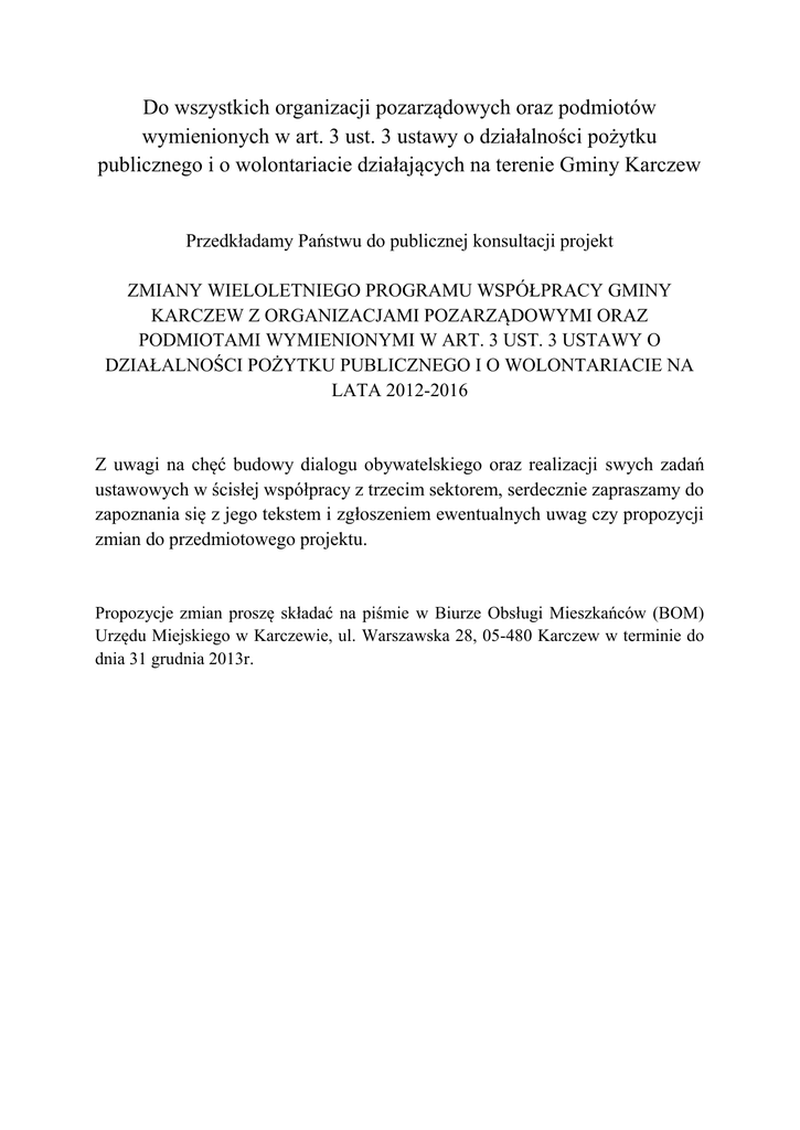 Do wszystkich organizacji pozarządowych oraz podmiotów wymienionych w art. 3 ust. 3 ustawy o działalności pożytku publicznego i o wolontariacie działających na terenie Gminy Karczew Przedkładamy Państwu do publicznej konsultacji projekt ZMIANY WIELOLETNIEGO PROGRAMU WSPÓŁPRACY GMINY KARCZEW Z ORGANIZACJAMI POZARZĄDOWYMI ORAZ PODMIOTAMI WYMIENIONYMI W ART. 3 UST. 3 USTAWY O DZIAŁALNOŚCI POŻYTKU PUBLICZNEGO I O WOLONTARIACIE NA LATA 2012-2016 Z uwagi na chęć budowy dialogu obywatelskiego oraz realizacji swych zadań ustawowych w ścisłej współpracy z trzecim sektorem, serdecznie zapraszamy do zapoznania się z jego tekstem i zgłoszeniem ewentualnych uwag czy propozycji zmian do przedmiotowego projektu. Propozycje zmian proszę składać na piśmie w Biurze Obsługi Mieszkańców (BOM) Urzędu Miejskiego w Karczewie, ul. Warszawska 28, 05-480 Karczew w terminie do dnia 31 grudnia 2013r. Projekt Uchwała Nr …...... Rady Miejskiej w Karczewie z dnia ….............. w sprawie zmiany wieloletniego programu współpracy Gminy Karczew z organizacjami pozarządowymi oraz podmiotami wymienionymi w art. 3 ust. 3 ustawy o działalności pożytku publicznego i o wolontariacie na lata 2012-2016 stanowiącego załącznik do Uchwały Nr XVI/115/2011 Rady Miejskiej w Karczewie z dnia 26 października 2011 roku w sprawie przyjęcia wieloletniego programu współpracy Gminy Karczew z organizacjami pozarządowymi oraz podmiotami wymienionymi w art. 3 ust. 3 ustawy o działalności pożytku publicznego i o wolontariacie na lata 2012-2016 Na podstawie art. 7 ust. 1 pkt 19 i art. 18 ust. 2 pkt 15 ustawy z dnia 8 marca 1990 r. o samorządzie gminnym (Dz. U. z 2013 r., poz. 594 ze zmianami) oraz art. 5a ust. 2 ustawy z dnia 24 kwietnia 2003 roku o działalności pożytku publicznego i o wolontariacie (Dz. U. z 2010 r., Nr 234, poz. 1536 ze zmianami) uchwala się, co następuje: § 1. 1. W paragrafie 5 ust. 2 załącznika do Uchwały Nr XVI/115/2011 Rady Miejskiej w Karczewie z dnia 26 października 2011 roku w sprawie przyjęcia wieloletniego programu współpracy Gminy Karczew z organizacjami pozarządowymi oraz podmiotami wymienionymi w art. 3 ust. 3 ustawy o działalności pożytku publicznego i o wolontariacie na lata 2012-2016 otrzymuje następujące brzmienie: „2. Współpraca Gminy Karczew z podmiotami programu obejmować będzie następujące priorytetowe zadania publiczne: 1) w dziedzinie wspierania i upowszechniania kultury fizycznej i sportu - pomoc w szkoleniu sportowym i przygotowanie do rozgrywek dzieci i młodzieży, wspieranie rozwoju i uzdolnień sportowych dzieci i młodzieży, upowszechnianie kultury fizycznej wśród dzieci i młodzieży, organizowanie imprez sportowych i sportowo-rekreacyjnych dla dzieci, młodzieży i seniorów z terenu miasta i gminy Karczew, wspieranie zadań realizowanych przez uczniowskie kluby sportowe; 2) w dziedzinie ratownictwa i ochrony ludności - szkolenie w ramach ratownictwa wodnego, organizowanie pomocy oraz ratowanie osób, które uległy wypadkom w zbiornikach wodnych, akwenach i rzekach znajdujących się na terenie miasta i gminy Karczew, zapobieganie utonięciom osób kąpiących się w zbiornikach wodnych, akwenach i rzekach znajdujących się na terenie miasta i gminy Karczew, podniesienie poziomu prewencji, rekultywacja akwenów wodnych znajdujących się na terenie miasta i gminy Karczew, prace proekologiczne z wędkarską młodzieżą, współdziałanie w zakresie organizacji akcji przeciwdziałania i usuwania skutków klęsk żywiołowych, katastrof naturalnych i awarii technicznych; 3) w dziedzinie pomocy społecznej, w tym pomocy rodzinom i osobom w trudnej sytuacji życiowej oraz wyrównywania szans tych rodzin i osób oraz przeciwdziałania uzależnieniom i patologiom społecznym – opieka wychowawcza dla dzieci, pomoc dzieciom w nauce, organizacja czasu wolnego dzieci poprzez organizowanie zabaw i zajęć sportowych, organizowanie zajęć dla dzieci pozwalających rozwijać ich zainteresowania i umiejętności, organizowanie zajęć socjoterapeutycznych, terapeutycznych, korekcyjnych, kompensacyjnych, psychologicznych, psychoprofilaktycznych dla dzieci (terapia pedagogiczna, psychologiczna i socjoterapia); 4) w dziedzinie działalności charytatywnej – organizacja czasu wolnego dla dzieci i młodzieży, organizacja integracyjnych turniejów środowiskowych dla dzieci i młodzieży pochodzących z rodzin dysfunkcyjnych i potrzebujących, udzielanie pomocy rzeczowej dzieciom i młodzieży pochodzącej z rodzin dysfunkcyjnych i potrzebujących w formie paczek żywnościowych i świątecznych, organizacja gier i zabaw o charakterze profilaktycznym, rekreacyjnym i sportowym.” 2. W paragrafie 5 ust. 3 załącznika do Uchwały Nr XVI/115/2011 Rady Miejskiej w Karczewie z dnia 26 października 2011 roku w sprawie przyjęcia wieloletniego programu współpracy Gminy Karczew z organizacjami pozarządowymi oraz podmiotami wymienionymi w art. 3 ust. 3 ustawy o działalności pożytku publicznego i o wolontariacie na lata 2012-2016 otrzymuje następujące brzmienie: „3. Finansowanie zadań publicznych zleconych do realizacji organizacjom pozarządowym oraz podmiotom wymienionym w art. 3 ust. 3 ustawy o działalności pożytku publicznego i o wolontariacie odbywa się w ramach budżetu Gminy Karczew, określonego w każdym roku obowiązywania Programu, z tym że wysokość tych środków będzie coroczne waloryzowana o wskaźnik inflacji.” § 2. Tracą moc: 1) Uchwała Nr XXI/176/2012 Rady Miejskiej w Karczewie z dnia 31 stycznia 2012 roku w sprawie zmiany wieloletniego programu współpracy Gminy Karczew z organizacjami pozarządowymi oraz podmiotami wymienionymi w art. 3 ust. 3 ustawy o działalności pożytku publicznego i o wolontariacie na lata 2012-2016 stanowiącego załącznik do Uchwały Nr XVI/115/2011 Rady Miejskiej w Karczewie z dnia 26 października 2011 roku w sprawie przyjęcia wieloletniego programu współp
