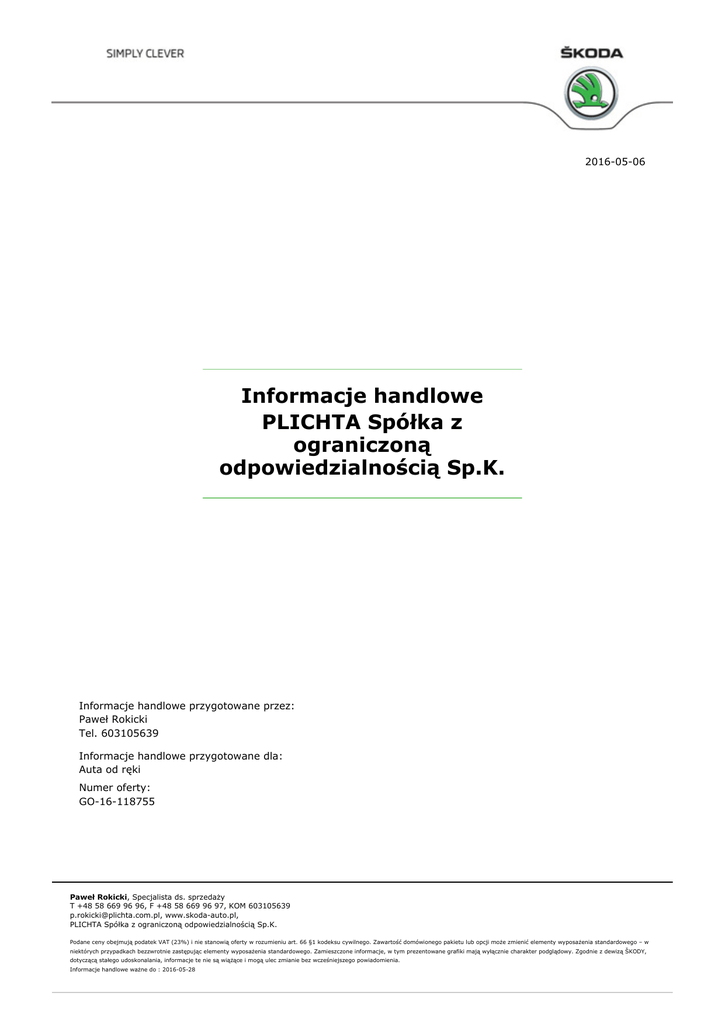 2016-05-06 Informacje handlowe PLICHTA Spółka z ograniczoną odpowiedzialnością Sp.K. Informacje handlowe przygotowane przez: Paweł Rokicki Tel. 603105639 Informacje handlowe przygotowane dla: Auta od ręki Numer oferty: GO-16-118755 Paweł Rokicki, Specjalista ds. sprzedaży T +48 58 669 96 96, F +48 58 669 96 97, KOM 603105639 [email protected], www.skoda-auto.pl, PLICHTA Spółka z ograniczoną odpowiedzialnością Sp.K. Podane ceny obejmują podatek VAT (23%) i nie stanowią oferty w rozumieniu art. 66 §1 kodeksu cywilnego. Zawartość domówionego pakietu lub opcji może zmienić elementy wyposażenia standardowego – w niektórych przypadkach bezzwrotnie zastępując elementy wyposażenia standardowego. Zamieszczone informacje, w tym prezentowane grafiki mają wyłącznie charakter podglądowy. Zgodnie z dewizą ŠKODY, dotyczącą stałego udoskonalania, informacje te nie są wiążące i mogą ulec zmianie bez wcześniejszego powiadomienia. Informacje handlowe ważne do : 2016-05-28 2016-05-06 INFORMACJA HANDLOWA DOTYCZĄCA SAMOCHODÓW MARKI ŠKODA Szanowni Państwo, w nawiązaniu do naszych ustaleń dotyczących obecnych potrzeb zakupowych, mamy przyjemność przedstawić Państwu informację handlową dotyczącą samochodów naszej marki. Każdy z prezentowanych przez nas modeli może zostać wzbogacony o liczne dodatkowe opcje wyposażenia zarówno fabrycznego jak i akcesoryjnego, w zależności od Państwa potrzeb i życzeń. Poniżej znajdziecie Państwo wybrane i najbardziej popularne opcje do każdego z aut. Prosimy, aby w ramach prowadzonych analiz porównawczych zechcieli Państwo wziąć powyższe pod uwagę. Mamy nadzieję, że przedstawione przez nas informacje spotkają się z Państwa zainteresowaniem. W razie jakichkolwiek pytań lub wątpliwości pozostajemy do Państwa dyspozycji. Z poważaniem, Paweł Rokicki Tel. 603105639 Paweł Rokicki, Specjalista ds. sprzedaży T +48 58 669 96 96, F +48 58 669 96 97, KOM 603105639 [email protected], www.skoda-auto.pl, PLICHTA Spółka z ograniczoną odpowiedzialnością Sp.K. Podane ceny obejmują podatek VAT (23%) i nie stanowią oferty w rozumieniu art. 66 §1 kodeksu cywilnego. Zawartość domówionego pakietu lub opcji może zmienić elementy wyposażenia standardowego – w niektórych przypadkach bezzwrotnie zastępując elementy wyposażenia standardowego. Zamieszczone informacje, w tym prezentowane grafiki mają wyłącznie charakter podglądowy. Zgodnie z dewizą ŠKODY, dotyczącą stałego udoskonalania, informacje te nie są wiążące i mogą ulec zmianie bez wcześniejszego powiadomienia. Informacje handlowe ważne do : 2016-05-28 ŠKODA Octavia Combi Scout Kolor: Biel Moon Metalizowany Wersja wnętrza: Czarny Paweł Rokicki, Specjalista ds. sprzedaży T +48 58 669 96 96, F +48 58 669 96 97, KOM 603105639 [email protected], www.skoda-auto.pl, PLICHTA Spółka z ograniczoną odpowiedzialnością Sp.K. Podane ceny obejmują podatek VAT (23%) i nie stanowią oferty w rozumieniu art. 66 §1 kodeksu cywilnego. Zawartość domówionego pakietu lub opcji może zmienić elementy wyposażenia standardowego – w niektórych przypadkach bezzwrotnie zastępując elementy wyposażenia standardowego. Zamieszczone informacje, w tym prezentowane grafiki mają wyłącznie charakter podglądowy. Zgodnie z dewizą ŠKODY, dotyczącą stałego udoskonalania, informacje te nie są wiążące i mogą ulec zmianie bez wcześniejszego powiadomienia. Informacje handlowe ważne do : 2016-05-28 ID Konfiguracji: SA1180185 Silnik: 2.0 TDI 110 kW (150 KM) 6-biegowa manualna 4x4 115 250 zł Cena podstawowa: 2 000 zł Cena koloru nadwozia: 13 100 zł Wyposażenie dodatkowe: 1. Oświetlenie przestrzeni wokół nóg z przodu i z tyłu 100 zł 2. Podgrzewane fotele przednie 800 zł 3. SUNSET - tylne szyby o wyższym stopniu przyciemnienia 700 zł 4. Sound System Canton (moc 570W, subwoofer, cyfrowy equalizer) 1900 zł 5. System nawigacji Amundsen z mapą Europy (kolorowy ekran dotykowy 6,5”, wejście SD, USB, AUX-in) 3100 zł 6. Obręcze kół ze stopów lekkich NIVALIS 7Jx17" w kolorze antracytowym (4 szt.) 800 zł 7. Stalowe koło dojazdowe (podnośnik, klucz do kół, bez zestawu naprawczego) 400 zł 8. Tapicerka Scout Alcantara+ skóra 5300 zł 0 zł 0 zł Usługi: 1. Gwarancja Mobilności 130 350 zł RAZEM: 6 518 zł Rabaty: 6 518 zł Rabaty dealera: 123 833 zł CENA*: Uwagi: TMBLJ7NE5G0238315 Finansowanie: 1. ŠKODA Kredyt Niskich Rat 1% - rata: Okres kredytowania Limit rocznego przebiegu Ubezpieczenie w racie Wpłata własna w zł 1 238 zł/m-c brutto 48 m-cy 20000 km zł/rok 24 767 zł brutto Rata finalna 3 opcje zakończenie kredytowania: 1) jednorazowa spłata raty finalnej 2) rozłożenie raty finalnej na raty miesięczne 3) przekazanie pojazdu do Dealera i rozliczenie raty finalnej 60 554 zł brutto Podane ceny są cenami: brutto Paweł Rokicki, Specjalista ds. sprzedaży T +48 58 669 96 96, F +48 58 669 96 97, KOM 603105639 [email protected], www.skoda-auto.pl, PLICHTA Spółka z ograniczoną odpowiedzialnością Sp.K. Podane ceny obejmują podatek VAT (23%) i nie stanowią oferty w rozumieniu art. 66 §1 kodeksu cywilnego. Zawartość domówionego pakietu lub opcji może zmienić elementy wyposażenia standardowego – w niektórych przypadkach bezzwrotnie zastępując elementy wyposażenia standardowego. Zamieszczone informacje, w tym prezentowane grafiki mają wyłącznie charakter podglądowy. Zgodnie z dewizą ŠKODY, dotyczącą stałego udoskonalania, informacje te nie są wiążące i mogą ulec zmianie bez wcześniejszego powiadomienia. Informacje handlowe ważne do : 2016-05-28 Wyposażenie standardowe Bezpieczeństwo, funkcjonalność, komfort Przestrzeń bagażowa z 4 haczykami na torby 4 składane uchwyty w podsufitce Przyciemniane szyby ACS (funkcja pokolizyjna: automatyczne odblokowanie centralnego zamka, odcięcie dopływu paliwa, włączanie świateł awaryjnych) Przygotowanie pod telefon GSM (Bluetooth, 