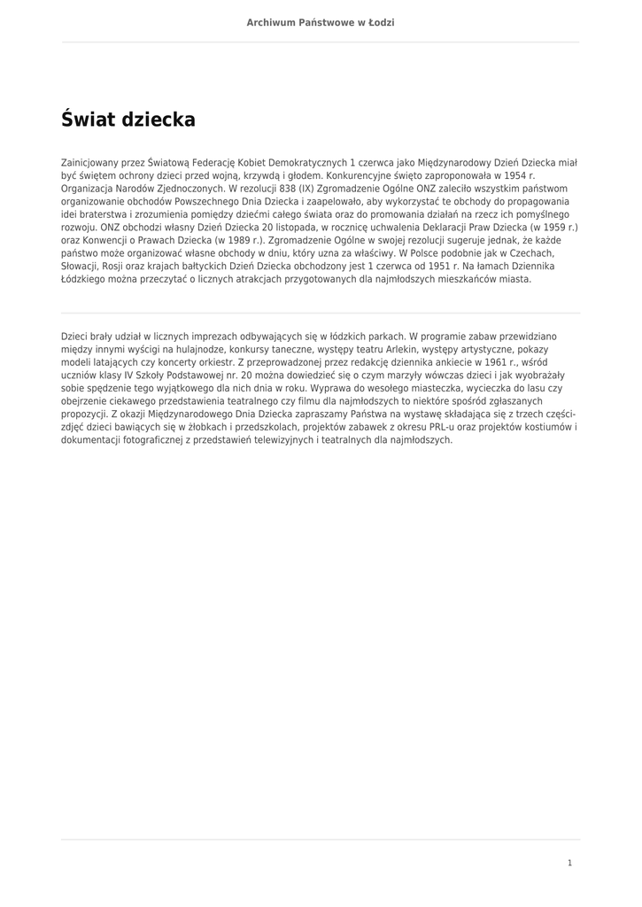 Archiwum Państwowe w Łodzi Świat dziecka Zainicjowany przez Światową Federację Kobiet Demokratycznych 1 czerwca jako Międzynarodowy Dzień Dziecka miał być świętem ochrony dzieci przed wojną, krzywdą i głodem. Konkurencyjne święto zaproponowała w 1954 r. Organizacja Narodów Zjednoczonych. W rezolucji 838 (IX) Zgromadzenie Ogólne ONZ zaleciło wszystkim państwom organizowanie obchodów Powszechnego Dnia Dziecka i zaapelowało, aby wykorzystać te obchody do propagowania idei braterstwa i zrozumienia pomiędzy dziećmi całego świata oraz do promowania działań na rzecz ich pomyślnego rozwoju. ONZ obchodzi własny Dzień Dziecka 20 listopada, w rocznicę uchwalenia Deklaracji Praw Dziecka (w 1959 r.) oraz Konwencji o Prawach Dziecka (w 1989 r.). Zgromadzenie Ogólne w swojej rezolucji sugeruje jednak, że każde państwo może organizować własne obchody w dniu, który uzna za właściwy. W Polsce podobnie jak w Czechach, Słowacji, Rosji oraz krajach bałtyckich Dzień Dziecka obchodzony jest 1 czerwca od 1951 r. Na łamach Dziennika Łódzkiego można przeczytać o licznych atrakcjach przygotowanych dla najmłodszych mieszkańców miasta. Dzieci brały udział w licznych imprezach odbywających się w łódzkich parkach. W programie zabaw przewidziano między innymi wyścigi na hulajnodze, konkursy taneczne, występy teatru Arlekin, występy artystyczne, pokazy modeli latających czy koncerty orkiestr. Z przeprowadzonej przez redakcję dziennika ankiecie w 1961 r., wśród uczniów klasy IV Szkoły Podstawowej nr. 20 można dowiedzieć się o czym marzyły wówczas dzieci i jak wyobrażały sobie spędzenie tego wyjątkowego dla nich dnia w roku. Wyprawa do wesołego miasteczka, wycieczka do lasu czy obejrzenie ciekawego przedstawienia teatralnego czy filmu dla najmłodszych to niektóre spośród zgłaszanych propozycji. Z okazji Międzynarodowego Dnia Dziecka zapraszamy Państwa na wystawę składająca się z trzech częścizdjęć dzieci bawiących się w żłobkach i przedszkolach, projektów zabawek z okresu PRL-u oraz projektów kostiumów i dokumentacji fotograficznej z przedstawień telewizyjnych i teatralnych dla najmłodszych. 1