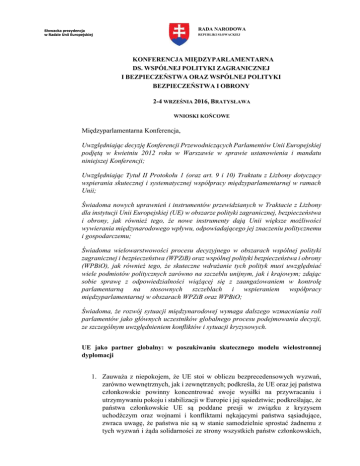 RADA NARODOWA Słowacka prezydencja w Radzie Unii Europejskiej REPUBLIKI SŁOWACKIEJ KONFERENCJA MIĘDZYPARLAMENTARNA DS. WSPÓLNEJ POLITYKI ZAGRANICZNEJ I BEZPIECZEŃSTWA ORAZ WSPÓLNEJ POLITYKI BEZPIECZEŃSTWA I OBRONY 2-4 WRZEŚNIA 2016, BRATYSŁAWA WNIOSKI KOŃCOWE Międzyparlamentarna Konferencja, Uwzględniając decyzję Konferencji Przewodniczących Parlamentów Unii Europejskiej podjętą w kwietniu 2012 roku w Warszawie w sprawie ustanowienia i mandatu niniejszej Konferencji; Uwzględniając Tytuł II Protokołu 1 (oraz art. 9 i 10) Traktatu z Lizbony dotyczący wspierania skutecznej i systematycznej współpracy międzyparlamentarnej w ramach Unii; Świadoma nowych uprawnień i instrumentów przewidzianych w Traktacie z Lizbony dla instytucji Unii Europejskiej (UE) w obszarze polityki zagranicznej, bezpieczeństwa i obrony, jak również tego, że nowe instrumenty dają Unii większe możliwości wywierania międzynarodowego wpływu, odpowiadającego jej znaczeniu politycznemu i gospodarczemu; Świadoma wielowarstwowości procesu decyzyjnego w obszarach wspólnej polityki zagranicznej i bezpieczeństwa (WPZiB) oraz wspólnej polityki bezpieczeństwa i obrony (WPBiO), jak również tego, że skuteczne wdrażanie tych polityk musi uwzględniać wiele podmiotów politycznych zarówno na szczeblu unijnym, jak i krajowym; zdając sobie sprawę z odpowiedzialności wiążącej się z zaangażowaniem w kontrolę parlamentarną na stosownych szczeblach i wspieraniem współpracy międzyparlamentarnej w obszarach WPZiB oraz WPBiO; Świadoma, że rozwój sytuacji międzynarodowej wymaga dalszego wzmacniania roli parlamentów jako głównych uczestników globalnego procesu podejmowania decyzji, ze szczególnym uwzględnieniem konfliktów i sytuacji kryzysowych. UE jako partner globalny: w poszukiwaniu skutecznego modelu wielostronnej dyplomacji 1. Zauważa z niepokojem, że UE stoi w obliczu bezprecedensowych wyzwań, zarówno wewnętrznych, jak i zewnętrznych; podkreśla, że UE oraz jej państwa członkowskie powinny koncentrować swoje wysiłki na przywracaniu i utrzymywaniu pokoju i stabilizacji w Europie i jej sąsiedztwie; podkreślając, że państwa członkowskie UE są poddane presji w związku z kryzysem uchodźczym oraz wojnami i konfliktami nękającymi państwa sąsiadujące, zwraca uwagę, że państwa nie są w stanie samodzielnie sprostać żadnemu z tych wyzwań i żąda solidarności ze strony wszystkich państw członkowskich, a także podjęcia wspólnego wysiłku na rzecz stworzenia wspólnego programu ich przezwyciężenia zgodnie z zasadami i decyzjami UE; 2. Zwraca uwagę, że UE dysponuje wszelkimi środkami, by być wpływowym graczem globalnym, jeśli będzie działać wspólnie; podkreśla potrzebę wzmocnienia współpracy z innymi potęgami globalnymi i regionalnymi w zakresie globalnych zagrożeń i wyzwań, zwracając szczególną uwagę na znaczenie więzi transatlantyckich; podkreśla doniosłą rolę organizacji regionalnych w zapobieganiu i rozwiązywaniu konfliktów, zarządzaniu kryzysowym, utrzymywaniu pokoju i stabilizacji; stwierdza, że UE i jej państwa członkowskie powinny podjąć dalsze wysiłki, by wzmocnić te organizacje i wspomóc je w budowaniu potencjału i zaufania niezbędnego do odtworzenia europejskiej architektury bezpieczeństwa w oparciu o przepisy i zasady OBWE; 3. Z zadowoleniem przyjmuje Globalną strategię na rzecz polityki zagranicznej i bezpieczeństwa Unii Europejskiej przedstawioną przez Wiceprzewodniczącą Komisji Europejskiej, Wysoką Przedstawiciel Unii do spraw Zagranicznych i Polityki Bezpieczeństwa dnia 28 czerwca 2016 r.; podkreśla znaczenie promowania za jej pośrednictwem wspólnych interesów obywateli UE oraz wartości i zasad UE; zwraca uwagę, że zdecydowane zaangażowanie oraz wsparcie ze strony państw członkowskich jest nieodzowne dla sprawnego wdrożenia tej strategii; wskazuje konieczność przekazania stosownych zasobów, aby wdrożyć tę strategię; podkreśla konieczność podjęcia działań następczych w związku z globalną strategią oraz rozdzielenia jej celów i priorytetów na bardziej konkretne branżowe i regionalne podkategorie strategiczne, w szczególności związane z obszarem bezpieczeństwa; 4. Uważa, że UE musi zintensyfikować wysiłki zmierzające do wzmocnienia globalnego zarządzania; wzywa do kompleksowej reformy systemu ONZ w celu wzmocnienia jego legitymizacji, przejrzystości, odpowiedzialności i skuteczności, w tym do rewitalizacji Zgromadzenia Ogólnego ONZ; uznaje, że w Radzie Bezpieczeństwa ONZ konieczne są reformy, w szczególności dotyczące jej składu i procedur głosowania, aby dostosować ją do realiów XXI wieku i zwiększyć jej zdolność do podejmowania zdecydowanych działań w rozwiązywaniu globalnych wyzwań w zakresie bezpieczeństwa, wykraczających poza sferę czysto wojskową, rozwiązywania problemów, takich jak uchodźcy, zrównoważony rozwój i zwalczanie pandemii; uważa, że UE i jej państwa członkowskie powinny zająć pozycję umożliwiającą wywieranie wpływu na debatę i kierowanie działaniami podejmowanymi w ramach globalnych forów, takich jak ONZ, dotyczącymi zarządzania obszarami związanymi ze strategicznymi interesami UE; 5. Wzywa wszystkie państwa członkowskie do ratyfikowania Traktatu o całkowitym zakazie prób jądrowych, podkreślając jego wkład w nierozprzestrzenianie materiałów jądrowych i z zadowoleniem przyjmuje wysiłki podejmowane w tym obszarze przez UE; 6. Zauważa, że granica pomiędzy bezpieczeństwem wewnętrznym i zewnętrznym stała się mniej wyraźna; podkreśla konieczność przeciwstawienia się przez UE zagrożeniom wnikającym z braku stabilności na południu i wschodzie poprzez przyjęcie zintegrowanego podejścia, które będzie łączyć wszystkie wewnętrzne i zewnętrzne polityki bezpieczeństwa oraz powiązane z nimi instrumenty; przypomina o potrzebie przyspieszenia rozwoju 