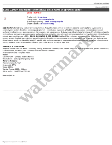 Informacje o produkcie Utworzono 03-03-2017 Luna 1300H Diamond (skontaktuj się z nami w sprawie ceny) Cena : 0,00 zł Producent : M-design Dostępność : Na zamówienie Stan magazynowy : brak w magazynie Średnia ocena : brak recenzji er m ar k ECO WAVE Automatyczny system falowania płomieni. Wszystkie nasze wkłady kominkowe opalane gazem są teraz wyposażone w automatyczny system Eco Wave które reguluje płomień i zmienia jego wysokość. Wkład kominkowy gazowy o wysokiej sprawności spalania i średniej mocy z automatycznym sterowaniem, jest przeznaczony do budynku z dobrą izolacją termiczną. Wysokiej jakości palnik, pilot zdalnego sterowania, programowanie wielopoziomowe, podwójne zabezpieczenie komory spalania przed zwiększeniem ciśnienia gazu, zużycie gazu zmniejsza się o 50%. OPCJA ECO WAVE & ECO SWITCH Możliwość korzystania z jednego palnika. Wkład kominkowy gazowy system 3 palniki o wysokiej sprawności spalania i średniej mocy z automatycznym sterowaniem jest przeznaczony do budynku z dobrą izolacją termiczną. Wysokiej jakości 3 palniki, pilot zdalnego sterowania programowanie wielopoziomowe, podwójne zabezpieczenie komory spalania przed zwiększeniem ciśnienia gazu, zużycie gazu zmniejsza się o 50%. Dekoracja w standardzie: Wnętrze: czarne szkło lub metal - Diamenty, Szafiry, białe małe kamienie, białe średnie kamienie, białe duże kamienie, polana ceramiczne, szare kamienie, terakota jasne kamienie, terakota ciemne kamienie Polana ceramiczne - wnętrze: metal Opcje: GateWay unit - aplikacja na Smartphone Winchat unit - aplikacja Inteligentny Dom Dane techniczne: Moc nominalna: 9,7 kW Sprawność: 87 % Waga: 140 kg Wymiar fasady: 1223 x 406 mm Ujście spalin: 200/130 lub 150/100 w at Gwarancja 8 lat. Wygenerowano w programie www.oscGold.com