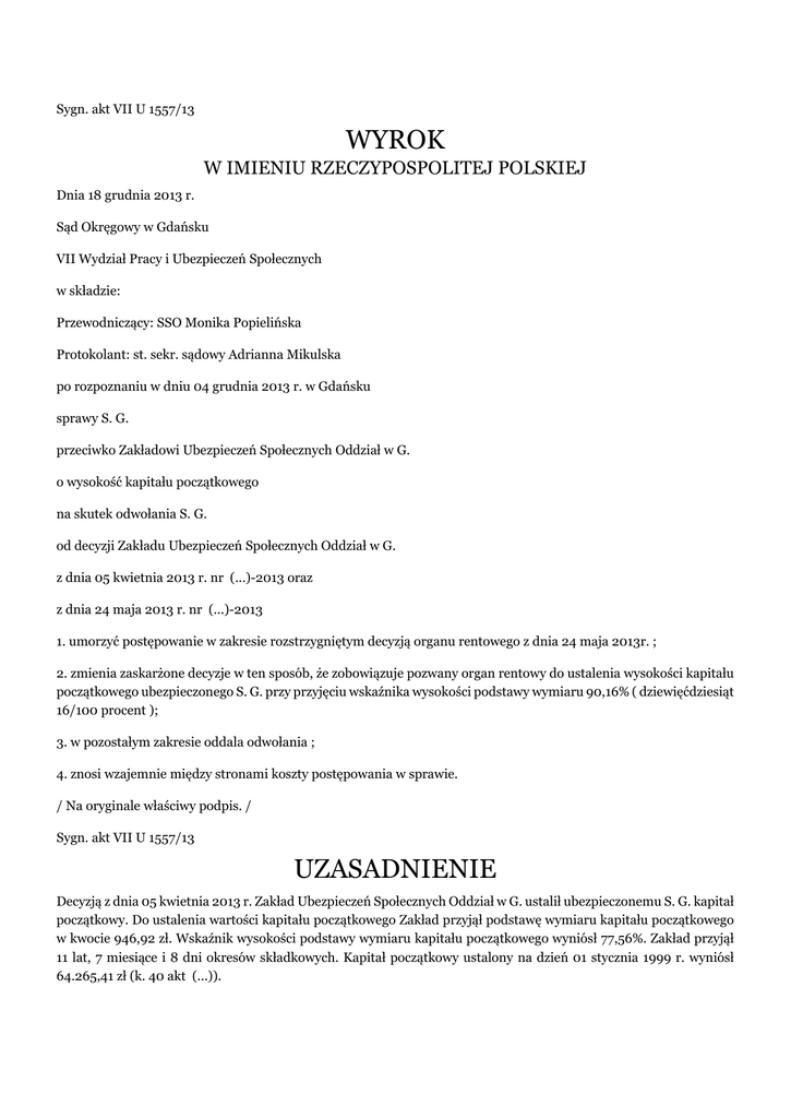 Sygn. akt VII U 1557/13 WYROK W IMIENIU RZECZYPOSPOLITEJ POLSKIEJ Dnia 18 grudnia 2013 r. Sąd Okręgowy w Gdańsku VII Wydział Pracy i Ubezpieczeń Społecznych w składzie: Przewodniczący: SSO Monika Popielińska Protokolant: st. sekr. sądowy Adrianna Mikulska po rozpoznaniu w dniu 04 grudnia 2013 r. w Gdańsku sprawy S. G. przeciwko Zakładowi Ubezpieczeń Społecznych Oddział w G. o wysokość kapitału początkowego na skutek odwołania S. G. od decyzji Zakładu Ubezpieczeń Społecznych Oddział w G. z dnia 05 kwietnia 2013 r. nr (...)-2013 oraz z dnia 24 maja 2013 r. nr (...)-2013 1. umorzyć postępowanie w zakresie rozstrzygniętym decyzją organu rentowego z dnia 24 maja 2013r. ; 2. zmienia zaskarżone decyzje w ten sposób, że zobowiązuje pozwany organ rentowy do ustalenia wysokości kapitału początkowego ubezpieczonego S. G. przy przyjęciu wskaźnika wysokości podstawy wymiaru 90,16% ( dziewięćdziesiąt 16/100 procent ); 3. w pozostałym zakresie oddala odwołania ; 4. znosi wzajemnie między stronami koszty postępowania w sprawie. / Na oryginale właściwy podpis. / Sygn. akt VII U 1557/13 UZASADNIENIE Decyzją z dnia 05 kwietnia 2013 r. Zakład Ubezpieczeń Społecznych Oddział w G. ustalił ubezpieczonemu S. G. kapitał początkowy. Do ustalenia wartości kapitału początkowego Zakład przyjął podstawę wymiaru kapitału początkowego w kwocie 946,92 zł. Wskaźnik wysokości podstawy wymiaru kapitału początkowego wyniósł 77,56%. Zakład przyjął 11 lat, 7 miesiące i 8 dni okresów składkowych. Kapitał początkowy ustalony na dzień 01 stycznia 1999 r. wyniósł 64.265,41 zł (k. 40 akt (...)). Odwołanie z dnia 07 maja 2013 r. od powyższej decyzji wniósł ubezpieczony S. G., żądając zmiany zaskarżonej decyzji, zarzucając przyjęcie przy jej wydawaniu niewłaściwego stanu faktycznego w zakresie wysokości wynagrodzeń uzyskiwanych przez ubezpieczonego oraz okresów podlegających przyjęciu do ustalenia wartości kapitału początkowego. Zażądał on uwzględnienia przy obliczaniu: 1. dodatków przewidzianych w zakładowym systemie wynagrodzeń G. w B. a. za staż pracy liczony od dnia 06 grudnia 1977 r. w wysokości 5% wynagrodzenia b. za funkcję mistrza dyplomowanego w kwocie 750 zł od dnia 01 lutego 1979r. c. za pracę na III zmianie 2. stałego składnika wynagrodzenia, premii zadaniowej (regulaminowej) naliczanej proporcjonalnie do wartości wykonanego w danym miesiącu planu produkcji, w wysokości od 10% do 20% wynagrodzenia – poprzez przyjęcie średniej wysokości tej premii jako 20% wynagrodzenia 3. kwot wynagrodzeń stanowiących podstawę do ustalenia kapitału początkowego zgodnie z aktami osobowymi (angażami i listami płac) za okres od dnia 01 stycznia 1979 r. do dnia 30 czerwca 1980 r. 4. jako okresu składkowego okresu uiszczania składek z tytułu ubezpieczenia społecznego w czasie wykonywania działalności gospodarczej od dnia 01 czerwca 1980 r. (k. 2-4 akt sprawy). W odpowiedzi z dnia 25 czerwca 2013 r. na odwołanie ubezpieczonego pozwany organ rentowy wniósł o jego oddalenie. W uzasadnieniu wskazał, iż wysokość zarobku za lata 1971-1980 pozwany ustalił na podstawie dodatkowo przedłożonych angaży, umowy o pracę oraz kartotek zarobkowych i zasiłkowych za lata 1979-1980 – uwzględniając tylko stałe składniki wynagrodzenia (wynagrodzenie zasadnicze i dodatek funkcyjny), nie uwzględniając zaś premii regulaminowej w braku dowodów stwierdzających jej wysokość. Nie uwzględniono również dodatku za staż, pomimo zapisu w piśmie zakładu pracy z dnia 13 września 1979 , bowiem kwoty podane w rubryce „dodatki” w tych kartotekach nie odpowiadają wysokości dodatku za wysługę lat wynikającego z tego pisma (procent miesięcznego wynagrodzenia zasadniczego: 5% z dniem 06 grudnia 1977 r., 10% z dniem 06 grudnia 1982 r. itd.) (k. 7-8 akt sprawy). Decyzją z dnia 24 maja 2013 r. Zakład Ubezpieczeń Społecznych Oddział w G. ponownie ustalił ubezpieczonemu S. G. kapitał początkowy. Do ustalenia wartości kapitału początkowego Zakład przyjął podstawę wymiaru kapitału początkowego w kwocie 1.095,99 zł. Wskaźnik wysokości podstawy wymiaru kapitału początkowego wyniósł 89,77%. Zakład przyjął 30 lat, 2 miesiące i 8 dni okresów składkowych. Kapitał początkowy w ten sposób ustalony wyniósł 144.494,24 zł (k. 50 akt (...)). Odwołanie z dnia 26 czerwca 2013 r. od powyższej decyzji wniósł ubezpieczony S. G., żądając zmiany zaskarżonej decyzji, zarzucając przyjęcie przy jej wydawaniu niewłaściwego stanu faktycznego w zakresie wysokości wynagrodzeń uzyskiwanych przez ubezpieczonego oraz okresów podlegających przyjęciu do ustalenia wartości kapitału początkowego. Powielił on również swoje żądania, zaprezentowane w odwołaniu od decyzji z dnia 05 kwietnia 2013 r. (k. 29-30 akt sprawy). W odpowiedzi z dnia 25 czerwca 2013 r. na odwołanie ubezpieczonego pozwany organ rentowy wniósł o jego oddalenie, jak również o połączenie spraw odwołań ubezpieczonego od obydwu decyzji dotyczących ustalenia jego kapitału początkowego do wspólnego rozpoznania. W uzasadnieniu organ przedstawił ponownie argumentację jak w odpowiedzi na odwołanie skarżącego od pierwszej decyzji. Nadto wyjaśnił, iż decyzją z dnia 24 maja 2013 r. ponownie ustalił wysokość kapitału początkowego ubezpieczonego – przyjmując jego zarobki za lata 1972-1980 jako korzystniejsze (za 1981 r. przyjęto podstawę wymiaru składek w tym okresie), równocześnie uwzględniając w wymiarze stażu pracy okres opłacania składek z tytułu prowadzonej działalności gospodarczej od dnia 01 czerwca 1980 r. do dnia 31 grudnia 1998 r. (k. 31-32 akt sprawy). Zarządzeniem z dnia 22 sierpnia 2013 r. Sąd na zasadzie art. 219 k.p.c. połączył sprawy w/w odwołań do wspólnego rozpoznania i dalszego prowadzenia pod sygn. akt VII U 1577/13 (k. 34 akt sprawy). Na rozprawie w dniu 25 wr