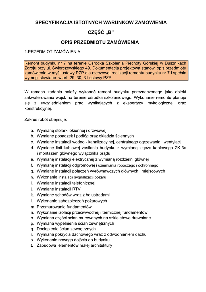SPECYFIKACJA ISTOTNYCH WARUNKÓW ZAMÓWIENIA CZĘŚĆ „B” OPIS PRZEDMIOTU ZAMÓWIENIA 1.PRZEDMIOT ZAMÓWIENIA. Remont budynku nr 7 na terenie Ośrodka Szkolenia Piechoty Górskiej w Dusznikach Zdroju przy ul. Świerczewskiego 49. Dokumentacja projektowa stanowi opis przedmiotu zamówienia w myśl ustawy PZP dla rzeczowej realizacji remontu budynku nr 7 i spełnia wymogi stawiane w art. 29, 30, 31 ustawy PZP W ramach zadania należy wykonać remont budynku przeznaczonego jako obiekt zakwaterowania wojsk na terenie ośrodka szkoleniowego. Wykonanie remontu planuje się z uwzględnieniem prac wynikających z ekspertyzy mykologicznej oraz konstrukcyjnej. Zakres robót obejmuje: a. b. c. d. e. f. g. h. i. j. k. l. m. n. o. p. q. r. s. t. Wymianę stolarki okiennej i drzwiowej Wymianę posadzek i podłóg oraz okładzin ściennych Wymianę instalacji wodno - kanalizacyjnej, centralnego ogrzewania i wentylacji Wymianę linii kablowej zasilania budynku z wymianą złącza kablowego ZK-3a i montażem głównego wyłącznika prądu Wymianę instalacji elektrycznej z wymianą rozdzielni głównej Wymianę instalacji odgromowej i uziemiania roboczego i ochronnego Wymianę instalacji połączeń wyrównawczych głównych i miejscowych Wykonanie instalacji sygnalizacji pożaru Wymianę instalacji telefonicznej Wymianę instalacji RTV Wymianę schodów wraz z balustradami Wykonanie zabezpieczeń pożarowych Przemurowanie fundamentów Wykonanie izolacji przeciwwodnej i termicznej fundamentów Wymiana części ścian murowanych na szkieletowe drewniane Wymiana wypełnienia ścian zewnętrznych Docieplenie ścian zewnętrznych Wymiana pokrycia dachowego wraz z odwodnieniem dachu Wykonanie nowego dojścia do budynku Zabudowa elementów małej architektury Charakterystyczne parametry techniczne budynku. Powierzchnia zabudowy: - 113,07 m2 Powierzchnia użytkowa łącznie: - 157,75 m2 Powierzchnia użytkowa podstawowa: - 146,19 m2 Powierzchnia użytkowa pomocnicza: - 11,56m2 Kubatura brutto: - 675 m3 2. STAN ISTNIEJĄCY Budynek jest zlokalizowany jako jeden z budynków czasowego zakwaterowania wojska na terenie Ośrodka Szkolenia Piechoty Górskiej w Dusznikach Zdroju. Wiek budynku określa się na około 80-100 lat. W budynku znajduje się 6 izb mieszkalnych ( dwie na parterze i cztery na piętrze), na parterze zlokalizowano również łaźnię wraz z umywalnią oraz kabinami ustępowymi. Nad pierwszym piętrem znajduje się nieużytkowy strych z dostępem przez właz w stropie. Na szerokości korytarza komunikacyjnego wyodrębniono piwnicę, do której prowadzą kamienne schody. Ściany zewnętrzne oraz wewnętrzne o konstrukcji szachulcowej (mur pruski), gdzie przekrój elementów drewnianych takich jak słup, podwalina, oczep, krzyżulec, określono na 15x15 cm. Przestrzenie pomiędzy konstrukcją wypełnione materiałem kamiennym połączonym gliną oraz sieczką słomy i trzciny. Grubość ścian wraz z wykończeniem wynosi 18-20 cm. Strop konstrukcji drewnianej belkowy. Dach konstrukcji jętkowej gdzie krokwie oparte są na oczepach ścian szachulcowych dodatkowo spięte belkami stropowymi pierwszej kondygnacji. Cała konstrukcja dachu usztywniona przez zastosowanie pełnego deskowania. Budynek kryty papą, ściany zewnętrzne licowane tynkiem wapiennym na siatce stalowej, okna drewniane skrzynkowe, drzwi wejściowe drewniane, rynny stalowe. Budynek posadowiony jest na fundamencie kamienny. Budynek wyposażony jest w instalację wod.- kan., centralnego ogrzewania i instalację elektryczną. Istniejące instalacje w.z. i c.w.u. wykonane są z rur stalowych ocynkowanych. Budynek zaopatrywany jest w ciepło z lokalnej kotłowni olejowej funkcjonującej w kompleksie . 3. ZAKRES RZECZOWY PRZEDMIOTU ZAMÓWIENIA. Szczegółowy zakres rzeczowy określają projekty wykonawcze (przedmiary robót należy traktować jako materiał pomocniczy) i specyfikacje techniczna wykonania i odbioru robót (STWiOR). N/w dokumentacja jest dostępna na stronie Zamawiającego w wersji elektronicznej, natomiast w wersji papierowej zostanie przekazana Wykonawcy robót po zawarciu umowy. Szczegółowy zakres robót określają : 1. Projekt wykonawczy cz. Architektura 2. Projekt wykonawczy cz. Konstrukcje 3. Projekt wykonawczy cz. Inst. Sanitarne 4. Projekt wykonawczy cz. Inst. Elektryczne 5. STWiOR cz. budowlana 6. STWiOR cz. sanitarna 7. STWiOR cz. elektryczna Dodatkowo Zamawiający udostępnia jako materiał pomocniczy przedmiary robót: 1 Przedmiar robót – branża budowlana 2 Przedmiar robót – branża elektryczna 3 Przedmiar robót – branża sanitarna 3.1. Część ogólna obejmuje: 3.1.1.Organizacja terenu budowy. Organizacja terenu budowy została opisana w projekcie umowy w dziale „Obowiązki Wykonawcy” Zaplecze budowy należy zorganizować w miejscu wskazanym przy przekazaniu terenu robót z udziałem przedstawicieli Wykonawcy i 2 Wojskowego Oddziału Gospodarczego we Wrocławiu. Obowiązki Wykonawcy robót związane z organizacją terenu budowy zawarto w projekcie umowy w dziale „Obowiązki Wykonawcy”, stanowiącej załącznik do SIWZ. 3.1.2. Warunki realizacji robót narzucone przez Użytkownika a. Wykonawca powinien dostarczyć do RZI wykaz pracowników zatrudnionych przy wykonywaniu prac, w którym należy podać nazwisko i imię pracownika wraz z serią i numerem dowodu osobistego oraz wykaz pojazdów Wykonawcy (wraz z przypisanymi do nich kierowcami), w celu wpisania pracowników i pojazdów na listę przepustek okresowych osobowych i przepustek okresowych samochodowych, która znajdować się będzie w biurze przepustek i będzie uaktualniana co 14 dni. b. O wszelkich zmianach dotyczących przedłożonego wykazu pracowników i pojazdów Wykonawca będzie powiadamiał Użytkownika co najmniej z trzydniowym wyprzedzeniem. c. Wejście/wyjście i wjazd/wyjazd na teren/z terenu Ośrodka (budowy) odbywać się będzie tylko przez biuro przepustek. d. Pojazdy zaopatrujące budowę, nie będące własnośc