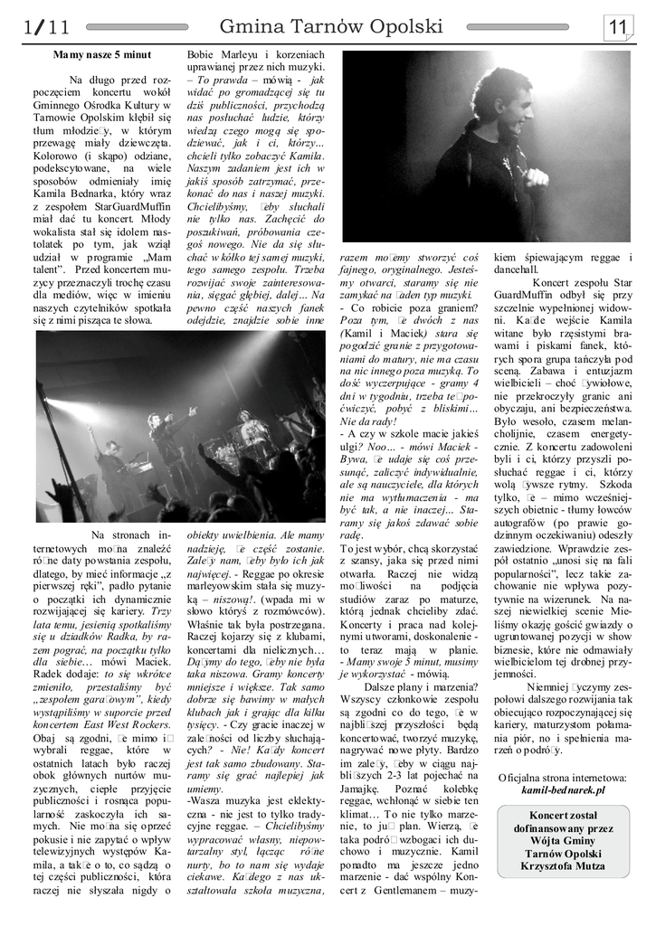 1 11 Mamy nasze 5 minut Gmina Tarnow Opolski Na długo przed rozpoczęciem koncertu wokół Gminnego Ośrodka Kultury w Tarnowie Opolskim kłębił się tłum młodzieży, w którym przewagę miały dziewczęta. Kolorowo (i skąpo) odziane, podekscytowane, na wiele sposobów odmieniały imię Kamila Bednarka, który wraz z zespołem StarGuardMuffin miał dać tu koncert. Młody wokalista stał się idolem nastolatek po tym, jak wziął udział w programie „Mam talent”. Przed koncertem muzycy przeznaczyli trochę czasu dla mediów, więc w imieniu naszych czytelników spotkała się z nimi pisząca te słowa. Bobie Marleyu i korzeniach uprawianej przez nich muzyki. – To prawda – mówią - jak widać po gromadzącej się tu dziś publiczności, przychodzą nas posłuchać ludzie, którzy wiedzą czego mogą się spodziewać, jak i ci, którzy… chcieli tylko zobaczyć Kamila. Naszym zadaniem jest ich w jakiś sposób zatrzymać, przekonać do nas i naszej muzyki. Chcielibyśmy, żeby słuchali nie tylko nas. Zachęcić do poszukiwań, próbowania czegoś nowego. Nie da się słuchać w kółko tej samej muzyki, tego samego zespołu. Trzeba rozwijać swoje zainteresowania, sięgać głębiej, dalej… Na pewno część naszych fanek odejdzie, znajdzie sobie inne Na stronach internetowych można znaleźć różne daty powstania zespołu, dlatego, by mieć informacje „z pierwszej ręki”, padło pytanie o początki ich dynamicznie rozwijającej się kariery. Trzy lata temu, jesienią spotkaliśmy się u dziadków Radka, by razem pograć, na początku tylko dla siebie… mówi Maciek. Radek dodaje: to się wkrótce zmieniło, przestaliśmy być „zespołem garażowym”, kiedy wystąpiliśmy w suporcie przed koncertem East West Rockers. Obaj są zgodni, że mimo iż wybrali reggae, które w ostatnich latach było raczej obok głównych nurtów muzycznych, ciepłe przyjęcie publiczności i rosnąca popularność zaskoczyła ich samych. Nie można się oprzeć pokusie i nie zapytać o wpływ telewizyjnych występów Kamila, a także o to, co sądzą o tej części publiczności, która raczej nie słyszała nigdy o obiekty uwielbienia. Ale mamy nadzieję, że część zostanie. Zależy nam, żeby było ich jak najwięcej. - Reggae po okresie marleyowskim stała się muzyką – niszową!. (wpada mi w słowo któryś z rozmówców). Właśnie tak była postrzegana. Raczej kojarzy się z klubami, koncertami dla nielicznych… Dążymy do tego, żeby nie była taka niszowa. Gramy koncerty mniejsze i większe. Tak samo dobrze się bawimy w małych klubach jak i grając dla kilku tysięcy. - Czy gracie inaczej w zależności od liczby słuchających? - Nie! Każdy koncert jest tak samo zbudowany. Staramy się grać najlepiej jak umiemy. -Wasza muzyka jest eklektyczna - nie jest to tylko tradycyjne reggae. – Chcielibyśmy wypracować własny, niepowtarzalny styl, łącząc różne nurty, bo to nam się wydaje ciekawe. Każdego z nas ukształtowała szkoła muzyczna, razem możemy stworzyć coś fajnego, oryginalnego. Jesteśmy otwarci, staramy się nie zamykać na żaden typ muzyki. - Co robicie poza graniem? Poza tym, że dwóch z nas (Kamil i Maciek) stara się pogodzić granie z przygotowaniami do matury, nie ma czasu na nic innego poza muzyką. To dość wyczerpujące - gramy 4 dni w tygodniu, trzeba też poćwiczyć, pobyć z bliskimi… Nie da rady! - A czy w szkole macie jakieś ulgi? Noo… - mówi Maciek Bywa, że udaje się coś przesunąć, zaliczyć indywidualnie, ale są nauczyciele, dla których nie ma wytłumaczenia - ma być tak, a nie inaczej… Staramy się jakoś zdawać sobie radę. To jest wybór, chcą skorzystać z szansy, jaka się przed nimi otwarła. Raczej nie widzą możliwości na podjęcia studiów zaraz po maturze, którą jednak chcieliby zdać. Koncerty i praca nad kolejnymi utworami, doskonalenie to teraz mają w planie. - Mamy swoje 5 minut, musimy je wykorzystać - mówią. Dalsze plany i marzenia? Wszyscy członkowie zespołu są zgodni co do tego, że w najbliższej przyszłości będą koncertować, tworzyć muzykę, nagrywać nowe płyty. Bardzo im zależy, żeby w ciągu najbliższych 2-3 lat pojechać na Jamajkę. Poznać kolebkę reggae, wchłonąć w siebie ten klimat… To nie tylko marzenie, to już plan. Wierzą, że taka podróż wzbogaci ich duchowo i muzycznie. Kamil ponadto ma jeszcze jedno marzenie - dać wspólny Koncert z Gentlemanem – muzy- 11 kiem śpiewającym reggae i dancehall. Koncert zespołu Star GuardMuffin odbył się przy szczelnie wypełnionej widowni. Każde wejście Kamila witane było rzęsistymi brawami i piskami fanek, których spora grupa tańczyła pod sceną. Zabawa i entuzjazm wielbicieli – choć żywiołowe, nie przekroczyły granic ani obyczaju, ani bezpieczeństwa. Było wesoło, czasem melancholijnie, czasem energetycznie. Z koncertu zadowoleni byli i ci, którzy przyszli posłuchać reggae i ci, którzy wolą żywsze rytmy. Szkoda tylko, że – mimo wcześniejszych obietnic - tłumy łowców autografów (po prawie godzinnym oczekiwaniu) odeszły zawiedzione. Wprawdzie zespół ostatnio „unosi się na fali popularności”, lecz takie zachowanie nie wpływa pozytywnie na wizerunek. Na naszej niewielkiej scenie Mieliśmy okazję gościć gwiazdy o ugruntowanej pozycji w show biznesie, które nie odmawiały wielbicielom tej drobnej przyjemności. Niemniej życzymy zespołowi dalszego rozwijania tak obiecująco rozpoczynającej się kariery, maturzystom połamania piór, no i spełnienia marzeń o podróży. Oficjalna strona internetowa: kamil-bednarek.pl Koncert został dofinansowany przez Wójta Gminy Tarnów Opolski Krzysztofa Mutza
