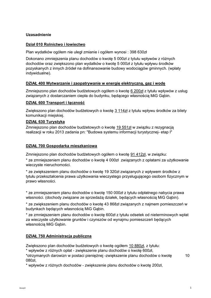 Uzasadnienie Dział 010 Rolnictwo i łowiectwo Plan wydatków ogółem nie uległ zmianie i ogółem wynosi : 398 630zł Dokonano zmniejszenia planu dochodów o kwotę 5 000zł z tytułu wpływów z różnych dochodów oraz zwiększono plan wydatków o kwotę 5 000zł z tytułu wpływu środków pozyskanych z innych źródeł na dofinansowanie budowy wodociągów gminnych. (wpłaty indywidualne). DZIAŁ 400 Wytwarzanie i zaopatrywanie w energię elektryczną, gaz i wodę Zmniejszono plan dochodów budżetowych ogółem o kwotę 6 200zł z tytułu wpływów z usług związanych z dostarczaniem ciepła do budynku, będącego własnością MiG Gąbin. DZIAŁ 600 Transport i łączność Zwiększono plan dochodów budżetowych o kwotę 3 114zł z tytułu wpływu środków za bilety komunikacji miejskiej. DZIAŁ 630 Turystyka Zmniejszono plan dochodów budżetowych o kwotę 19 551zł w związku z rezygnacją realizacji w roku 2013 zadania pn: "Budowa systemu informacji turystycznej- etap I" DZIAŁ 700 Gospodarka mieszkaniowa Zmniejszono plan dochodów budżetowych ogółem o kwotę 91 412zł, w związku: * ze zmniejszeniem planu dochodów o kwotę 4 000zł związanych z opłatami za użytkowanie wieczyste nieruchomości. * ze zwiększeniem planu dochodów o kwotę 19 320zł związanych z wpływem środków z tytułu przekształcenia prawa użytkowania wieczystego przysługującego osobom fizycznym w prawo własności. * ze zmniejszeniem planu dochodów o kwotę 150 000zł z tytułu odpłatnego nabycia prawa własności. (dochody związane ze sprzedażą działek, będących własnością MiG Gąbin). * ze zwiększeniem planu dochodów o kwotę 43 868zł związanych z najmem pomieszczeń w budynkach będących własnością MiG Gąbin. * ze zmniejszeniem planu dochodów o kwotę 600zł z tytułu odsetek od nieterminowych wpłat za wieczyste użytkowanie gruntów i czynszów od wynajmu pomieszczeń będących własnością MiG Gąbin. DZIAŁ 750 Administracja publiczna Zwiększono plan dochodów budżetowych o kwotę ogółem 10 880zł, z tytułu: * wpływów z różnych opłat - zwiększenie planu dochodów o kwotę 600zł, *otrzymanych darowizn w postaci pieniężnej -zwiększenie planu dochodów o kwotę 080zł, * wpływów z różnych dochodów - zwiększenie planu dochodów o kwotę 200zł, Zeszyt2 10 1 DZIAŁ 756 Dochody od osób prawnych, od osób fizycznych i od innych jednostek nieposiadających osobowości prawnej oraz wydatki związane z ich poborem, Zmniejszenia planu dochodów budżetowych ogółem o kwotę 221 121zł dokonano na podstawie: * wpływu podatku od działalności gospodarczej osób fizycznych, opłacanego w formie karty podatkowej - zwiększenie planu dochodów budżetowych o kwotę 7 200zł * wpływu podatku od nieruchomości od osób prawnych oraz od osób fizycznych zmniejszenie planu dochodów o kwotę 94 900zł, * wpływu podatku rolnego od osób fizycznych - zmniejszenie planu dochodów o kwotę 70 000zł * wpływu podatku leśnego od osób fizycznych oraz od osób prawnych - zmniejszenie planu dochodów o kwotę 5 400zł, * wpływu podatku od środków transportowych (od osób fizycznych) - zmniejszenie planu dochodów o kwotę 30 000zł, * wpływu podatku od spadków i darowizn od osób fizycznych - zwiększenie planu dochodów o kwotę 13 510zł, * wpływu podatku od czynności cywilnoprawnych od osób prawnych - zmniejszenie planu dochodów o kwotę 400zł, * wpływu opłat od posiadania psów - zmniejszenie planu dochodów o kwotę 700zł, * wpływu z opłaty targowej - zwiększenie planu dochodów o kwotę 9 000zł, * odsetek od środków pieniężnych zgromadzonych na rachunku bankowym - zwiększenie planu dochodów budżetowych o kwotę 17 815zł, * wpływów z opłaty skarbowej - zmniejszenie planu dochodów o kwotę 7 000zł, * wpływów z innych lokalnych opłat pobieranych przez MiG, na podstawie odrębnych ustaw zwiększenie planu dochodów o kwotę 139 749zł, * odsetek od nieterminowych wpłat z tytułu opłat lokalnych - zwiększenie planu dochodów o kwotę 5zł, * udziałów w podatku dochodowym od osób fizycznych - zmniejszenie planu dochodów o kwotę 191 000zł, * udziałów w podatku dochodowym od osób prawnych - zmniejszenie planu dochodów o kwotę 10 000zł Dział 801 Oświata i wychowanie Zwiększenia planu dochodów budżetowych ogółem o kwotę 26 711zł dokonano na podstawie: Szkoły Podstawowe Zwiększono plan wydatków w szkołach podstawowych ogółem o kwotę 15 030zł, w tym: * wpływy z różnych opłat - zwiększenie planu dochodów budżetowych o kwotę 100zł * wpływ środków z tytułu opłat za wynajem autobusu szkolnego, sal lekcyjnych, czynsze za lokale - zwiększenie planu dochodów o kwotę 14 490zł, * odsetki od środków pieniężnych zgromadzonych na rachunkach bankowych - zwiększenie planu dochodów o kwotę 440zł, Zeszyt2 2 Przedszkola Zmniejszenia planu dochodów budżetowych w przedszkolach ogółem o kwotę 50 789zł dokonano na podstawie: * wpływów z różnych opłat ( opłata stała za pobyt dzieci w przedszkolach) - zmniejszenie planu dochodów budżetowych o kwotę 25 000zł, * dochodów z najmu składników majątkowych - zmniejszenie planu dochodów o kwotę 500zł, * opłaty za wyżywienie dzieci w przedszkolach - zwiększenie planu dochodów o kwotę 11 000zł, * odsetki od środków pieniężnych zgromadzonych na rachunkach bankowych - zwiększenie planu dochodów o kwotę 10zł, * realizacji programu pn "W krainie Króla Maciusia coraz więcej potrafię, jestem szczęśliwy, bo spełniam swoje marzenia" - zmniejszenie planu dochodów o kwotę 36 615zł ( w tym kwota 23 375zł- środki z budżetu UE, oraz kwota 13 240zł - środki z budżetu państwa). * realizacji zadania pn: "Akademia Smyka" - zwiększenie planu dochodów o kwotę 316zł środki z budżetu państwa) ( Gimnazja Zwiększenia planu dochodów budżetowych o kwotę 12 110zł dokonano na podstawie: * wpływów z różnych opłat - 