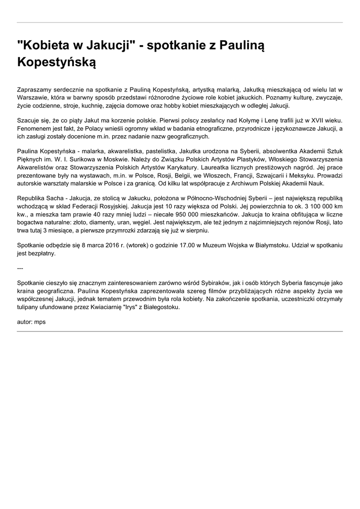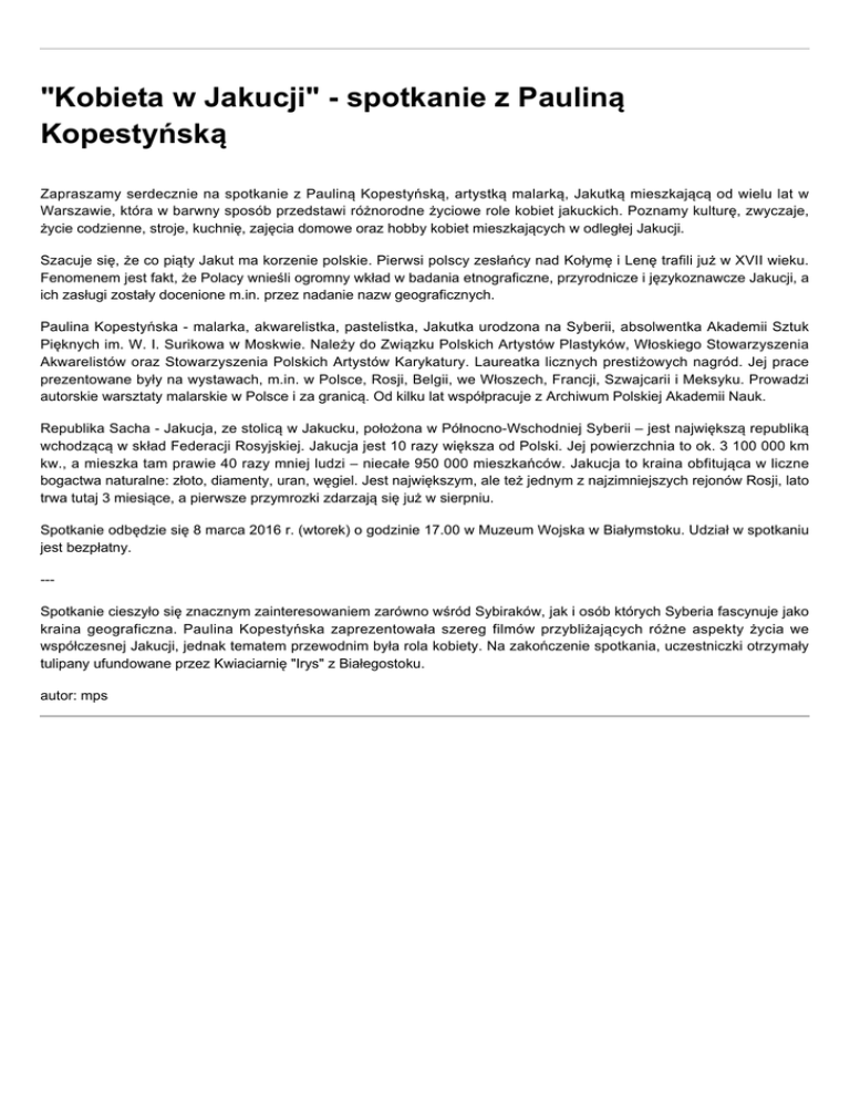 "Kobieta w Jakucji" - spotkanie z Pauliną Kopestyńską Zapraszamy serdecznie na spotkanie z Pauliną Kopestyńską, artystką malarką, Jakutką mieszkającą od wielu lat w Warszawie, która w barwny sposób przedstawi różnorodne życiowe role kobiet jakuckich. Poznamy kulturę, zwyczaje, życie codzienne, stroje, kuchnię, zajęcia domowe oraz hobby kobiet mieszkających w odległej Jakucji. Szacuje się, że co piąty Jakut ma korzenie polskie. Pierwsi polscy zesłańcy nad Kołymę i Lenę trafili już w XVII wieku. Fenomenem jest fakt, że Polacy wnieśli ogromny wkład w badania etnograficzne, przyrodnicze i językoznawcze Jakucji, a ich zasługi zostały docenione m.in. przez nadanie nazw geograficznych. Paulina Kopestyńska - malarka, akwarelistka, pastelistka, Jakutka urodzona na Syberii, absolwentka Akademii Sztuk Pięknych im. W. I. Surikowa w Moskwie. Należy do Związku Polskich Artystów Plastyków, Włoskiego Stowarzyszenia Akwarelistów oraz Stowarzyszenia Polskich Artystów Karykatury. Laureatka licznych prestiżowych nagród. Jej prace prezentowane były na wystawach, m.in. w Polsce, Rosji, Belgii, we Włoszech, Francji, Szwajcarii i Meksyku. Prowadzi autorskie warsztaty malarskie w Polsce i za granicą. Od kilku lat współpracuje z Archiwum Polskiej Akademii Nauk. Republika Sacha - Jakucja, ze stolicą w Jakucku, położona w Północno-Wschodniej Syberii – jest największą republiką wchodzącą w skład Federacji Rosyjskiej. Jakucja jest 10 razy większa od Polski. Jej powierzchnia to ok. 3 100 000 km kw., a mieszka tam prawie 40 razy mniej ludzi – niecałe 950 000 mieszkańców. Jakucja to kraina obfitująca w liczne bogactwa naturalne: złoto, diamenty, uran, węgiel. Jest największym, ale też jednym z najzimniejszych rejonów Rosji, lato trwa tutaj 3 miesiące, a pierwsze przymrozki zdarzają się już w sierpniu. Spotkanie odbędzie się 8 marca 2016 r. (wtorek) o godzinie 17.00 w Muzeum Wojska w Białymstoku. Udział w spotkaniu jest bezpłatny. --Spotkanie cieszyło się znacznym zainteresowaniem zarówno wśród Sybiraków, jak i osób których Syberia fascynuje jako kraina geograficzna. Paulina Kopestyńska zaprezentowała szereg filmów przybliżających różne aspekty życia we współczesnej Jakucji, jednak tematem przewodnim była rola kobiety. Na zakończenie spotkania, uczestniczki otrzymały tulipany ufundowane przez Kwiaciarnię "Irys" z Białegostoku. autor: mps