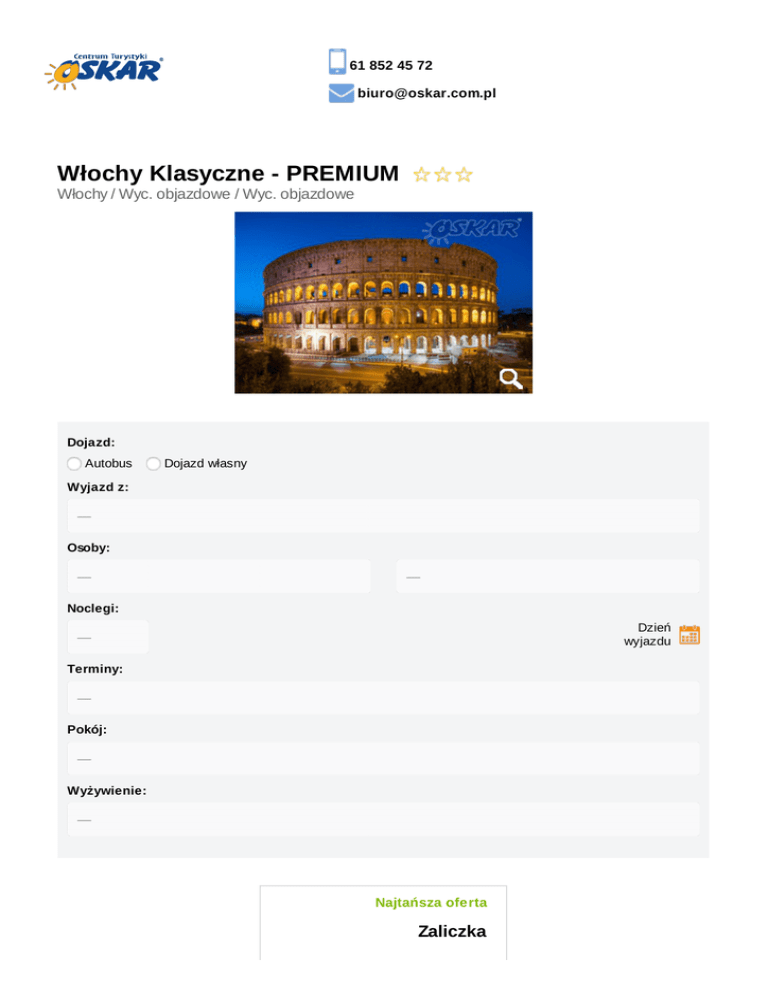 61 852 45 72 [email protected] Włochy Klasyczne - PREMIUM Włochy / Wyc. objazdowe / Wyc. objazdowe Dojazd: Autobus Dojazd własny Wyjazd z: Osoby: Noclegi: Dzień wyjazdu Terminy: Pokój: Wyżywienie: Najtańsza oferta Zaliczka do 6 marca 2017: 1399,00 zł do 5 października 2017: 1399,00 zł Suma: 1399,00 zł Opis oferty Miejscowość Przejazd autokarem PREMIUM autokar-premium-oskar-tablet-gniazdko-usb-wygodne-fotele Opinie Realizacja imprezy autokarami PREMIUM to gwarancja: transportu autokarami z roczników 2015 i 2016 produkcji Irizar i VDL Rozkład jazdy indywidualnego, multimedialnego systemu rozrywki - tablet z dotykowym ekranem w każdym zagłówku (filmy, gry, muzyka itp.). Możliwość podłączenia własnego nośnika danych poprzez wejście AUX lub USB. najwyższej klasy skórzanych lub półskórzanych foteli z możliwością regulacji oparcia lub/i zagłówka największej w Polsce przestrzeni między siedzeniami małej półki przed każdym siedzeniem + siateczki na czasopisma, książki czy telefon bezpłatnego dostępu do sieci WiFi na terenie Polski* gniazdek elektrycznych 230V wydajnej klimatyzacji sterowanej indywidualnie bogato wyposażonego barku udostępnionego w czasie jazdy WC na pokładzie autokaru Idealna i komfortowa podróż… ZAWSZE! Na ternie Polski GWARANTUJEMY, że wszystkie przejazdy realizowane są autobusem, busem lub samochodem osobowym. Zapewnimy komfortowy transport na każdym etapie podróży. Ważne: Autokar Premium jest autokarem docelowym. *jakość usług internetowych może różnić się w zależności od jakości sygnału TOUR GUIDE oprowadzanie z indywidualnym systemem nagłośnieniowym Mobilny zestaw audio: indywidulany zestaw słuchawkowy połączony bezprzewodowo z mikrofonem pilota/przewodnika. Pakiet KOMFORT gwarancja wyboru miejsca w autokarze napoje w autokarze w cenie (6 x do wyboru: kawa, herbata, zimny napój 0,2l) cena: 50 zł/os Pakiet PRESTIGE gwarancja wyboru miejsca w autokarze napoje w autokarze w cenie (6 x do wyboru: kawa, herbata, zimny napój 0,2l) pierwszeństwo wejścia na pokład autokaru nadbagaż 5 kg w cenie napoje do obiadokolacji (0,2l) cena: 100 zł/os Zakwaterowanie Hotele *** położone na trasach pomiędzy odwiedzanymi miastami. Pokoje z łazienkami, urządzone w klasycznym stylu, z klimatyzacją lub/i dostęp do Internetu Wi-Fi. W hotelach znajdują się restauracje, dodatkowo niektóre z nich mogą posiadać basen. Przykładowe zakwaterowanie, które może różnić się w poszczególnych terminach: Boara Pisani (1) - Hotel Petrarca, Montecatini Terme (1) - Hotel Santa Barbara, Bracciano (3) Montecatini Terme (1) Hotel Brasile Dostępne opcje zakwaterowania: pokój 2 - osobowy pokój 3 - osobowy dokwaterowanie (bez dopłat*) lub pokój 1 - osobowy (dopłata) Dostępne opcje wyżywienia wyżywienie BB: 6 śniadań wyżywienie HB: 6 śniadań + 6 obiadokolacji; możliwość dokonania rezerwacji w wersji HB lub obowiązkowa dopłata do obiadokolacji 50 €/os. (płatne u pilota w autokarze) śniadania serwowane: pieczywo, ser, szynka, dżem, napoje: kawa, herbata, sok obiadokolacje serwowane: zupa/przystawka, danie główne, sałatka/deser/owoc; napoje do obiadokolacji dodatkowo płatne Ubezpieczenie Warunki ubezpieczenia Bezpieczne Podróże Signal Iduna dokument do pobrania www.oskar.com.pl/zalaczniki/owu Warunki ubezpieczenia Kosztów Imprezy Turystycznej Signal Iduna dokument do pobrania www.oskar.com.pl/zalaczniki/owurg Karta Dużej Rodziny www.oskar.com.pl/zalaczniki/karta_duzej_rodziny Warunki promocji FIRST MINUTE www.oskar.com.pl/zalaczniki/warunki_promocji Turystyczny Fundusz Gwarancyjny W związku z powołaniem do życia w dniu 26.11.2016 Turystycznego Funduszu Gwarancyjnego każdy klient Biura Podróży Oskar zobowiązany jest do zapłaty kwoty w wysokości 10zł/os. przy każdorazowej rezerwacji imprezy turystycznej (obowiązuje od dnia 26.11.2016). Kwota przeznaczona na Turystyczny Fundusz Gwarancyjny zostanie automatycznie doliczona do wartości rezerwacji (w momencie jej dokonania). Wyjątkiem są imprezy turystyczne odbywające się w krajach posiadających granicę z Rzeczpospolitą Polską. Składka nie jest przychodem biura. Udogodnienia Klimatyzacja Regulowane fotele Tacki Multimedia Nowoczesna flota Zawodowy kierowca Pasy bezpieczeństwa Toaleta w autokarze Podnóżki Dla rodzin z dziećmi Wi-Fi Bez paszportu Premium Elite Restauracja hotelowa Tour guide Program ramowy DZIEŃ 1 (sobota) Wyjazd z Polski zgodnie z rozkładem jazdy autokarów. Przejazd przez Czechy, Austrię. (Trasa od granicy ok. 920 km) DZIEŃ 2 (niedziela) Przyjazd do Punta Sabbioni w godzinach przedpołudniowych, następnie rejs statkiem do Wenecji. Jest to niezwykłe miasto znajdujące się na liście UNESCO, położone na stu wyspach oplecionych labiryntem kanałów, którego ulice są pełne wody o kolorach lazuru i zieleni. Zwiedzanie Placu św. Marka - zwanego najpiękniejszym salonem Europy. Brzegi kanałów łączy ok. 400 mostów. Podczas wycieczki odwiedzimy najwspanialsze z nich - Most Westchnień i Most Rialto. Przejazd do hotelu w okolicy Bolonii. Obiadokolacja. Nocleg. (Trasa ok. 210 km) DZIEŃ 3 (poniedziałek) Śniadanie. Przyjazd do Florencji - perły Toskanii. Florencja to muzeum pod gołym niebem. Tu oddycha się sztuką. W mieście, gdzie znajduje się ponad 50% wszystkich włoskich zabytków zwiedzimy m.in. Katedrę Santa Maria del Fiore ze słynną czerwoną kopułą, która dominuje nad dachami Florencji, kompleks architektoniczny San Lorenzo, Bazylikę Santa Croce, Piazza Della Signoria, dom Dantego, Most Złotników. Przejazd do hotelu. Obiadokolacja. Nocleg. (Trasa ok. 100 km) DZIEŃ 4 (wtorek) Śniadanie. Przejazd do Sieny. Atrakcją okolonego średniowiecznymi murami miasta jest piękno jego zabudowań - majestatyczny, gotycki zespół, którym można się zachwycać, nie wchodząc do żadnego muzeum. Zwiedzanie miasta rozpoczniemy od jego serca - Piazza del Campo. Plac o kształcie wielkiej m