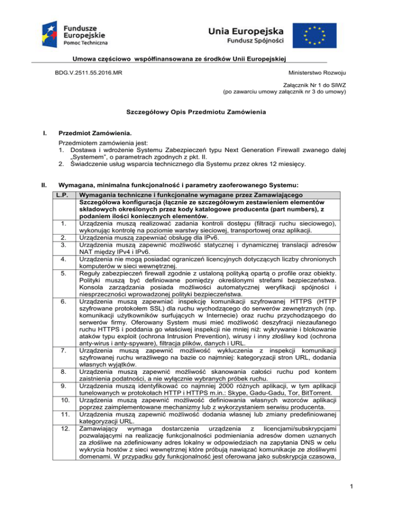 Umowa częściowo współfinansowana ze środków Unii Europejskiej BDG.V.2511.55.2016.MR Ministerstwo Rozwoju Załącznik Nr 1 do SIWZ (po zawarciu umowy załącznik nr 3 do umowy) Szczegółowy Opis Przedmiotu Zamówienia I. Przedmiot Zamówienia. Przedmiotem zamówienia jest: 1. Dostawa i wdrożenie Systemu Zabezpieczeń typu Next Generation Firewall zwanego dalej „Systemem”, o parametrach zgodnych z pkt. II. 2. Świadczenie usług wsparcia technicznego dla Systemu przez okres 12 miesięcy. II. Wymagana, minimalna funkcjonalność i parametry zaoferowanego Systemu: L.P. 1. 2. 3. 4. 5. 6. 7. 8. 9. 10. 11. 12. Wymagania techniczne i funkcjonalne wymagane przez Zamawiającego Szczegółowa konfiguracja (łącznie ze szczegółowym zestawieniem elementów składowych określonych przez kody katalogowe producenta (part numbers), z podaniem ilości koniecznych elementów. Urządzenia muszą realizować zadania kontroli dostępu (filtracji ruchu sieciowego), wykonując kontrolę na poziomie warstwy sieciowej, transportowej oraz aplikacji. Urządzenia muszą zapewniać obsługę dla IPv6. Urządzenia muszą zapewnić możliwość statycznej i dynamicznej translacji adresów NAT między IPv4 i IPv6. Urządzenia nie mogą posiadać ograniczeń licencyjnych dotyczących liczby chronionych komputerów w sieci wewnętrznej. Reguły zabezpieczeń firewall zgodnie z ustaloną polityką opartą o profile oraz obiekty. Polityki muszą być definiowane pomiędzy określonymi strefami bezpieczeństwa. Konsola zarządzania posiada możliwości automatycznej weryfikacji spójności i niesprzeczności wprowadzonej polityki bezpieczeństwa. Urządzenia muszą zapewniać inspekcję komunikacji szyfrowanej HTTPS (HTTP szyfrowane protokołem SSL) dla ruchu wychodzącego do serwerów zewnętrznych (np. komunikacji użytkowników surfujących w Internecie) oraz ruchu przychodzącego do serwerów firmy. Oferowany System musi mieć możliwość deszyfracji niezaufanego ruchu HTTPS i poddania go właściwej inspekcji nie mniej niż: wykrywanie i blokowanie ataków typu exploit (ochrona Intrusion Prevention), wirusy i inny złośliwy kod (ochrona anty-wirus i anty-spyware), filtracja plików, danych i URL. Urządzenia muszą zapewnić możliwość wykluczenia z inspekcji komunikacji szyfrowanej ruchu wrażliwego na bazie co najmniej: kategoryzacji stron URL, dodania własnych wyjątków. Urządzenia muszą zapewnić możliwość skanowania całości ruchu pod kontem zaistnienia podatności, a nie wyłącznie wybranych próbek ruchu. Urządzenia muszą identyfikować co najmniej 2000 różnych aplikacji, w tym aplikacji tunelowanych w protokołach HTTP i HTTPS m.in.: Skype, Gadu-Gadu, Tor, BitTorrent. Urządzenia muszą zapewnić możliwość definiowania własnych wzorców aplikacji poprzez zaimplementowane mechanizmy lub z wykorzystaniem serwisu producenta. Urządzenia muszą zapewnić możliwość dodania własnej lub zmiany predefiniowanej kategoryzacji URL. Zamawiający wymaga dostarczenia urządzenia z licencjami/subskrypcjami pozwalającymi na realizację funkcjonalności podmieniania adresów domen uznanych za złośliwe na zdefiniowany adres lokalny w odpowiedziach na zapytania DNS w celu wykrycia hostów z sieci wewnętrznej które próbują nawiązać komunikacje ze złośliwymi domenami. W przypadku gdy funkcjonalność jest oferowana jako subskrypcja czasowa, 1 Umowa częściowo współfinansowana ze środków Unii Europejskiej BDG.V.2511.55.2016.MR Ministerstwo Rozwoju Załącznik Nr 1 do SIWZ (po zawarciu umowy załącznik nr 3 do umowy) 13. 14. 15. 16. 17. 18. 19. 20. 21. 22. 23. 24. 25. 26. Zamawiający wymaga dostarczenia subskrypcji na min. 12 miesięcy. Urządzenia muszą umożliwiać zestawianie zabezpieczonych kryptograficznie tuneli VPN w oparciu o standardy IPSec i IKE w konfiguracji site-to-site. Dostęp VPN dla użytkowników mobilnych musi odbywać się na bazie technologii SSL VPN. Zamawiający wymaga dostarczenia urządzeń z licencjami/subskrypcjami pozwalającymi na realizację funkcjonalności wykrywania i blokowania ataków intruzów w warstwie 7 modelu OSI (IPS). W przypadku gdy funkcjonalność jest oferowana jako subskrypcja czasowa, Zamawiający wymaga dostarczenia subskrypcji na min. 12 miesięcy. Zamawiający wymaga dostarczenia urządzeń z licencjami/subskrypcjami pozwalającymi na realizację funkcjonalności inspekcji antywirusowej, kontrolującej przynajmniej protokoły: SMTP, HTTP i HTTPS oraz podstawowe rodzaje plików. Baza AV musi być przechowywana na urządzeniu i regularnie aktualizowana w sposób automatyczny. W przypadku gdy funkcjonalność jest oferowana jako subskrypcja czasowa, Zamawiający wymaga dostarczenia subskrypcji na min. 12 miesięcy. Zamawiający wymaga dostarczenia urządzeń z licencjami/subskrypcjami pozwalającymi na realizację funkcjonalności filtrowania stron WWW w zależności od kategorii treści stron HTTP bez konieczności dokupywania jakichkolwiek komponentów, poza subskrypcją. Baza kategorii stron musi być przechowywana na urządzeniu i regularnie aktualizowana w sposób automatyczny. W przypadku gdy funkcjonalność jest oferowana jako subskrypcja czasowa, Zamawiający wymaga dostarczenia subskrypcji na min. 12 miesięcy.. Urządzenia muszą transparentnie ustalać tożsamość użytkowników sieci w oparciu o Active Directory. Polityka kontroli dostępu (firewall) musi precyzyjnie definiować prawa dostępu użytkowników do określonych usług sieci i jest utrzymana nawet gdy użytkownik zmieni lokalizację i adres IP. W przypadku użytkowników pracujących w środowisku terminalowym, tym samym mających wspólny adres IP, ustalanie tożsamości musi odbywać się również transparentnie. Urządzenia muszą wykonywać statyczną i dynamiczną translację adresów NAT. Mechanizmy NAT muszą umożliwiać co najmniej dostęp wielu komputerów posiadających adresy prywatne do Internetu z wykorzystaniem jednego publicznego adresu
