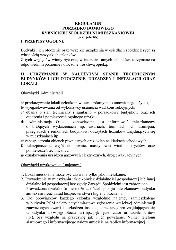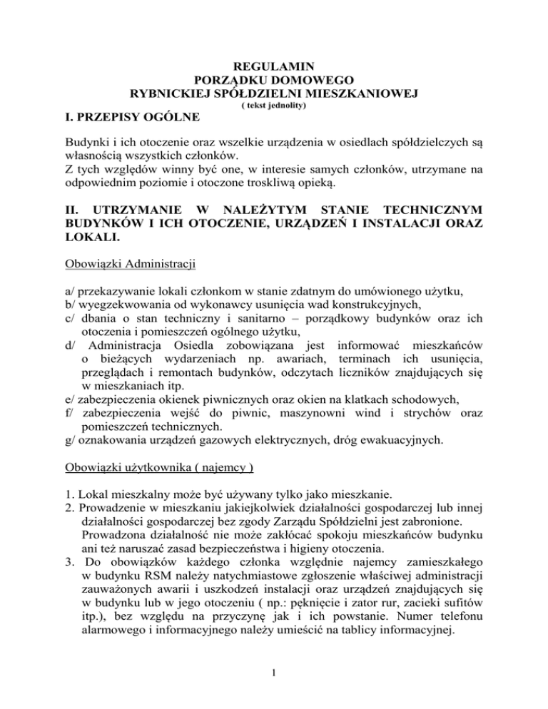 REGULAMIN PORZĄDKU DOMOWEGO RYBNICKIEJ SPÓŁDZIELNI MIESZKANIOWEJ ( tekst jednolity) I. PRZEPISY OGÓLNE Budynki i ich otoczenie oraz wszelkie urządzenia w osiedlach spółdzielczych są własnością wszystkich członków. Z tych względów winny być one, w interesie samych członków, utrzymane na odpowiednim poziomie i otoczone troskliwą opieką. II. UTRZYMANIE W NALEŻYTYM STANIE TECHNICZNYM BUDYNKÓW I ICH OTOCZENIE, URZĄDZEŃ I INSTALACJI ORAZ LOKALI. Obowiązki Administracji a/ przekazywanie lokali członkom w stanie zdatnym do umówionego użytku, b/ wyegzekwowania od wykonawcy usunięcia wad konstrukcyjnych, c/ dbania o stan techniczny i sanitarno – porządkowy budynków oraz ich otoczenia i pomieszczeń ogólnego użytku, d/ Administracja Osiedla zobowiązana jest informować mieszkańców o bieżących wydarzeniach np. awariach, terminach ich usunięcia, przeglądach i remontach budynków, odczytach liczników znajdujących się w mieszkaniach itp. e/ zabezpieczenia okienek piwnicznych oraz okien na klatkach schodowych, f/ zabezpieczenia wejść do piwnic, maszynowni wind i strychów oraz pomieszczeń technicznych. g/ oznakowania urządzeń gazowych elektrycznych, dróg ewakuacyjnych. Obowiązki użytkownika ( najemcy ) 1. Lokal mieszkalny może być używany tylko jako mieszkanie. 2. Prowadzenie w mieszkaniu jakiejkolwiek działalności gospodarczej lub innej działalności gospodarczej bez zgody Zarządu Spółdzielni jest zabronione. Prowadzona działalność nie może zakłócać spokoju mieszkańców budynku ani też naruszać zasad bezpieczeństwa i higieny otoczenia. 3. Do obowiązków każdego członka względnie najemcy zamieszkałego w budynku RSM należy natychmiastowe zgłoszenie właściwej administracji zauważonych awarii i uszkodzeń instalacji oraz urządzeń znajdujących się w budynku lub w jego otoczeniu ( np.: pęknięcie i zator rur, zacieki sufitów itp.), bez względu na przyczynę jak i ich powstanie. Numer telefonu alarmowego i informacyjnego należy umieścić na tablicy informacyjnej. 1 4. Wszelkie przeróbki w lokalach, nie wyłączając instalacji i urządzeń elektrycznych gazowych, c.o. i wodno – kanalizacyjnych, względnie poważniejsze zmiany konstrukcyjne ( stawianie lub rozbieranie ścianek działowych, przebudowa balkonów i logii, zakładanie krat, zmiany w podłączeniach do przewodów wentylacyjnych i spalinowych itp.) mogą być dokonywane jedynie za pisemną zgodą Zarządu Spółdzielni. 5. Nie wolno naprawiać we własnym zakresie – bezpieczników elektrycznych poza obrębem lokalu ( na klatkach schodowych, w piwnicach ) oraz manipulować przy instalacji elektrycznej ze względu na grożące niebezpieczeństwo oraz możliwość spalenia pionu. Kosztami z tytułu strat wynikłych na skutek manipulacji przy instalacji elektrycznej obciążona zostanie osoba, która je spowodowała. W przypadku stwierdzenia tego rodzaju uszkodzeń należy niezwłocznie zawiadomić Kierownictwo Osiedla lub dyżur awaryjny. 6. W przypadku stwierdzenia ulatniania się gazu, należy natychmiast zamknąć zawór przy gazomierzu i powiadomić pogotowie gazowe. 7. Bez zgody Kierownictwa Osiedla nie wolno instalować dodatkowych punktów świetlnych w piwnicy. 8. Nie należy pozostawiać w piwnicach i na korytarzach piwnicznych zapalonych świateł. 9. O poważniejszych uszkodzeniach urządzeń i instalacji w lokalach należy niezwłocznie zawiadomić Kierownictwo Osiedla w przeciwnym razie użytkownik lokalu ponosi odpowiedzialność za szkody i straty, które mogą wyniknąć w jego lokalu lub u sąsiadów wskutek zepsucia się instalacji lub urządzeń. 10. Otwieranie włazów dachowych, wychodzenie na dach bez zgody Administracji jest zabronione. 11. Zakładanie wszelkiego rodzaju instalacji i anten radiowych i telewizyjnych oraz satelitarnych może być dokonywane wyłącznie za zgodą Kierownictwa Osiedla. 12. Pomieszczenia przeznaczone do wspólnego użytku mieszkańców takie jak wózkownie, rowerownie, suszarnie, pralnie powinny być utrzymywane przez użytkowników w czystości i należytym stanie sanitarnym. Pomieszczenia te powinny być użytkowane zgodnie z przeznaczeniem i nie mogą być wykorzystywane na gromadzenie przedmiotów i materiałów stwarzających zagrożenie pożarowe. Użytkownicy zobowiązani są udostępnić do wglądu administracji osiedla, straży pożarnej użytkowanych pomieszczeń, w przypadkach konieczności dokonania przeglądów tych pomieszczeń bądź dokonania prac remontowych związanych z koniecznością przejścia przez w/w pomieszczenia. Użytkownicy pomieszczeń zobowiązani są do poinformowania administracji osiedla, które osoby dysponują kluczami do w/w pomieszczeń oraz dać informację na tablicy ogłoszeń. 2 III. UTRZYMANIE PORZĄDKU, HIGIENY I ESTETYKI OSIEDLA ( DOMU, OTOCZENIA ) 1. Zabrania się wyrzucać przez okno jakichkolwiek śmieci, odpadów itp. w tym również niedopałków papierosów. 2. Do muszli klozetowej nie wolno wrzucać śmieci, waty, kości, szmat, zapałek, obierek z jarzyn itp. 3. Zabrania się wrzucania twardych i ciężkich przedmiotów, jak kamienie, żelastwo, druty, szkło, części materaców itp. do pojemników na śmieci. Przedmioty o dużych gabarytach winne być składowane obok pojemników. 4. W przypadkach rozsypania wynoszonych śmieci lub rozlania płynów użytkownik zobowiązany jest sprzątnąć zanieczyszczone miejsce. 5. Trzepanie dywanów i innych przedmiotów domowych może się odbywać wyłącznie w miejscach na ten cel przeznaczonych w godzinach od 8 – 20tej. W niedziele i święta trzepanie dywanów jest zabronione. Nie wolno trzepać tych przedmiotów na balkonach, loggiach, na klatkach schodowych i oknach, oraz zmiatać śmieci z balkonów i loggii na niższe kondygnacje. 6. Podlewanie kwiatów na balkonach powinno odbywać się z umiarem, tak aby woda nie ściekała po murze, nie niszczyła elewacji, nie zabrudzała położonych niżej okien i