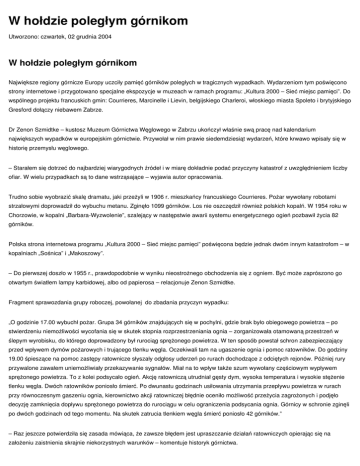W hołdzie poległym górnikom Utworzono: czwartek, 02 grudnia 2004 W hołdzie poległym górnikom Największe regiony górnicze Europy uczciły pamięć górników poległych w tragicznych wypadkach. Wydarzeniom tym poświęcono strony internetowe i przygotowano specjalne ekspozycje w muzeach w ramach programu: „Kultura 2000 – Sieć miejsc pamięci”. Do wspólnego projektu francuskich gmin: Courrieres, Marcinelle i Lievin, belgijskiego Charleroi, włoskiego miasta Spoleto i brytyjskiego Gresford dołączy niebawem Zabrze. Dr Zenon Szmidtke – kustosz Muzeum Górnictwa Węglowego w Zabrzu ukończył właśnie swą pracę nad kalendarium największych wypadków w europejskim górnictwie. Przywołał w nim prawie siedemdziesiąt wydarzeń, które krwawo wpisały się w historię przemysłu węglowego. – Starałem się dotrzeć do najbardziej wiarygodnych źródeł i w miarę dokładnie podać przyczyny katastrof z uwzględnieniem liczby ofiar. W wielu przypadkach są to dane wstrząsające – wyjawia autor opracowania. Trudno sobie wyobrazić skalę dramatu, jaki przeżyli w 1906 r. mieszkańcy francuskiego Courrieres. Pożar wywołany robotami strzałowymi doprowadził do wybuchu metanu. Zginęło 1099 górników. Los nie oszczędził również polskich kopalń. W 1954 roku w Chorzowie, w kopalni „Barbara-Wyzwolenie”, szalejący w następstwie awarii systemu energetycznego ogień pozbawił życia 82 górników. Polska strona internetowa programu „Kultura 2000 – Sieć miejsc pamięci” poświęcona będzie jednak dwóm innym katastrofom – w kopalniach „Sośnica” i „Makoszowy”. – Do pierwszej doszło w 1955 r., prawdopodobnie w wyniku nieostrożnego obchodzenia się z ogniem. Być może zaprószono go otwartym światłem lampy karbidowej, albo od papierosa – relacjonuje Zenon Szmidtke. Fragment sprawozdania grupy roboczej, powołanej do zbadania przyczyn wypadku: „O godzinie 17.00 wybuchł pożar. Grupa 34 górników znajdujących się w pochylni, gdzie brak było obiegowego powietrza – po stwierdzeniu niemożliwości wycofania się w skutek stopnia rozprzestrzeniania ognia – zorganizowała otamowaną przestrzeń w ślepym wyrobisku, do którego doprowadzony był rurociąg sprężonego powietrza. W ten sposób powstał schron zabezpieczający przed wpływem dymów pożarowych i trującego tlenku węgla. Oczekiwali tam na ugaszenie ognia i pomoc ratowników. Do godziny 19.00 śpieszące na pomoc zastępy ratownicze słyszały odgłosy uderzeń po rurach dochodzące z odciętych rejonów. Później rury przywalone zawałem uniemożliwiały przekazywanie sygnałów. Miał na to wpływ także szum wywołany częściowym wypływem sprężonego powietrza. To z kolei podsycało ogień. Akcję ratowniczą utrudniał gęsty dym, wysoka temperatura i wysokie stężenie tlenku węgla. Dwóch ratowników poniosło śmierć. Po dwunastu godzinach usiłowania utrzymania przepływu powietrza w rurach przy równoczesnym gaszeniu ognia, kierownictwo akcji ratowniczej błędnie oceniło możliwość przeżycia zagrożonych i podjęło decyzję zamknięcia dopływu sprężonego powietrza do rurociągu w celu ograniczenia podsycania ognia. Górnicy w schronie zginęli po dwóch godzinach od tego momentu. Na skutek zatrucia tlenkiem węgla śmierć poniosło 42 górników.” – Raz jeszcze potwierdziła się zasada mówiąca, że zawsze błędem jest upraszczanie działań ratowniczych opierając się na założeniu zaistnienia skrajnie niekorzystnych warunków – komentuje historyk górnictwa. Katastrofa w kopalni „Makoszowy” miała miejsce 27 sierpnia 1958 r. Tym razem aż 72 górników uległo śmiertelnemu zatruciu tlenkiem węgla. – Po analizie informacji, które zdołałem zebrać z wielkim trudem – cześć bowiem nadal objęta jest tajemnicą i podlega ustawie o ochronie danych osobowych – nasuwa się wniosek, że i w tym przypadku podjęto pochopne działania. Otóż, zakładając możliwość łatwej likwidacji pożaru, decyzja o wycofaniu ludzi zapadła co najmniej z godzinnym opóźnieniem. Wobec szybkiego wzrostu intensywności zadymienia wielu górników wycofywało się na własną rękę. Przebieg pożaru i akcji ratowniczej potwierdził tezę, że w warunkach wyrobisk podziemnych rozwój ognia może być zaskakujący, a o życiu ludzi mogą decydować minuty, a nawet sekundy – zauważa Zenon Szmidtke. Nikt nie potrafi policzyć, ilu ludzi straciło życie pod ziemią w powojennej historii polskiego górnictwa węglowego. Nieoficjalne źródła mówią o 10 tysiącach! W latach pięćdziesiątych, na szczególnie niebezpiecznych odcinkach zatrudniano żołnierzy i więźniów. Na próżno jednak przeglądać pożółkłe strony raportów. Wówczas statystyki nie informowały o liczbie wypadków, by przypadkiem nie rozdrażnić władzy. Ogólnie przyjętą praktyką było fałszowanie aktów zgonu. Jako przyczynę śmierci pracownika podawano zawał serca, zamiast – dla przykładu – pochwycenie przez taśmociąg. Archiwalne relacje opisujące tragiczne zdarzenia na kopalniach „Makoszowy” i „Sośnica” sprawiają jednak wrażenie wiarygodnych i to one właśnie znajdą się na polskiej stronie internetowej stworzonej w hołdzie poległym górnikom śląskich kopalń. KAJETAN BEREZOWSKI NAJWIĘKSZE KATASTROFY w polskim górnictwie po 1939 r. 1947 r. Kopalnia węgla „Modrzejów” w Sosnowcu – samozapalenie w wyniku wadliwej odbudowy i niepodmulenia wyrobisk; pożar; zadymienie z powodu wadliwej wentylacji. 25 ofiar śmiertelnych. 1954 r. Kopalnia węgla „Barbara-Wyzwolenie” w Chorzowie – pożar w prądzie schodzącym. 82 ofiary śmiertelne. 1955 r. Kopalnia węgla „Sośnica” w Gliwicach – zaprószenie ognia, najprawdopodobniej od lampy karbidowej. 42 ofiary śmiertelne. 1956 r. Kopalnia węgla „Chorzów” w Chorzowie – pożar; odwrócenie prądu powietrza powodujące rozległe zadymienie. 30 ofiar śmiertelnych. 19