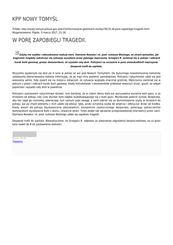 KPP NOWY TOMYŚL Źródło: http://nowy-tomysl.policja.gov.pl/w15/informacje/w-godzinach-sluzby/78131,W-pore-zapobiegli-tragedii.html Wygenerowano: Piątek, 3 marca 2017, 21:18 W PORĘ ZAPOBIEGLI TRAGEDII. Gdyby nie szybka i zdecydowana reakcja sierż. Damiana Nowaka i st. post. Łukasza Woźnego, aż strach pomyśleć, jak tragicznie mogłaby zakończyć się sytuacja wywołana przez pijanego mężczyznę. Grzegorz R. zamknął się w pokoju i odkręcił kurek butli gazowej, grożąc domownikom, że wysadzi cały dom. Policjanci na szczęście w porę unieszkodliwili mężczyznę. Desperat trafił do szpitala. Wszystko wydarzyło się dziś po 4 rano w jednej ze wsi pod Nowym Tomyślem. Do dyżurnego nowotomyskiej komendy zadzwoniła zdenerwowana kobieta informując, że jej mąż chce popełnić samobójstwo. Policjanci natychmiast udali się pod wskazany adres. Gdy zjawili się na miejscu zobaczyli, że sytuacja wygląda znacznie groźniej. Mężczyzna zamknął się w jednym z pokoi i odkręcił kurek butli gazowej. Kiedy którykolwiek z domowników próbował otworzyć drzwi, groził, że odpali papierosa i wysadzi cały dom w powietrze. Policjanci postanowili natychmiast działać, tym bardziej, że w całym domu była już wyczuwalna wyraźna woń gazu, a za drzwiami od pokoju cały czas słychać było odgłos wydobywającego się z butli gazu. Mundurowi polecili synowi desperata, aby ten zajął go rozmową, odwracając tym samym jego uwagę, a sami zabrali się za demontowanie szyby w drzwiach do pokoju. Już po chwili jednemu z nich udało się włożyć rękę, przez uchyloną szybę do wnętrza i odkluczyć drzwi od środka. Kiedy weszli do pokoju błyskawicznie obezwładnili, kompletnie zaskoczonego desperata, polecając jednocześnie domownikom wyniesienie butli z domu i otwarcie okien. Tylko dzięki tak sprawnie przeprowadzonej interwencji przez sierż. Damiana Nowaka i st. post. Łukasza Woźnego udało się zapobiec tragedii. Desperat trafił do szpitala. Niewykluczone, że Grzegorz R. odpowie za stworzenie zagrożenia bezpieczeństwa, za co grozi kara nawet do 8 lat pozbawienia wolności. Ocena: 0/5 (0) Tweetnij