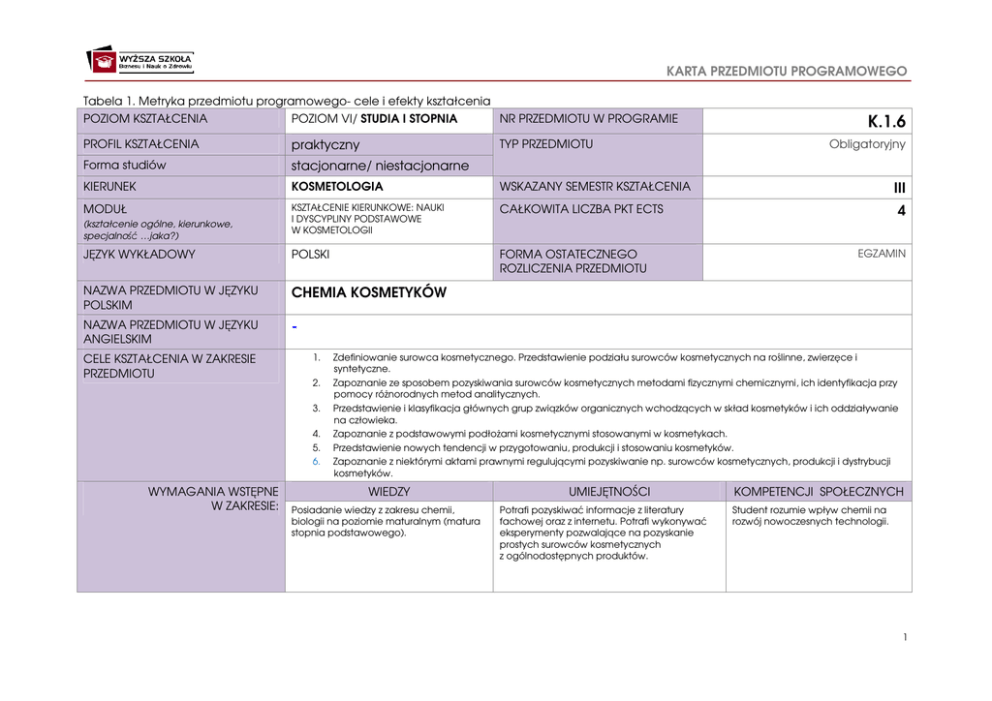 KARTA PRZEDMIOTU PROGRAMOWEGO Tabela 1. Metryka przedmiotu programowego- cele i efekty kształcenia POZIOM KSZTAŁCENIA POZIOM VI/ STUDIA I STOPNIA NR PRZEDMIOTU W PROGRAMIE PROFIL KSZTAŁCENIA praktyczny Forma studiów stacjonarne/ niestacjonarne KIERUNEK KOSMETOLOGIA WSKAZANY SEMESTR KSZTAŁCENIA MODUŁ KSZTAŁCENIE KIERUNKOWE: NAUKI I DYSCYPLINY PODSTAWOWE W KOSMETOLOGII CAŁKOWITA LICZBA PKT ECTS JĘZYK WYKŁADOWY POLSKI FORMA OSTATECZNEGO ROZLICZENIA PRZEDMIOTU NAZWA PRZEDMIOTU W JĘZYKU POLSKIM CHEMIA KOSMETYKÓW NAZWA PRZEDMIOTU W JĘZYKU ANGIELSKIM - (kształcenie ogólne, kierunkowe, specjalność …jaka?) CELE KSZTAŁCENIA W ZAKRESIE PRZEDMIOTU 1. 2. 3. 4. 5. 6. WYMAGANIA WSTĘPNE W ZAKRESIE: TYP PRZEDMIOTU K.1.6 Obligatoryjny III 4 EGZAMIN Zdefiniowanie surowca kosmetycznego. Przedstawienie podziału surowców kosmetycznych na roślinne, zwierzęce i syntetyczne. Zapoznanie ze sposobem pozyskiwania surowców kosmetycznych metodami fizycznymi chemicznymi, ich identyfikacja przy pomocy różnorodnych metod analitycznych. Przedstawienie i klasyfikacja głównych grup związków organicznych wchodzących w skład kosmetyków i ich oddziaływanie na człowieka. Zapoznanie z podstawowymi podłożami kosmetycznymi stosowanymi w kosmetykach. Przedstawienie nowych tendencji w przygotowaniu, produkcji i stosowaniu kosmetyków. Zapoznanie z niektórymi aktami prawnymi regulującymi pozyskiwanie np. surowców kosmetycznych, produkcji i dystrybucji kosmetyków. WIEDZY Posiadanie wiedzy z zakresu chemii, biologii na poziomie maturalnym (matura stopnia podstawowego). UMIEJĘTNOŚCI Potrafi pozyskiwać informacje z literatury fachowej oraz z internetu. Potrafi wykonywać eksperymenty pozwalające na pozyskanie prostych surowców kosmetycznych z ogólnodostępnych produktów. KOMPETENCJI SPOŁECZNYCH Student rozumie wpływ chemii na rozwój nowoczesnych technologii. 1 KARTA PRZEDMIOTU PROGRAMOWEGO EFEKTY KSZTAŁCENIA W ZAKRESIE PRZEDMIOTU W ODNIESIENIU DO OBSZAROWYCH EK STUDENT/ ABSOLWENT: W ODNIESIENIU DO KIERUNKOWYCH EK ODNIESIENIE DO FORM ZAJĘĆ W ĆW/K/W inne 1. Zna podział surowców kosmetycznych. Potrafi wskazać źródła, przygotowanie i pochodzenie surowca kosmetycznego a także wskazać zasadnicze substancje czynne uzyskiwane z danego surowca. M1_W01, KW_02, X X 2. Opisuje metody pozyskiwania substancji czynnych z surowców kosmetycznych metodami klasycznymi, fizykochemicznymi. Wskazuje odpowiednie metody analityczne niezbędne do identyfikacji i analizy substancji czynnych. M1_U02, M1_U08, M1_U13, KU_01, KU_02 X X 3. Zna najważniejsze grupy surowców i związków chemicznych wchodzących w ich skład a także ich działanie na organizm człowieka. M1_W01, KW_02 X X 4. Zna podstawowe grupy podłoży kosmetycznych i potrafi zaproponować ich odpowiedni skład w zależności od użytych składników czynnych i przeznaczenia. M1_U01, M1_U02, M1_U08, KU_01, KU_02, X X 5. Zna nowe tendencje w pozyskiwaniu substancji czynnych, przygotowaniu i stosowaniu kosmetyków. M1_W01, M1_W10, KW_02, X X 6. Wskazuje źródło prawnych uregulowań w kosmetyce dotyczące pozyskiwania, produkcji, obrotu, testowania zarówno surowców kosmetycznych jak i kosmetyku. M1_W08 KW_09 X X Tabela 2. Walidacja i weryfikacja efektów kształcenia EFEKTY KSZTAŁCENIA- student Formy prezentacji EK Poziomy osiągnięcia EK i odpowiadające im oceny ndst (2) 1. Zna podział surowców kosmetycznych. Potrafi wskazać źródła, przygotowanie i pochodzenie surowca kosmetycznego a także wskazać zasadnicze substancje czynne uzyskiwane z danego surowca. Pisemne zadanie testowe np. wskaż poprawną odpowiedż Nie zna podziału, nie potrafi wskazać źródła surowca, nie znasubstancji czynnych 2 Opisuje metody pozyskiwania substancji czynnych z surowców kosmetycznych metodami klasycznymi, fizykochemicznymi. Wskazuje odpowiednie metody analityczne niezbędne do Pisemne, otwarte zadanie testowe np. typu nazwij i opisz Nie zna zasadniczych metod pozyskiwania surowców, nie zna metod ich identyfikacji. dst (3) db (4) bdb (5) Popełnił błąd przy podziale surowców, potrafi wskazać źródła i zasadnicze substancje Nie popełnia błędów przy podziale surowców, potrafi wskazać źródła i zasadnicze substancje Nie popełnia błędów przy podziale surowców, potrafi wskazać źródła i zasadnicze substancje, wyczerpująco i bezbłędnie odpowiada Zna metody otrzymywania surowców, nie w pełni orientuje się o zastosowaniu odpowiednich metod ich analizy Zna metody otrzymywania surowców, orientuje się o zastosowaniu odpowiednich metod ich analizy Zna metody otrzymywania surowców, doskonale orientuje się o zastosowaniu odpowiednich metod ich analizy 2 KARTA PRZEDMIOTU PROGRAMOWEGO identyfikacji i analizy substancji czynnych. 3. Zna najważniejsze grupy surowców i związków chemicznych wchodzących w ich skład a także ich działanie na organizm człowieka. Pisemne zadanie testowe np. wskaż poprawną odpowiedż Nie wskazuje poprawnych odpowiedzi, nie zna grup związków i ich działania Wskazuje poprawne odpowiedzi, zna grupy związków lecz nie w pełni orientuje się w ich działaniu na organizm Wskazuje poprawne odpowiedzi, zna grupy związków, orientuje się w ich działaniu na organizm Zna wszystkie grupy związków chemicznych, wyczerpująco opisuje ich działanie na organizm 4. Zna podstawowe grupy podłoży kosmetycznych i potrafi zaproponować ich odpowiedni skład w zależności od użytych składników czynnych i przeznaczenia. Pisemne zadanie testowe np. wskaż poprawną odpowiedż Nie wskazuje poprawnych odpowiedzi, nie zna podłoży i ich składu Zna podstawowe grupy podłoży i nie w pełni zna ich skład i zastosowanie, Zna podstawowe grupy podłoży i ich skład i zastosowanie Zna podstawowe grupy podłoży i ich skład i zastosowanie, potrafi zaproponować ich modyfikacje 5. Zna nowe tendencje w pozyskiwaniu substancji czynnych, przygotowaniu i stosowaniu kosmetyków. Pisemne, otwarte zadanie 