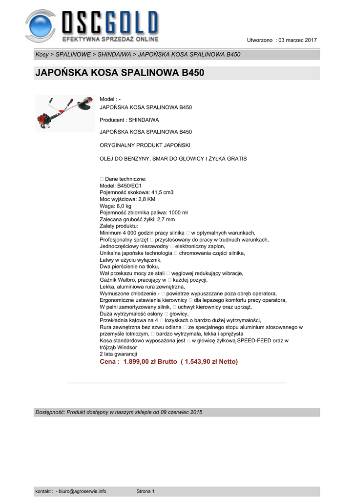 Utworzono : 03 marzec 2017 Kosy > SPALINOWE > SHINDAIWA > JAPOŃSKA KOSA SPALINOWA B450 JAPOŃSKA KOSA SPALINOWA B450 Model : JAPOŃSKA KOSA SPALINOWA B450 Producent : SHINDAIWA JAPOŃSKA KOSA SPALINOWA B450 ORYGINALNY PRODUKT JAPOŃSKI OLEJ DO BENZYNY, SMAR DO GŁOWICY I ŻYŁKA GRATIS �Dane techniczne: Model: B450/EC1 Pojemność skokowa: 41,5 cm3 Moc wyjściowa: 2,8 KM Waga: 8,0 kg Pojemność zbiornika paliwa: 1000 ml Zalecana grubość żyłki: 2,7 mm Zalety produktu: Minimum 4 000 godzin pracy silnika w optymalnych warunkach, Profesjonalny sprzęt przystosowany do pracy w trudnuch warunkach, Jednoczęściowy niezawodny elektroniczny zapłon, Unikalna japońska technologia chromowania części silnika, Łatwy w użyciu wyłącznik, Dwa pierścienie na tłoku, Wał przekazu mocy ze stali węglowej redukujący wibracje, Gaźnik Walbro, pracujący w każdej pozycji, Lekka, aluminiowa rura zewnętrzna, Wymuszone chłodzenie - powietrze wypuszczane poza obręb operatora, Ergonomiczne ustawienia kierownicy dla lepszego komfortu pracy operatora, W pełni zamortyzowany silnik, uchwyt kierownicy oraz uprząż, Duża wytrzymałość osłony głowicy, Przekładnia kątowa na 4 łozyskach o bardzo dużej wytrzymałości, Rura zewnętrzna bez szwu odlana ze specjalnego stopu aluminium stosowanego w przemyśle lotniczym, bardzo wytrzymała, lekka i sprężysta Kosa standardowo wyposażona jest w głowicę żyłkową SPEED-FEED oraz w trójząb Windsor 2 lata gwarancji Cena : 1.899,00 zł Brutto ( 1.543,90 zł Netto) Dostępność: Produkt dostępny w naszym sklepie od 09 czerwiec 2015 kontakt : - [email protected] Strona 1