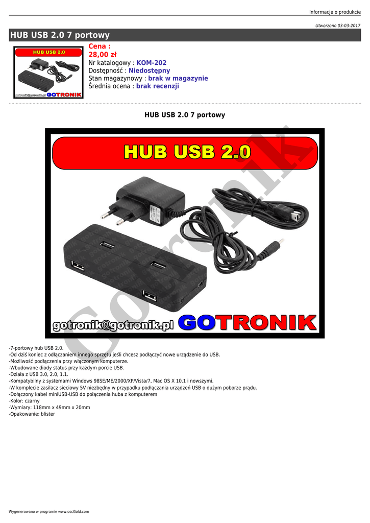 Informacje o produkcie Utworzono 03-03-2017 HUB USB 2.0 7 portowy Cena : 28,00 zł Nr katalogowy : KOM-202 Dostępność : Niedostępny Stan magazynowy : brak w magazynie Średnia ocena : brak recenzji G ot r on ik HUB USB 2.0 7 portowy -7-portowy hub USB 2.0. -Od dziś koniec z odłączaniem innego sprzętu jeśli chcesz podłączyć nowe urządzenie do USB. -Możliwość podłączenia przy włączonym komputerze. -Wbudowane diody status przy każdym porcie USB. -Działa z USB 3.0, 2.0, 1.1. -Kompatybilny z systemami Windows 98SE/ME/2000/XP/Vista/7, Mac OS X 10.1 i nowszymi. -W komplecie zasilacz sieciowy 5V niezbędny w przypadku podłączania urządzeń USB o dużym poborze prądu. -Dołączony kabel miniUSB-USB do połączenia huba z komputerem -Kolor: czarny -Wymiary: 118mm x 49mm x 20mm -Opakowanie: blister Wygenerowano w programie www.oscGold.com on ik G ot r zdjęcia: G ot r on ik Informacje o produkcie Wygenerowano w programie www.oscGold.com on ik ot r G