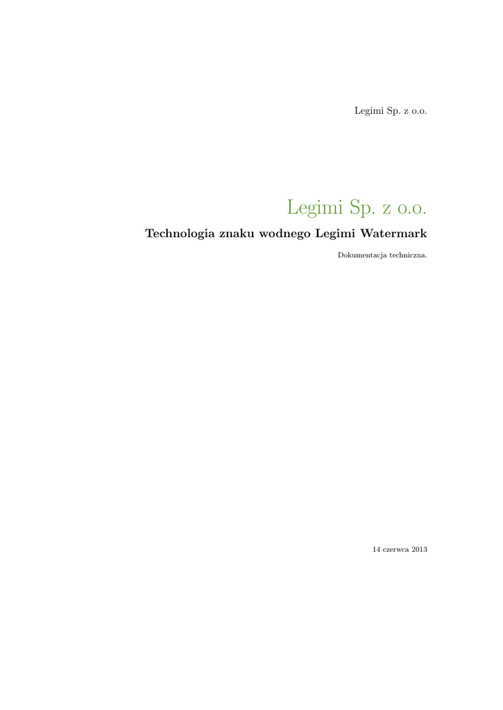 Legimi Sp. z o.o. Legimi Sp. z o.o. Technologia znaku wodnego Legimi Watermark Dokumentacja techniczna. 14 czerwca 2013 Spis treści Strona 2 z 11 Spis treści 1 Wprowadzenie 1.1 Cel dokumentu . . . . . . . . . . . . . . . . . . . . . . . . . . . . . . . . . . . . . 1.2 Zakres produktu . . . . . . . . . . . . . . . . . . . . . . . . . . . . . . . . . . . . 1.3 Omówienie dokumentu . . . . . . . . . . . . . . . . . . . . . . . . . . . . . . . . . 3 3 3 3 2 Opis produktu 2.1 Kontekst funkcjonowania 2.2 Sposób działania . . . . . 2.3 Trwałość znaku wodnego . 2.4 Licencje . . . . . . . . . . 2.5 Instalacja . . . . . . . . . 2.6 Sposób wykorzystania . . 2.7 Błędy . . . . . . . . . . . 2.8 Ograniczenia . . . . . . . . . . . . . . . 3 3 4 4 4 5 5 9 9 A Dodatki A.1 Przykłady argumentów uruchomienia . . . . . . . . . . . . . . . . . . . . . . . . . A.2 Przykładowa konfiguracja dodawania zewnętrznych plików . . . . . . . . . . . . . A.3 Przykład kompilacji środowiska Mono w systemie Red Hat . . . . . . . . . . . . . 10 10 10 10 . . . . . . . . . . . . . . . . . . . . . . . . . . . . . . . . . . . . . . . . . . . . . . . . . . . . . . . . . . . . . . . . . . . . . . . . . . . . . . . . . . . . . . . . . . . . . . . . . . . . . . . . . . . . . . . . . . . . . . . . . . . . . . . . . . . . . . . . . . . . . . . . . . . . . . . . . . . . . . . . . . . . . . . . . . . . . . . . . . . . . . . . . . . . . . . . . . . . . . . . . . . . . . . . . . . . . . . . . . . . . . . . . . . . . . . . . . . . . . . . c Dokument wewnętrzny Legimi Sp. z o.o. 2 Opis produktu Strona 3 z 11 1 Wprowadzenie 1.1 Cel dokumentu Niniejszy dokument prezentuje funkcje oraz sposób użycia konsolowego narzędzia do zabezpieczania publikacji elektronicznych (w formatach EPUB, PDF oraz MOBI) za pomocą znaku wodnego. 1.2 Zakres produktu Produkt Legimi Watermark, opisany w tym dokumencie, adresuje problem ochrony własności intelektualnej twórcy poprzez nanoszenie na publikacje elektroniczne znaku wodnego (watermarku). W odróżnieniu od DRM, który opiera się na zaszyfrowaniu publikacji w taki sposób, że jej odczytanie jest możliwe wyłącznie za pomocą określonego oprogramowania i na ściśle określonym zbiorze urządzeń, watermark nie nakłada na kupującego tego rodzaju ograniczeń. Zamiast szyfrowania treści, wprowadzane są do niej dodatkowe informacje, które pozwalają zidentyfikować właściciela książki. Legimi Watermark pozwala na automatyczne naniesienie znaku wodnego na określony plik, a także na odczytanie znaku wodnego umieszczone wcześniej w pliku. W zależności od formatu pliku, wykorzystywane są różne kanały kodowania informacji o właścicielu pliku. Znak wodny tworzony jest zarówno w postaci widocznej (krótki tekst z informację o zabezpieczeniu pliku) jak i niewidocznej dla kupującego. Wyjątkiem są pliki pdf, dla których generowany jest wyłącznie widoczny znak wodny. Program pozwala także na dodawanie do pliku EPUB dowolnych plików html do struktury pliku. Proces dodawania jest zautomatyzowany - pliki są parsowane w celu wykrycia zależności takich jak np. style i pliki obrazków. Wszystkie zależności są automatycznie dodawane do wynikowego pliku. Funkcjonalność tę można wykorzystać m.in. do wstawiania treści reklamowych. 1.3 Omówienie dokumentu Dalsza część niniejszego dokumentu szczegółowo omawia funkcje, sposób uruchomienia oraz interpretacji wyników programu. Określone zostają również ograniczenia technologii. Dokumentacja dotyczy narzędzia Legimi Watermark w wersji 2.0. 2 Opis produktu Legimi Watermark jest narzędziem konsolowym przeznaczonym do wdrożenia na serwerach umożliwiających użytkownikom pobieranie zakupionych publikacji. Działa on w dwóch trybach: • tryb kodowania: na podstawie pliku w formacie EPUB, MOBI lub PDF oraz informacji identyfikującej kupującego, generuje on drugi plik, w formacie identycznym z formatem pliku wejściowego. Plik wynikowy zawiera zakodowane informacje o kupującym. • tryb dekodowania: z pliku w formacie EPUB, MOBI lub PDF odczytywany jest zapisany tam wcześniej znak wodny (o ile został on wcześniej zapisany w plik; w przeciwnym wypadku program stwierdza brak znaku wodnego). 2.1 Kontekst funkcjonowania Technologia znaku wodnego powinna być wykorzystywana w momencie pobierania zakupionego pliku przez użytkownika. Zakładając, że oryginalny plik publikacji elektroniczej oraz dane identy- c Dokument wewnętrzny Legimi Sp. z o.o. 2 Opis produktu Strona 4 z 11 fikujące kupca są takie same, plik ze znakiem wodnym również będzie niezmienny. Stąd możliwe jest cache’owanie plików wynikowych. Cache plików nie jest jednak cześcią Legimi Watermark. 2.2 Sposób działania Działanie Legimi Watermark zależne jest od formatu pliku wejściowego. Dla plików EPUB oraz MOBI, informacja o znaku wodnym kodowana jest w kilku niezależnych kanałach. Dzięki temu usunięcie znaku wodnego z zabezpieczonego pliku staje się trudniejsze. Sposób kodowania znaku wodnego nie wpływa na wygląd książki - znak wodny jest niewidoczny w przegląrkach plików EPUB i MOBI. Poza tym, w celu wywarcia dodatkowego efektu psychologicznego, dodawana jest jawna informacja o zabezpieczeniu pliku znakiem, umieszczana na początku tekstu. W przypadku plików PDF, umieszczana jest jedynie widoczna informacja, w postaci tekstu dodawanego u dołu każdej ze stron pliku. 2.3 Trwałość znaku wodnego Istotną cechą technologii nanoszenia znaku wodnego na publikacje elektroniczne jest trwałość tego zabezpieczenia, tj. odporność na próby usunięcia znaku, w szczególności za pomocą ogólnie dostępnych narzędzi. Legimi Watermark dla plików EPUB oraz MOBI został pod tym kątem przetestowany za pomocą narzędzia Calibre (http://calibre-ebook.com). Calibre jest jednym z najczęściej wykorzystywanych programów do zarządzania elektroniczną biblioteczką użytkownika. Swoją popularność zawdzięcza wspa