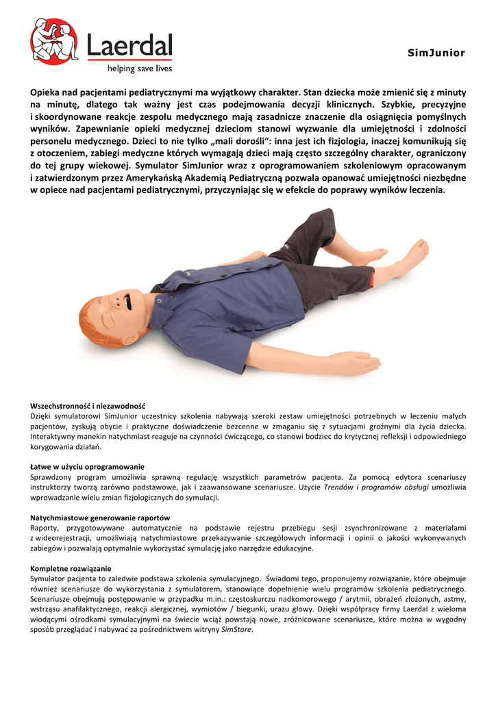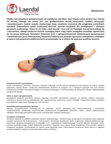 SimJunior Opieka nad pacjentami pediatrycznymi ma wyjątkowy charakter. Stan dziecka może zmienić się z minuty na minutę, dlatego tak ważny jest czas podejmowania decyzji klinicznych. Szybkie, precyzyjne i skoordynowane reakcje zespołu medycznego mają zasadnicze znaczenie dla osiągnięcia pomyślnych wyników. Zapewnianie opieki medycznej dzieciom stanowi wyzwanie dla umiejętności i zdolności personelu medycznego. Dzieci to nie tylko „mali dorośli“: inna jest ich fizjologia, inaczej komunikują się z otoczeniem, zabiegi medyczne których wymagają dzieci mają często szczególny charakter, ograniczony do tej grupy wiekowej. Symulator SimJunior wraz z oprogramowaniem szkoleniowym opracowanym i zatwierdzonym przez Amerykańską Akademią Pediatryczną pozwala opanować umiejętności niezbędne w opiece nad pacjentami pediatrycznymi, przyczyniając się w efekcie do poprawy wyników leczenia. Wszechstronność i niezawodność Dzięki symulatorowi SimJunior uczestnicy szkolenia nabywają szeroki zestaw umiejętności potrzebnych w leczeniu małych pacjentów, zyskują obycie i praktyczne doświadczenie bezcenne w zmaganiu się z sytuacjami groźnymi dla życia dziecka. Interaktywny manekin natychmiast reaguje na czynności ćwiczącego, co stanowi bodziec do krytycznej refleksji i odpowiedniego korygowania działań. Łatwe w użyciu oprogramowanie Sprawdzony program umożliwia sprawną regulację wszystkich parametrów pacjenta. Za pomocą edytora scenariuszy instruktorzy tworzą zarówno podstawowe, jak i zaawansowane scenariusze. Użycie Trendów i programów obsługi umożliwia wprowadzanie wielu zmian fizjologicznych do symulacji. Natychmiastowe generowanie raportów Raporty, przygotowywane automatycznie na podstawie rejestru przebiegu sesji zsynchronizowane z materiałami z wideorejestracji, umożliwiają natychmiastowe przekazywanie szczegółowych informacji i opinii o jakości wykonywanych zabiegów i pozwalają optymalnie wykorzystać symulację jako narzędzie edukacyjne. Kompletne rozwiązanie Symulator pacjenta to zaledwie podstawa szkolenia symulacyjnego. Świadomi tego, proponujemy rozwiązanie, które obejmuje również scenariusze do wykorzystania z symulatorem, stanowiące dopełnienie wielu programów szkolenia pediatrycznego. Scenariusze obejmują postępowanie w przypadku m.in.: częstoskurczu nadkomorowego / arytmii, obrażeń złożonych, astmy, wstrząsu anafilaktycznego, reakcji alergicznej, wymiotów / biegunki, urazu głowy. Dzięki współpracy firmy Laerdal z wieloma wiodącymi ośrodkami symulacyjnymi na świecie wciąż powstają nowe, zróżnicowane scenariusze, które można w wygodny sposób przeglądać i nabywać za pośrednictwem witryny SimStore. Symulator SimJunior Advanced posiada: Ø łatwe w obsłudze oprogramowanie, z możliwością ręcznej regulacji wszystkich parametrów, Ø scenariusze z trendami i programami obsługi, z możliwością programowania przez użytkownika, Ø rejestracja za pomocą kamery sieciowej, Ø przeglądanie raportu z przebiegu sesji wraz ze zsynchronizowanym zapisem z danych z monitora pacjenta i materiałami wideo, Ø samodzielna przeglądarka raportów umożliwiająca przeglądanie ich poza miejscem szkolenia, Ø monitor pacjenta: Ø możliwość indywidualnej konfigulacji, Ø obsługa z użyciem ekranu dotykowego, Ø możliwość symulacji pomiaru kilku parametrów, w tym: Ø częstości akcji serca, Ø EKG, Ø saturacji tlenem (SPO2), Ø nieinwazyjnego pomiaru ciśnienia tętniczego (NIBP), Ø zawartości CO2 w wydychanym powietrzu (ETCO2), Ø wyświetlanie rentgenogramów, Ø wyświetlanie 12-‐odprowadzeniowego EKG, Ø wyświetlanie wprowadzanych przez użytkownika obrazów i materiałów wideo. 233-‐00033 SimJunior Advanced with Complete Peripherial Kit W skład zestawu wchodzi: Ø manekin Ø jednostka połączeniona Link Box Ø komputer typu laptop Ø monitor z ekranem dotykowym Ø kamera sieciowa Ø mankiet do pomiaru ciśnienia krwi Ø zestaw materiałów eksploatacyjnych Ø oprogramowanie symulatora SimJunior Advanced i licencja na użytkowanie programu Ø instrukcja użytkowania Ø waliza Dodatkowe akcesoria: 212-‐05250 Waliza do transportu urządzeń peryferyjnych 216-‐00438 SimView Zaawansowany system wideo 277-‐00001 Pediatryczne moduły urazów automatyczny obrzęk języka Materiały zużywalne: 300-‐00750 Simulated Blood – sztuczna krew 250-‐21050 Airway Lubricant – żel silikonowy 277-‐00150 Baby Powder – puder dziecięcy 375-‐70150 Replacement Skin & Vein System (pediatric) wymienna skóra ramienia z systemem żył wymienne źrenice umożliwiające symulację różnych poziomów przytomności pacjenta wkładka dostępu śródkostnego piszczeli intubacja Specyfikacja umiejętności i właściwości związanych z działaniem symulatora SimJunior: Oddychanie Symulacja oddychania spontanicznego Widoczne unoszenie się klatki piersiowej Zmienne współczynniki oddechowe Złożone dźwięki z górnych dróg oddechowych zsynchronizowane z oddechem Rejestrowanie zabiegu wentylacji mechanicznej (a także braku wentylacji) z pomiarem ilości wdmuchiwanego powietrza Możliwość symulacji wentylacji z użyciem worka z zastawką i maską Prawidłowe i nieprawidłowe dźwięki oddechowe Monitorowanie saturacji tlenem i kształtu fali (wersja zaawansowana) Powikłania oddechowe: • Obustronny ruch klatki piersiowej przy oddychaniu spontanicznym • Jednostronne unoszenie się klatki piersiowej przy nieprawidłowej intubacji oskrzela głównego • Dźwięki oddechowe jednostronne i dwustronne Możliwość wentylacji osobno lewego i prawego płuca Drogi oddechowe Drogi oddechowe mają wymodelowane cechy anatomiczne do poziomu tchawicy. Realistyczny kształt z charakterystycznymi cechami ułatwiającymi symulację zabiegów Intubacja ustna i nosowa Wkładane maski krtaniowej i rurki dotchawiczej Obrzęk języka Zakładanie sondy nosowo-‐żołądkowej Symulacja nacięcia chrz