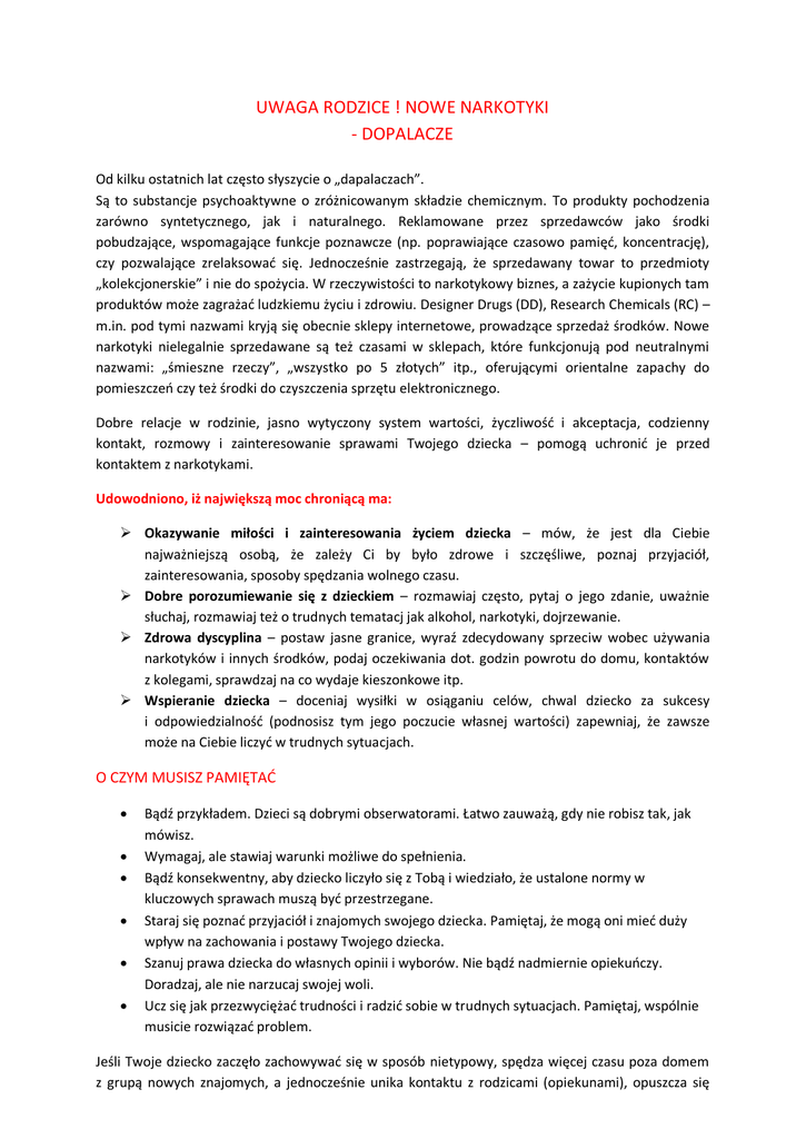 UWAGA RODZICE ! NOWE NARKOTYKI - DOPALACZE Od kilku ostatnich lat często słyszycie o „dapalaczach”. Są to substancje psychoaktywne o zróżnicowanym składzie chemicznym. To produkty pochodzenia zarówno syntetycznego, jak i naturalnego. Reklamowane przez sprzedawców jako środki pobudzające, wspomagające funkcje poznawcze (np. poprawiające czasowo pamięć, koncentrację), czy pozwalające zrelaksować się. Jednocześnie zastrzegają, że sprzedawany towar to przedmioty „kolekcjonerskie” i nie do spożycia. W rzeczywistości to narkotykowy biznes, a zażycie kupionych tam produktów może zagrażać ludzkiemu życiu i zdrowiu. Designer Drugs (DD), Research Chemicals (RC) – m.in. pod tymi nazwami kryją się obecnie sklepy internetowe, prowadzące sprzedaż środków. Nowe narkotyki nielegalnie sprzedawane są też czasami w sklepach, które funkcjonują pod neutralnymi nazwami: „śmieszne rzeczy”, „wszystko po 5 złotych” itp., oferującymi orientalne zapachy do pomieszczeń czy też środki do czyszczenia sprzętu elektronicznego. Dobre relacje w rodzinie, jasno wytyczony system wartości, życzliwość i akceptacja, codzienny kontakt, rozmowy i zainteresowanie sprawami Twojego dziecka – pomogą uchronić je przed kontaktem z narkotykami. Udowodniono, iż największą moc chroniącą ma: Okazywanie miłości i zainteresowania życiem dziecka – mów, że jest dla Ciebie najważniejszą osobą, że zależy Ci by było zdrowe i szczęśliwe, poznaj przyjaciół, zainteresowania, sposoby spędzania wolnego czasu. Dobre porozumiewanie się z dzieckiem – rozmawiaj często, pytaj o jego zdanie, uważnie słuchaj, rozmawiaj też o trudnych tematacj jak alkohol, narkotyki, dojrzewanie. Zdrowa dyscyplina – postaw jasne granice, wyraź zdecydowany sprzeciw wobec używania narkotyków i innych środków, podaj oczekiwania dot. godzin powrotu do domu, kontaktów z kolegami, sprawdzaj na co wydaje kieszonkowe itp. Wspieranie dziecka – doceniaj wysiłki w osiąganiu celów, chwal dziecko za sukcesy i odpowiedzialność (podnosisz tym jego poczucie własnej wartości) zapewniaj, że zawsze może na Ciebie liczyć w trudnych sytuacjach. O CZYM MUSISZ PAMIĘTAĆ Bądź przykładem. Dzieci są dobrymi obserwatorami. Łatwo zauważą, gdy nie robisz tak, jak mówisz. Wymagaj, ale stawiaj warunki możliwe do spełnienia. Bądź konsekwentny, aby dziecko liczyło się z Tobą i wiedziało, że ustalone normy w kluczowych sprawach muszą być przestrzegane. Staraj się poznać przyjaciół i znajomych swojego dziecka. Pamiętaj, że mogą oni mieć duży wpływ na zachowania i postawy Twojego dziecka. Szanuj prawa dziecka do własnych opinii i wyborów. Nie bądź nadmiernie opiekuńczy. Doradzaj, ale nie narzucaj swojej woli. Ucz się jak przezwyciężać trudności i radzić sobie w trudnych sytuacjach. Pamiętaj, wspólnie musicie rozwiązać problem. Jeśli Twoje dziecko zaczęło zachowywać się w sposób nietypowy, spędza więcej czasu poza domem z grupą nowych znajomych, a jednocześnie unika kontaktu z rodzicami (opiekunami), opuszcza się w nauce, zaniedbuje swój wygląd lub też zamyka się na długie godziny w swoim pokoju – sprawdzaj co się dzieje, być może zażywa narkotykil. OSTRZEŻ DZIECKO: Dopalacze to pułapki. Substancje psychoaktywne na każdego działają inaczej. W krótkich chwilach euforii dziecko może wybiec na spotkanie z nadjeżdżającym samochodem lub zobaczyć „świetlaną” przyszłość w oknie mieszkania znajdującego się na piątym piętrze i wyskoczyć z okna – wtedy może być już za późno na pomoc. „Dopalacze” to nie produkty pochodzenia naturalnego, zażywając je dziecko wychodzi na spacer, z którego może nie wrócić. Nowe narkotyki to nowe substancje, których działanie na organizm człowieka nie zostało do końca poznane i niezwykle łatwo je przedawkować. Lekarze często nie wiedzą jak postępować przy takim zatruciu. ZWRÓĆ UWAGĘ NA NASTĘPUJĄCE SYGNAŁY: Rozszerzone źrenice, słowotok, nadmierna ruchliwość, zaburzenia snu, chudnięcie, zmienność nastrojów, trudności w koncentracji uwagi, niepokój, ataki agresji, krwotoki z nosa – te objawy mogą świadczyć o tym, że dziecko zażywa substancje stymulujące. Najczęściej występują pod postacią białego proszku, którego ślady w pokoju lub na rzeczach dziecka powinny wzbudzić Twój niepokój. Nietypowy zapach włosów i ubrania, nadmierna wesołość, przekrwione oczy, kaszel, zwiększony apetyt, zaburzenia koordynacji uchowej powinny wzbudzać podejrzenia, że dziecko może palić mieszanki ziołowe (Kanabinoidy). W pokoju może unosić się zapach dymu, w kieszeniach ubrań mogą znajdować się suszone rozdrobnione liście, jak również inne akcesoria – szklane fifki bibułki, zapalniczka, charakterystyczne foliowe torebki. Nieobecny wzrok, zaburzenia percepcji i świadomości, nadwrażliwość zmysłów, halucynacje wzokowe i słuchowe, lęk, panika, urojenia mogą świadczyć o zażyciu substancji halucynogennych. W przypadku przedawkowania wystąpić mogą: dreszcze, ślinotok, wymioty, zesztywnienie lub zwiotczenie mięśni. Kontakt z osobą, która zażyła halucynogen może być znacznie utrudniony. Objawy zależą od rodzaju przyjętej substancji. W przypadku dopalaczy mamy doczynienia z różnymi mieszankami, dlatego nie ma jasnego, jednego wzorca objawów. Przyjęta substancja może być tolerowana przez organizm jednego człowieka, a dla innego może okazać się groźną w skutkach trucizną. Powodowane przez dopalacza zmiany świadomości, stany pobudzenia – ograniczają zdlność oceny rzeczywistości i kontroli sytuacji, co znacznie zwiększa ryzyko niebezpiecznego ypadku, odniesienia urazu, a także utraty świadomości. Używanie dopalaczy może także spowodować skutki śmiertelne! CO ZROBIĆ, GDY PODEJRZEWASZ, ŻE DZIECKO BIERZE NARKOTYKI? ODŁĄCZ EMOCJE, WŁĄCZ ROZUM Zacznij działać, problem sam się