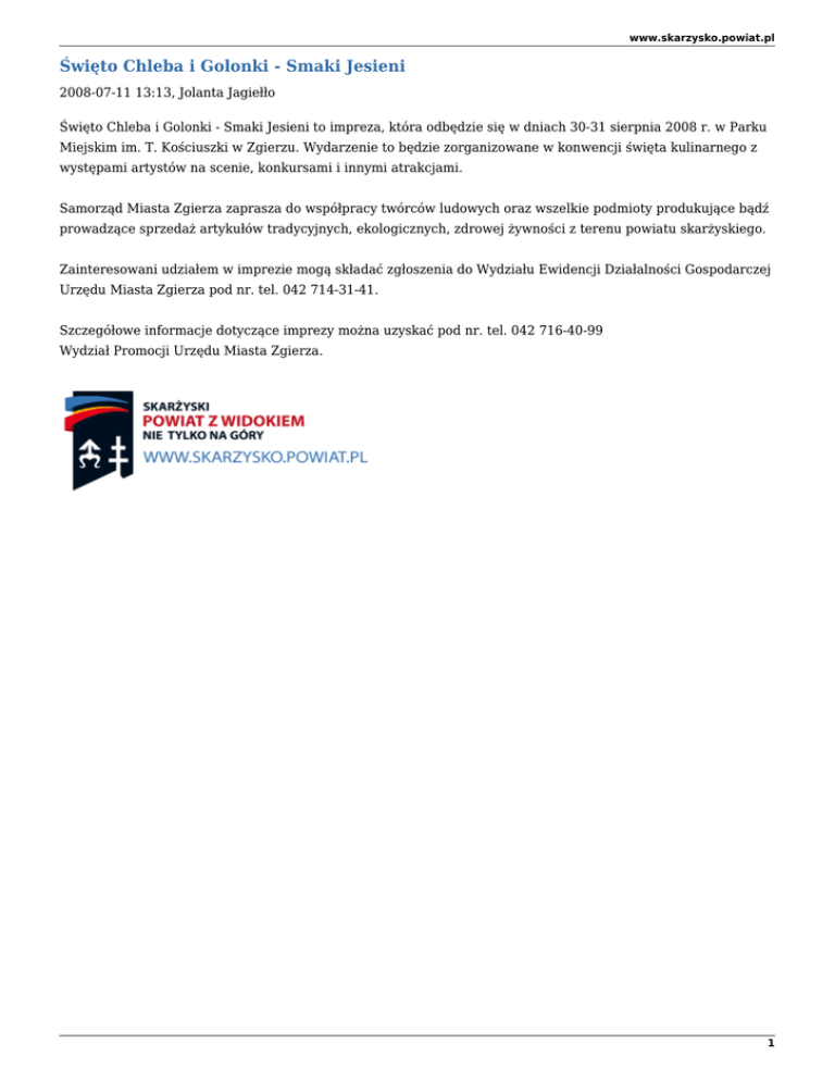 www.skarzysko.powiat.pl Święto Chleba i Golonki - Smaki Jesieni 2008-07-11 13:13, Jolanta Jagiełło Święto Chleba i Golonki - Smaki Jesieni to impreza, która odbędzie się w dniach 30-31 sierpnia 2008 r. w Parku Miejskim im. T. Kościuszki w Zgierzu. Wydarzenie to będzie zorganizowane w konwencji święta kulinarnego z występami artystów na scenie, konkursami i innymi atrakcjami. Samorząd Miasta Zgierza zaprasza do współpracy twórców ludowych oraz wszelkie podmioty produkujące bądź prowadzące sprzedaż artykułów tradycyjnych, ekologicznych, zdrowej żywności z terenu powiatu skarżyskiego. Zainteresowani udziałem w imprezie mogą składać zgłoszenia do Wydziału Ewidencji Działalności Gospodarczej Urzędu Miasta Zgierza pod nr. tel. 042 714-31-41. Szczegółowe informacje dotyczące imprezy można uzyskać pod nr. tel. 042 716-40-99 Wydział Promocji Urzędu Miasta Zgierza. 1