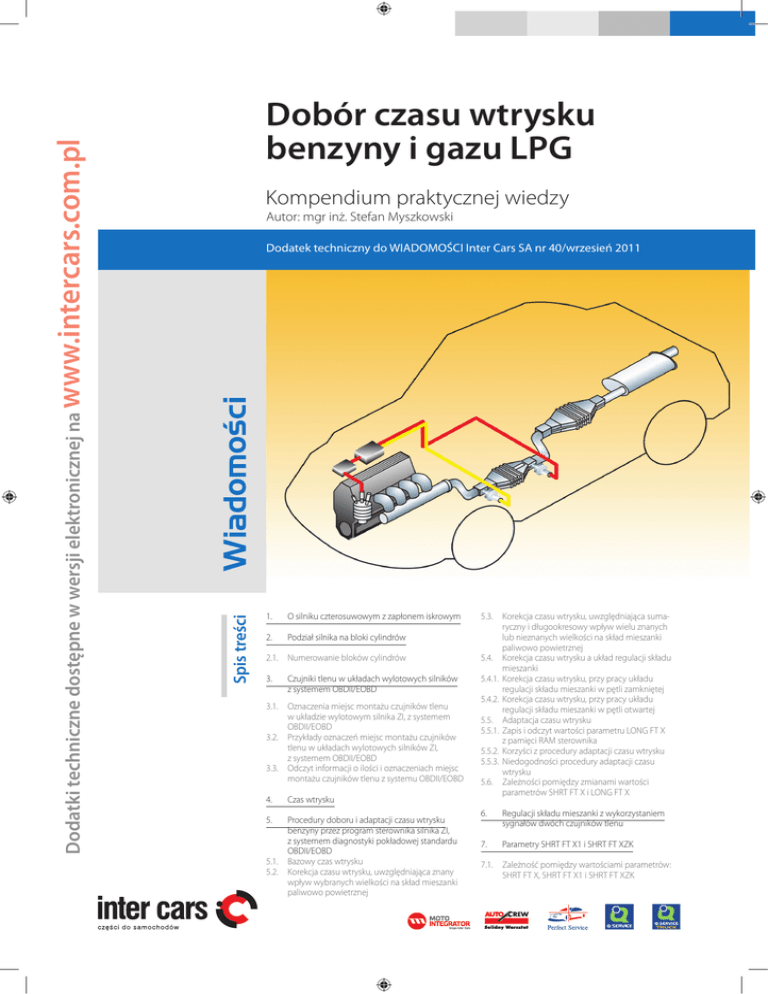 Kompendium praktycznej wiedzy Autor: mgr inż. Stefan Myszkowski Dodatek techniczny do WIADOMOŚCI Inter Cars SA nr 40/wrzesień 2011 Spis treści Dodatki techniczne dostępne w wersji elektronicznej na www.intercars.com.pl Dobór czasu wtrysku benzyny i gazu LPG 1. O silniku czterosuwowym z zapłonem iskrowym 2. Podział silnika na bloki cylindrów 2.1. Numerowanie bloków cylindrów 3. Czujniki tlenu w układach wylotowych silników z systemem OBDII/EOBD 3.1. Oznaczenia miejsc montażu czujników tlenu w układzie wylotowym silnika ZI, z systemem OBDII/EOBD 3.2. Przykłady oznaczeń miejsc montażu czujników tlenu w układach wylotowych silników ZI, z systemem OBDII/EOBD 3.3. Odczyt informacji o ilości i oznaczeniach miejsc montażu czujników tlenu z systemu OBDII/EOBD 4. 5. Czas wtrysku Procedury doboru i adaptacji czasu wtrysku benzyny przez program sterownika silnika ZI, z systemem diagnostyki pokładowej standardu OBDII/EOBD 5.1. Bazowy czas wtrysku 5.2. Korekcja czasu wtrysku, uwzględniająca znany wpływ wybranych wielkości na skład mieszanki paliwowo powietrznej 5.3. Korekcja czasu wtrysku, uwzględniająca sumaryczny i długookresowy wpływ wielu znanych lub nieznanych wielkości na skład mieszanki paliwowo powietrznej 5.4. Korekcja czasu wtrysku a układ regulacji składu mieszanki 5.4.1. Korekcja czasu wtrysku, przy pracy układu regulacji składu mieszanki w pętli zamkniętej 5.4.2. Korekcja czasu wtrysku, przy pracy układu regulacji składu mieszanki w pętli otwartej 5.5. Adaptacja czasu wtrysku 5.5.1. Zapis i odczyt wartości parametru LONG FT X z pamięci RAM sterownika 5.5.2. Korzyści z procedury adaptacji czasu wtrysku 5.5.3. Niedogodności procedury adaptacji czasu wtrysku 5.6. Zależności pomiędzy zmianami wartości parametrów SHRT FT X i LONG FT X 6. Regulacji składu mieszanki z wykorzystaniem sygnałów dwóch czujników tlenu 7. Parametry SHRT FT X1 i SHRT FT XZK 7.1. Zależność pomiędzy wartościami parametrów: SHRT FT X, SHRT FT X1 i SHRT FT XZK Dobór czasu wtrysku benzyny i gazu LPG Od autora Szanowni czytelnicy, zaczniemy od remanentu. W numerze 39/2011 „Dodatku technicznego”, na stronie 3, pod koniec podrozdziału 1.1. jest błędna zależność pomiędzy jednostkami: 1 bar = 10000 Pa ≈ 1 at Prawidłowa jest poniższa zależność pomiędzy jednostkami: 1 bar = 100000 Pa ≈ 1 at Błąd wykrył i poinformował mnie o nim Pan Bartosz Dubas. Gratuluję dociekliwości oraz spostrzegawczości. Serdecznie dziękuję za informację. Ze mojej strony przepraszam za błąd i postaram się, aby było ich jak najmniej. Innych czytelników proszę o kontakt, jeśli coś budzi wątpliwości. Teraz aktualności. W tym i w następnym „Dodatku technicznym”, tematem jest dobór czasu wtrysku benzyny dla silników ZI z systemem OBDII/EOBD. Omówimy współpracę programu sterującego silnikiem z jednym lub z dwoma czujnikami tlenu (sondami lambda) oraz współczynniki korekcyjne czasu wtrysku benzyny (ich wartości można odczytać czytnikiem OBD ze sterownika). Będzie trochę „naukowo”, ale ta wiedza jest niezbędna przy diagnostyce silników, interpretacji kodów usterek oraz parametrów „zamrożonych”. Uważam, że znajomość współczynników korekcyjnych, to klucz do diagnostyki współczesnych silników ZI. Współczynniki korekcyjne czasu wtrysku benzyny, można również wykorzystać do dopasowania układu zasilania gazem LPG (również CNG) do układu zasilania benzyną - dlaczego? Niezależnie od tego co piszą ich producenci, żaden z nich, z wyjątkiem układów montowanych przez producentów, które korzystają z danych otrzymywanych bezpośrednio z programu sterownika układu wtrysku benzyny, nie współpracuje ściśle z układem wtrysku benzyny. Jeśli układ zasilania gazem LPG pracuje, zdobywa informacje z układu zasilania benzyną drogą pośrednią, a układ zasilania benzyną nie wie, że silnik jest zasilany gazem LPG. Ważne jest więc możliwie najlepsze dopasowanie obu układów zasilania, aby „nieporozumienia” pomiędzy nimi, skutkujące rejestracją kodów usterek, występowały możliwie rzadko. Będzie to tematem części 2. Publikowany materiał jest całkowicie moim opracowaniem. Powstał na podstawie lektury różnych, często szczątkowych informacji, oraz własnych prób. Życzę cierpliwości przy lekturze. Jest on przygotowany do książki o diagnostyce silników z systemem OBDII/EOBD, która powstaje (niestety wolno). Stefan Myszkowski [email protected] Zdjęcie na okładce - czujników tlenu w układzie wylotowym silnika ZI z systemem OBDII/EOBD (Źródło: NGK/NTK) 2 Dodatek techniczny 1.O silniku czterosuwowym z zapłonem iskrowym W silnikach czterosuwowych o obecnej konstrukcji, 1 cykl pracy silnika odbywa się zawsze podczas dwóch obrotów wału korbowego (720O OWK), bez względu na ilość cylindrów. Podczas dwóch obrotów wału korbowego, w każdym z cylindrów silnika odbywa się tylko jeden suw pracy. W aktualnych konstrukcjach układów sterowania silników, podczas jednego cyklu pracy silnika, czas wtrysku ma jeszcze tę samą wartość dla wszystkich wtryskiwaczy jednego bloku cylindrów, również w tzw. układach wtrysku sekwencyjnego. Już niedługo przejdziemy jednak na indywidualną regulację czasów wtrysku dla poszczególnych cylindrów. 2.Podział silnika na bloki cylindrów Silniki z systemem diagnostyki pokładowej OBDII/EOBD, są dzielone na bloki cylindrów, nazywane w skrócie „blokami”. Podział ten nie jest podziałem konstrukcji mechanicznej silnika, ale podziałem w programie sterującym silnikiem. Silniki o ilości cylindrów do 4, mają przeważnie jeden blok cylindrów. Silniki o ilości cylindrów 6 lub większej, są dzielone przeważnie na 2 lub więcej bloków cylindrów. Silnik podzielony np. na dwa bloki cylindrów, to pod względem sterowania dwa oddzielne silniki. Poznajmy podstawowe korzyści wynikające z podziału silnika na bloki cylindrów. Jed