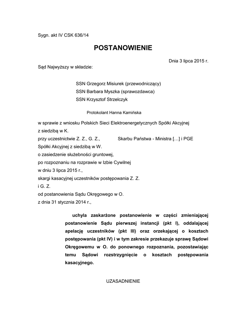 Sygn. akt IV CSK 636/14 POSTANOWIENIE Dnia 3 lipca 2015 r. Sąd Najwyższy w składzie: SSN Grzegorz Misiurek (przewodniczący) SSN Barbara Myszka (sprawozdawca) SSN Krzysztof Strzelczyk Protokolant Hanna Kamińska w sprawie z wniosku Polskich Sieci Elektroenergetycznych Spółki Akcyjnej z siedzibą w K. przy uczestnictwie Z. Z., G. Z., Skarbu Państwa - Ministra […] i PGE Spółki Akcyjnej z siedzibą w W. o zasiedzenie służebności gruntowej, po rozpoznaniu na rozprawie w Izbie Cywilnej w dniu 3 lipca 2015 r., skargi kasacyjnej uczestników postępowania Z. Z. i G. Z. od postanowienia Sądu Okręgowego w O. z dnia 31 stycznia 2014 r., uchyla zaskarżone postanowienie w części zmieniającej postanowienie Sądu pierwszej instancji (pkt I), oddalającej apelację uczestników (pkt III) oraz orzekającej o kosztach postępowania (pkt IV) i w tym zakresie przekazuje sprawę Sądowi Okręgowemu w O. do ponownego rozpoznania, pozostawiając temu Sądowi rozstrzygnięcie kasacyjnego. UZASADNIENIE o kosztach postępowania 2 Sąd Rejonowy w O. - po dwukrotnym ponownym rozpoznaniu sprawy z wniosku Polskich Sieci Elektroenergetycznych S.A. w K. przy uczestnictwie Z. Z., G. Z., Skarbu Państwa - Ministra […] oraz PGE S.A. w W. – postanowieniem z dnia 5 lipca 2013 r. stwierdził, że z dniem 1 listopada 2002 r. spółka pod firmą Polskie Sieci Elektroenergetyczne S.A. nabyła przez zasiedzenie służebność gruntową, polegającą na trwałym i nieodpłatnym korzystaniu z części nieruchomości uczestników Z. Z. i G. Z. położonych w W. i N., dla których prowadzone są księgi wieczyste nr […], nr […] i nr […], stanowiących działki oznaczone w ewidencji numerami: 157/8, 157/10, 160/29, 160/30, 160/34, 160/46, 160/23, 160/25, 160/26, 160/27, 160/37, 160/36, 260/17, 260/27 i 260/28, oznaczonych kolorem żółtym w opinii biegłego J.K., stanowiącej integralną część postanowienia, dla potrzeb używania posadowionych na nich urządzeń elektroenergetycznych tworzących linię o napięciu 220 kV relacji O. 1 – O. przez zapewnienie prawa nieustannego przesyłu energii elektrycznej, dostępu, przechodu i przejazdu w celu eksploatacji, konserwacji, naprawy, modernizacji, remontów oraz usuwania awarii. Ustalił, że uczestnicy Z. i G. małż. Z., na podstawie umowy sprzedaży z dnia 18 lipca 1997 r., nabyli od spadkobierców P. L., nieruchomość położoną w N., składającą się z działek oznaczonych w ewidencji numerami 157/8, 157/9 i 157/10, objętą księgą wieczystą nr […], nieruchomość położoną w W., składającą się z działek oznaczonych w ewidencji numerami 260/17, 260/27, 260/28, 160/28, 160/29, 160/30, 160/34, 160/45 i 160/46, objętą księgą wieczystą nr […] oraz nieruchomość położoną również w W., składającą się z działek oznaczonych w ewidencji numerami 160/23, 160/24, 160/25, 160/26, 160/27, 160/36, 160/37 i 160/41, objętą księgą wieczystą nr […]. Decyzją z dnia 1 marca 1971 r. Prezydium Powiatowej Rady Narodowej w S. zezwoliło na wybudowanie linii elektroenergetycznej 220 kV relacji O. – O., biegnącej przez tereny gromad D., O. i S., w celu powiązania z siecią elektroenergetyczną budowanej elektrowni w O. i zapewnienia zasilania w energię elektryczną północnych rejonów Polski, należących do Zakładów Energetycznych Okręgu P. Decyzją z dnia 15 marca 1971 r. Prezydium Wojewódzkiej Rady Narodowej w W. zatwierdziło plan realizacyjny trasy projektowanej linii, a decyzją z 3 dnia 2 kwietnia 1971 r. Prezydium Powiatowej Rady Narodowej w O. zezwoliło na jej wybudowanie przez Zakłady Energetyczne Okręgu C. Biuro Budowy Sieci Najwyższych Napięć w Ł. Napowietrzna linia energetyczna miała przebiegać m.in. przez grunty P. L., będącego wówczas właścicielem nieruchomości należących obecnie do uczestników Z. i G. małż. Z. Linia elektroenergetyczna napowietrzna jednotorowa relacji O.- O. została oddana do eksploatacji w dniu 6 października 1972 r., w dniu tym podpisano protokół odbioru technicznego. Linia ta przebiega przez należące do małż. Z. działki gruntu o numerach ewidencyjnych 157/8, 157/10, 160/29, 160/30, 160/34, 160/46, 160/23, 160/25, 160/26, 160/27, 160/37, 160/36, 260/17, 260/27 i 260/28, co powoduje wyłączenie z użytkowania 15 314,52 m2 ich powierzchni. Obecnie linia energetyczna O. – O. jest eksploatowana przez Polskie Sieci Elektroenergetyczne S.A. w K. Od 1972 r. była eksploatowana w części przez P. Okręg Energetyczny, a w części przez C.Okręg Energetyczny. W czasie jej eksploatacji były prowadzone prace konserwacyjne i remontowe, polegające na oględzinach z ziemi lub z powietrza, usuwaniu usterek, zwłaszcza uzupełnieniu kątowników, konserwacji fundamentów, wymianie uszkodzonych izolatorów oraz na okresowej wycince zadrzewienia i krzewów z pasa linii. W 2000 roku został wymieniony przewód odgromowy na światłowód i dokonano konserwacji uziemień oraz fundamentów, a w latach 2007 – 2010 wymieniano izolację w przęsłach skrzyżowaniowych. Zgodnie z zarządzeniem nr 16 z dnia 12 sierpnia 1975 r. Naczelnego Dyrektora Zjednoczenia Energetyki w sprawie dostosowania terenowej organizacji energetyki do podziału administracyjnego państwa, Zakład Energetyczny w O. rozpoczął działanie obejmując obszar na pełnym wewnętrznym rozrachunku ówczesnego województwa […].; gospodarczym, w skład powstałego przedsiębiorstwa weszła przedmiotowa linia elektroenergetyczna. W wyniku podziału przedsiębiorstwa państwowego pod nazwą P. Okręg Energetyczny w B., dokonanego na podstawie zarządzenia z dnia 30 grudnia 1989 r. nr 57 Prezesa Rady Ministrów, utworzono na bazie Zakładu Energetycznego w przedsiębiorstwo państwowe pod nazwą Zakład Energetyczny O. z siedzibą w O. O. 4 Zarządzeniem z dnia 9 lipca 1993 r. nr […] Ministra Przemysłu i Handlu w sprawie podziału przedsiębiorstwa państwowego pod nazwą Zakład Energetyczny O. w O. w jedn