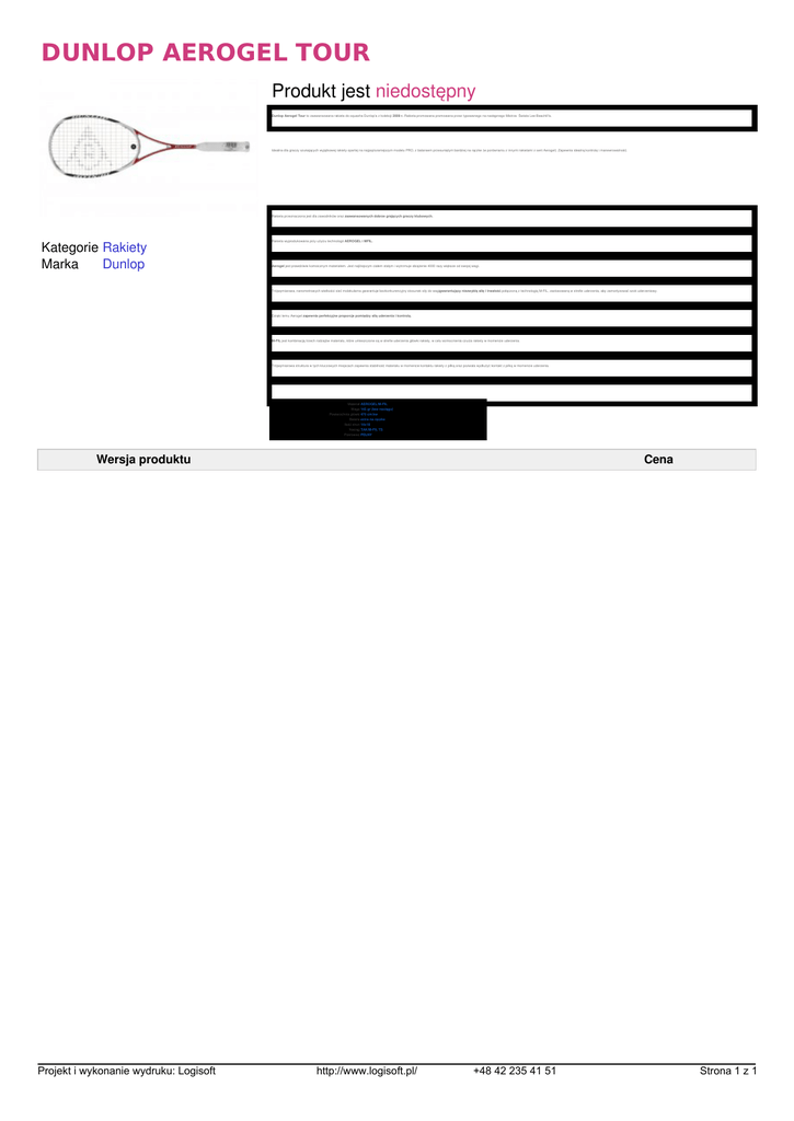 DUNLOP AEROGEL TOUR Produkt jest niedostępny Dunlop Aerogel Tour to zaawansowana rakieta do squasha Dunlop'a z kolekcji 2009 r. Rakieta promowana promowana przez typowanego na następnego Mistrza Świata Lee Beachill'a. Idealna dla graczy szukających wyjątkowej rakiety opartej na najpopluraniejszym modelu PRO, z balansem przesuniętym bardziej na rączke (w porównaniu z innymi rakietami z serii Aerogel). Zapewnia idealną kontrolę i manewrowalność. Rakieta przeznaczona jest dla zawodników oraz zaawansowanych dobrze grających graczy klubowych. Kategorie Rakiety Marka Dunlop Rakieta wyprodukowana przy użyciu technologii AEROGEL i MFIL. Aerogel jest prawdziwie komsicznym materiałem. Jest najlżejszym ciałem stałym i wytrzmuje obiążenie 4000 razy większe od swojej wagi. Trójwymiarowa, nanometrowych wielkości sieć molekularna gwarantuje bezkonkurencyjny stosunek siły do wagigwarantujący niezwykłą siłę i trwałość połączoną z technologią M-FIL, zastosowaną w strefie uderzenia, aby zamortyzować szok uderzeniowy. Dzięki temu Aerogel zapewnia perfekcyjne proporcje pomiędzy siłą uderzenia i kontrolą. M-FIL jest kombinacją trzech rodzajów materiału, które umieszczone są w strefie uderzenia główki rakiety, w celu wzmocnienia czucia rakiety w momencie uderzenia. Trójwymiarowa struktura w tych kluczowych miejscach zapewnia stabilność materiału w momencie kontaktu rakiety z piłką oraz pozwala wydłużyć kontakt z piłką w momencie uderzenia. Materiał AEROGEL/M-FIL Waga 145 gr (bez naciągu) Powierzchnia główki 470 cm kw Balans extra na rączke Ilość strun 14x18 Naciąg TAK/M-FIL TS Pokrowiec PEŁNY Wersja produktu Projekt i wykonanie wydruku: Logisoft Powered by TCPDF (www.tcpdf.org) Cena http://www.logisoft.pl/ +48 42 235 41 51 Strona 1 z 1