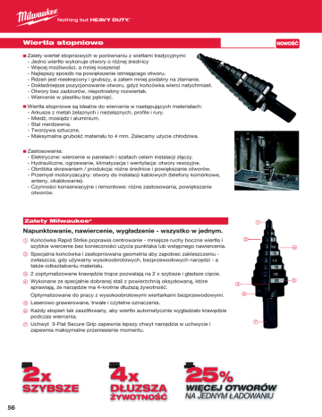 Wiertła stopniowe NOWOŚĆ ■ Zalety wierteł stopniowych w porównaniu z wietłami tradycyjnymi: - Jedno wiertło wykonuje otwory o różnej średnicy - Więcej możliwości, a mniej noszenia! - Najlepszy sposób na powiększenie istniejącego otworu. - Rdzeń jest nieskręcony i grubszy, a zatem mniej podatny na złamanie. - Dokładniejsze pozycjonowanie otworu, gdyż końcówka wierci natychmiast. - Otwory bez zadziorów, niepotrzebny rozwiertak. - Wiercenie w plastiku bez pęknięć. ■ Wiertła stopniowe są idealne do wiercenia w następujących materiałach: - Arkusze z metali żelaznych i nieżelaznych, profile i rury. - Miedź, mosiądz i aluminium. - Stal nierdzewna. - Tworzywa sztuczne. - Maksymalna grubość materiału to 4 mm. Zalecamy użycie chłodziwa. ■ Zastosowania: - Elektryczne: wiercenie w panelach i szafach celem instalacji złączy. - Hydrauliczne, ogrzewanie, klimatyzacja i wentylacja: otwory rewizyjne. - Obróbka skrawaniem / produkcja: różne średnice i powiększanie otworów. - Przemysł motoryzacyjny: otwory do instalacji kablowych (telefony komórkowe, anteny, okablowanie). - Czynności konserwacyjne i remontowe: różne zastosowania, powiększanie otworów. Zalety Milwaukee® a Napunktowanie, nawiercenie, wygładzenie - wszystko w jednym. a Końcówka Rapid Strike poprawia centrowanie - mniejsze ruchy boczne wiertła i b szybkie wiercenie bez konieczności użycia punktaka lub wstępnego nawiercenia. # b Specjalna końcówka i zestopniowana geometria aby zapobiec zakleszczeniu - zwłaszcza, gdy używamy wysokoobrotowych, bezprzewodowych narzędzi - a także odkształceniu materiału. 2 zoptymalizowane krawędzie tnące pozwalają na 2 x szybsze i gładsze cięcie. $ ! Wykonane ze specjalnie dobranej stali z powierzchnią oksydowaną, które sprawiają, że narzędzie ma 4-krotnie dłuższą żywotność. Optymalizowane do pracy z wysokoobrotowymi wiertarkami bezprzewodowymi. ! $ Laserowo grawerowane, trwałe i czytelne oznaczenia. # Każdy stopień tak zaszlifowany, aby wiertło automatycznie wygładzało krawędzie podczas wiercenia. " Uchwyt 3-Flat Secure Grip zapewnia lepszy chwyt narzędzia w uchwycie i " zapewnia maksymalne przeniesienie momentu. DO 2x SZYBSZE 56 DO DO ŻYWOTNOŚĆ WIĘCEJ OTWORÓW NA JEDNYM ŁADOWANIU 4 x 25 % DŁUZSZA milwaukeetool.pl Ilość w opakowaniu Numer Artykułu Kod EAN Sugerowana cena netto zł 68 9 1 48899321 045242364060 329,00 92 13 1 48899332 045242344437 329,00 65 9 1 48899301 045242342532 129,00 Średnica chwytu (mm) Całkowita długość (mm) PG 7 - PG 21 10 M 6 - M 32 10 4 - 12 mm / 1˝ 6 4 - 12 mm / 2˝ 6 65 5 1 48899302 045242342549 129,00 4 - 20 mm 8 65 9 1 48899320 045242344406 179,00 6 - 35 mm 10 90 14 1 48899335 045242344413 299,00 3 48899399 045242344420 549,00 Zestaw 3 wierteł stopniowych, wiertła nr 3, 5, 6. a # b Ø mm 4 5 6 6,5 8 9 10 11 12 Ø mm Ø mm 6 9 12,5 PG7 15,2 PG9 18,6 PG11 20,4 PG13,5 22,5 PG16 25,5 28,3 PG21 6,5 M6 8,5 M8 M10 10,5 M10 M12 68 mm 12,5 M12 14,5 M16 16,5 M16 18,5 M20 23,5 92 mm 20,5 M20 M25 25,5 M25 28,5 30,5 Ø 10 mm M32 32,5 M32 Ø 6 mm Przewiercenie otworu Gwintowanie otworu " Ø mm 4 Ø mm 4 6 8 10 12 14 16 18 20 8 10 65 mm 6 12 Ø 6 mm Ø 10 mm $ 65 mm ! 65 mm a b # ! " $ Liczba kroków Opis Ø 8 mm 57