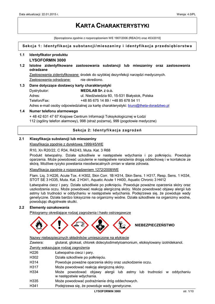 Data aktualizacji: 22.01.2015 r. Wersja: 4.0/PL KART A CHARAKTERYSTYKI [Sporządzona zgodnie z rozporządzeniem WE 1907/2006 (REACH) oraz 453/2010] Sekcj a 1: Id entyfikacja substancji/ mieszaniny i identyfi kacj a przedsi ębiorstw a 1.1 Identyfikator produktu LYSOFORMIN 3000 1.2 Istotne zidentyfikowane zastosowania substancji lub mieszaniny oraz zastosowania odradzane Zastosowania zidentyfikowane: środek do szybkiej dezynfekcji narzędzi medycznych. Zastosowania odradzane: nie określono. 1.3 Dane dotyczące dostawcy karty charakterystyki Dystrybutor: MEDILAB SP. Z O.O. Adres: ul. Niedźwiedzia 60, 15-531 Białystok, Polska Telefon/Fax: +48 85 675 14 89 / +48 85 678 54 11 Adres e-mail osoby odpowiedzialnej za kartę charakterystyki: [email protected] 1.4 Numer telefonu alarmowego + 48 42 631 47 67 Krajowe Centrum Informacji Toksykologicznej w Łodzi 112 (ogólny telefon alarmowy), 998 (straż pożarna), 999 (pogotowie medyczne) Sekcj a 2: I d e n t y f i k a c j a z a g r o ż e ń 2.1 Klasyfikacja substancji lub mieszaniny Klasyfikacja zgodnie z dyrektywą 1999/45/WE R10, Xn R20/22, C R34, R42/43, Muta. Kat. 3 R68 Produkt łatwopalny. Działa szkodliwie w następstwie wdychania i po połknięciu. Powoduje oparzenia. Może powodować uczulenie w następstwie narażenia drogą oddechową i w kontakcie ze skórą. Możliwe ryzyko powstania nieodwracalnych zmian w stanie zdrowia. Klasyfikacja zgodnie z rozporządzeniem 1272/2008/WE Flam. Liq. 3 H226, Acute Tox. 4 H302, Skin Corr. 1B H314, Skin Sens. 1 H317, Resp. Sens. 1 H334, STOT SE 3 H335, Muta. Kat. 2 H341, Aquatic Acute 1 H400, Aquatic Chronic 3 H412 Łatwopalna ciecz i pary. Działa szkodliwie po połknięciu. Powoduje poważne oparzenia skóry oraz uszkodzenia oczu. Może powodować reakcję alergiczną skóry. Może powodować objawy alergii lub astmy lub trudności w oddychaniu w następstwie wdychania. Podejrzewa się, że powoduje wady genetyczne. Działa bardzo toksycznie na organizmy wodne. Działa szkodliwie na organizmy wodne, powodując długotrwałe skutki. 2.2 Elementy oznakowania Piktogramy określające rodzaj zagrożenia i hasło ostrzegawcze NIEBEZPIECZEŃSTWO Nazwy niebezpiecznych składników umieszczone na etykiecie Zawiera: glutaral, glioksal, chlorek didecylodimetyloamonium, etoksylowany izotridekanol. Zwroty wskazujące rodzaj zagrożenia H226 Łatwopalna ciecz i pary. H302 Działa szkodliwie po połknięciu. H314 Powoduje poważne oparzenia skóry oraz uszkodzenie oczu. H317 Może powodować reakcję alergiczną skóry. H334 Może powodować objawy alergii lub astmy lub trudności w oddychaniu w następstwie wdychania. H335 Może powodować podrażnienie dróg oddechowych. H341 Podejrzewa się, że powoduje wady genetyczne. LYSOFORMIN 3000 str. 1/10 Data aktualizacji: 22.01.2015 r. Wersja: 4.0/PL KART A CHARAKTERYSTYKI H410 2.3 Działa bardzo toksycznie na organizmy wodne, powodując długotrwałe skutki. Zwroty wskazujące środki ostrożności P210 Przechowywać z dala od źródeł ciepła, gorących powierzchni, źródeł iskrzenia, otwartego ognia i innych źródeł zapłonu. Nie palić. P233 Przechowywać pojemnik szczelnie zamknięty. P271 Stosować wyłącznie na zewnątrz lub w dobrze wentylowanym pomieszczeniu. P273 Unikać uwolnienia do środowiska. P280 Stosować rękawice ochronne/ochronę oczu. P305+P351+P338 W PRZYPADKU DOSTANIA SIĘ DO OCZU: Ostrożnie płukać wodą przez kilka minut. Wyjąć soczewki kontaktowe, jeżeli są i można je łatwo usunąć. Nadal płukać. P303+P361+P353 W PRZYPADKU KONTAKTU ZE SKÓRĄ (lub z włosami): Natychmiast zdjąć całą zanieczyszczoną odzież. Spłukać skórę pod strumieniem wody/prysznicem. P310 Natychmiast skontaktować się z lekarzem. Inne zagrożenia Komponenty nie spełniają kryteriów PBT lub vPvB zgodnie z załącznikiem XIII rozporządzenia REACH. Sekcj a 3: 3.1 3.2 Skład/info rmacj a o skł adnikach Substancje Nie dotyczy. Mieszaniny chlorek didecylodimetyloamonium Zakres stężeń: Numer CAS: Numer WE: Numer indeksowy: Numer rejestracji właściwej: Klasyfikacja wg 67/548/EWG: Klasyfikacja wg 1272/2008/WE: 8-11% 7173-51-5 230-525-2 612-131-00-6 substancja podlega przepisom okresu przejściowego Xn R22, C R34 Acute Tox. 4 H302, Skin Corr.1B H314, Aquatic Acute 1 H400 (M=10), Aquatic Chronic 2 H411 glutaral Zakres stężeń: Numer CAS: Numer WE: Numer indeksowy: Numer rejestracji właściwej: Klasyfikacja wg 67/548/EWG: Klasyfikacja wg 1272/2008/WE: 9-10% 111-30-8 203-856-5 605-022-00-X 01-2119455549-26-XXXX T R23/25; C R34; R42/43; N R50 Acute Tox. 3 H331; Acute Tox. 3 H301; Skin Corr. 1B H314; Resp. Sens. 1 H334; Skin Sens. 1 H317; Aquatic Acute 1 H400 Substancja z określoną na poziomie krajowym wartością najwyższego dopuszczalnego stężenia w środowisku pracy. glioksal Zakres stężeń: Numer CAS: Numer WE: Numer indeksowy: Numer rejestracji właściwej: Klasyfikacja wg 67/548/EWG: Klasyfikacja wg 1272/2008/WE: 7-8% 107-22-2 203-474-9 605-016-00-7 01-2119461733-37-XXXX Muta. Kat.3 R68; Xn R20; Xi R36/38; R43 Muta. 2 H341; Acute Tox. 4 H332; Eye Irrit. 2 H319; Skin Irrit. 2 H315; Skin Sens. 1 H317 LYSOFORMIN 3000 str. 2/10 Data aktualizacji: 22.01.2015 r. Wersja: 4.0/PL KART A CHARAKTERYSTYKI etoksylowany izotridekanol Zakres stężeń: Numer CAS: Numer WE: Numer indeksowy: Numer rejestracji właściwej: Klasyfikacja wg 67/548/EWG: Klasyfikacja wg 1272/2008/WE: 5-9% 69011-36-5 500-241-6 substancja podlega przepisom okresu przejściowego Xn R22; Xi R41 Acute Tox. 4 H302; Eye Dam 1 H318 propan-2-ol Zakres stężeń: < 3% Numer CAS: 67-63-0 Numer WE: 200-661-7 Numer indeksowy: 603-117-00-0 Numer rejestracji właściwej: 01-2119457558-25-XXXX Klasyfikacja wg 67/548/EWG: F R11, Xi R36, R67 Klasyfikacja wg 1272/2008/WE: Flam. Liq. 2 H225, Eye Irrit. 2 H319, STOT SE 3 H336 Substancja z określoną na poziomie krajowym wartością najwyższego dopuszczalnego stężenia w środowisku pracy. Skład zgodnie z rozporządzeniem o detergentach 